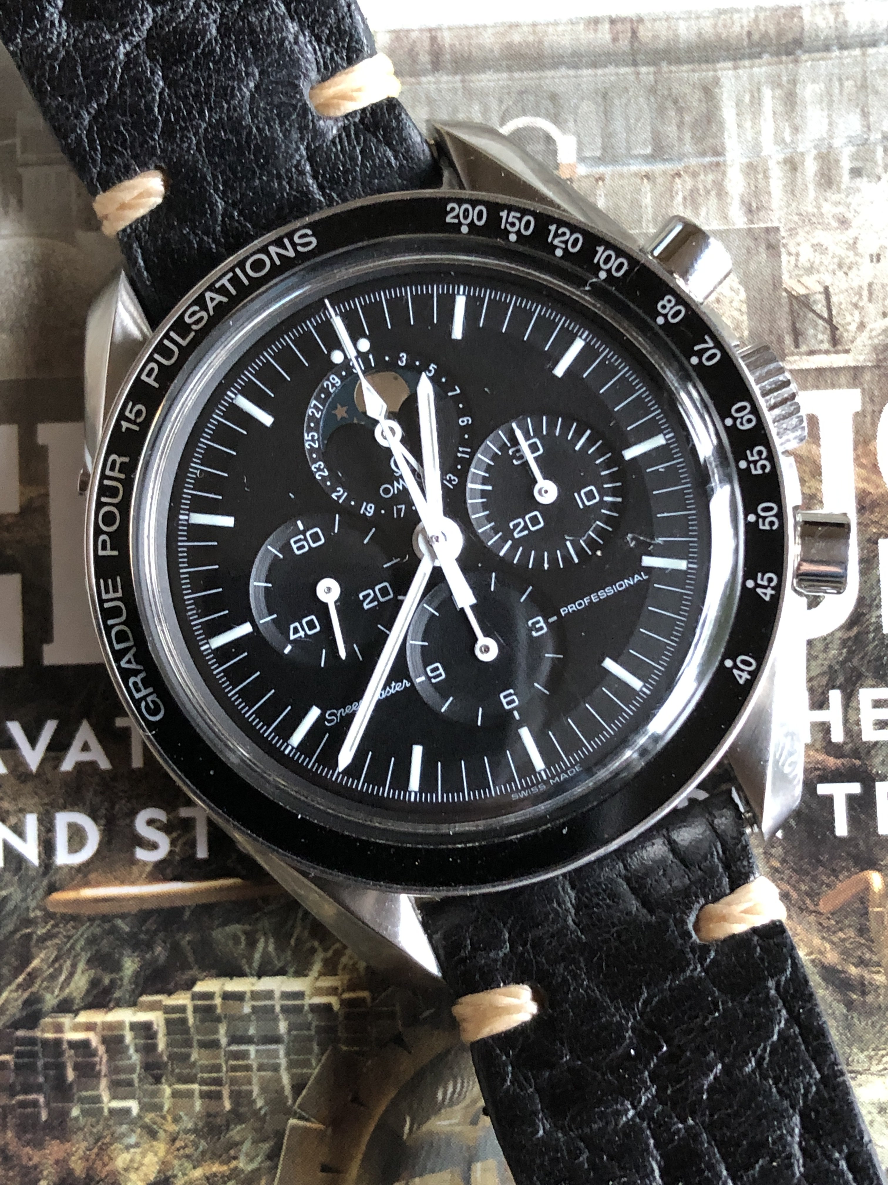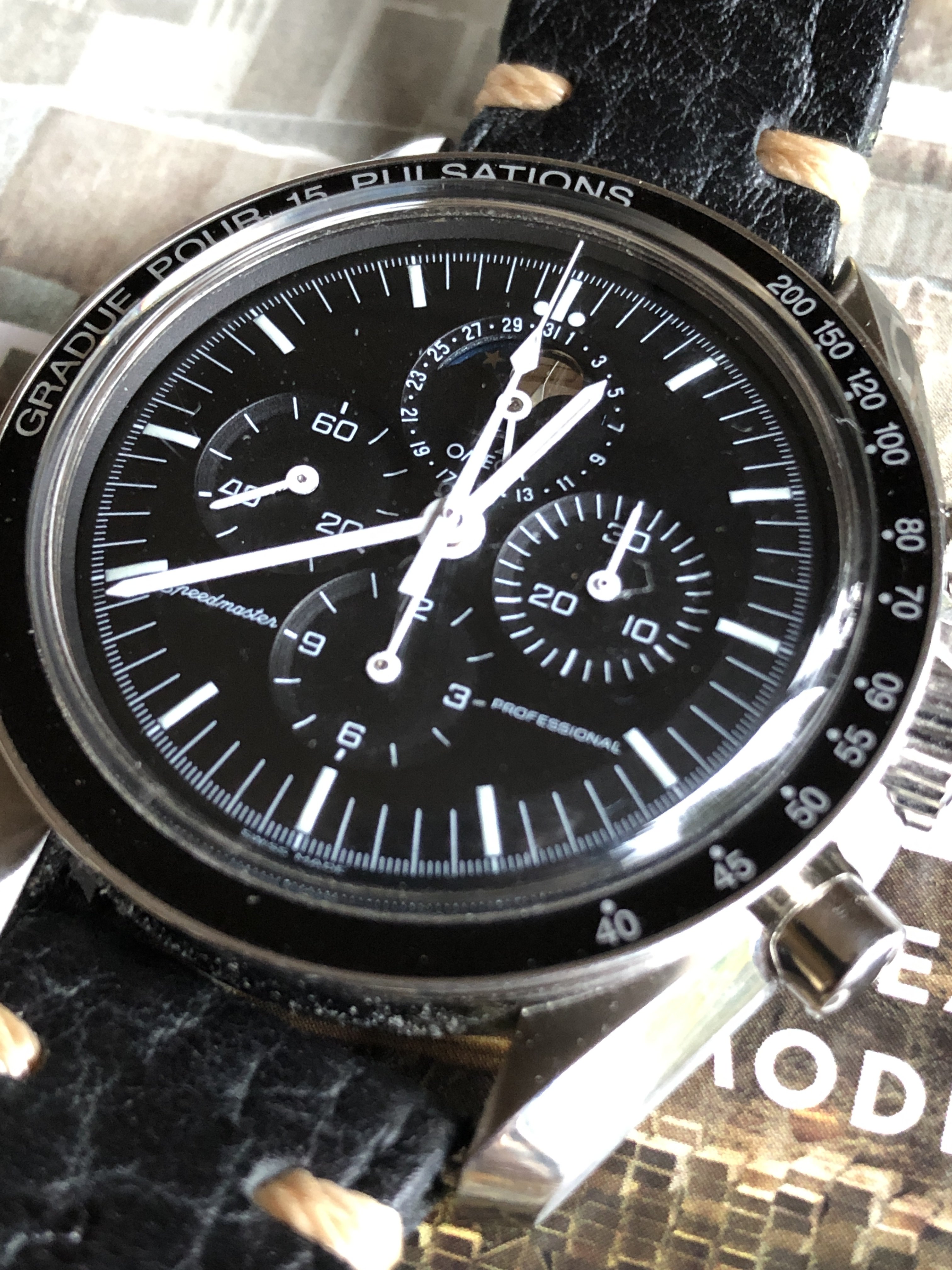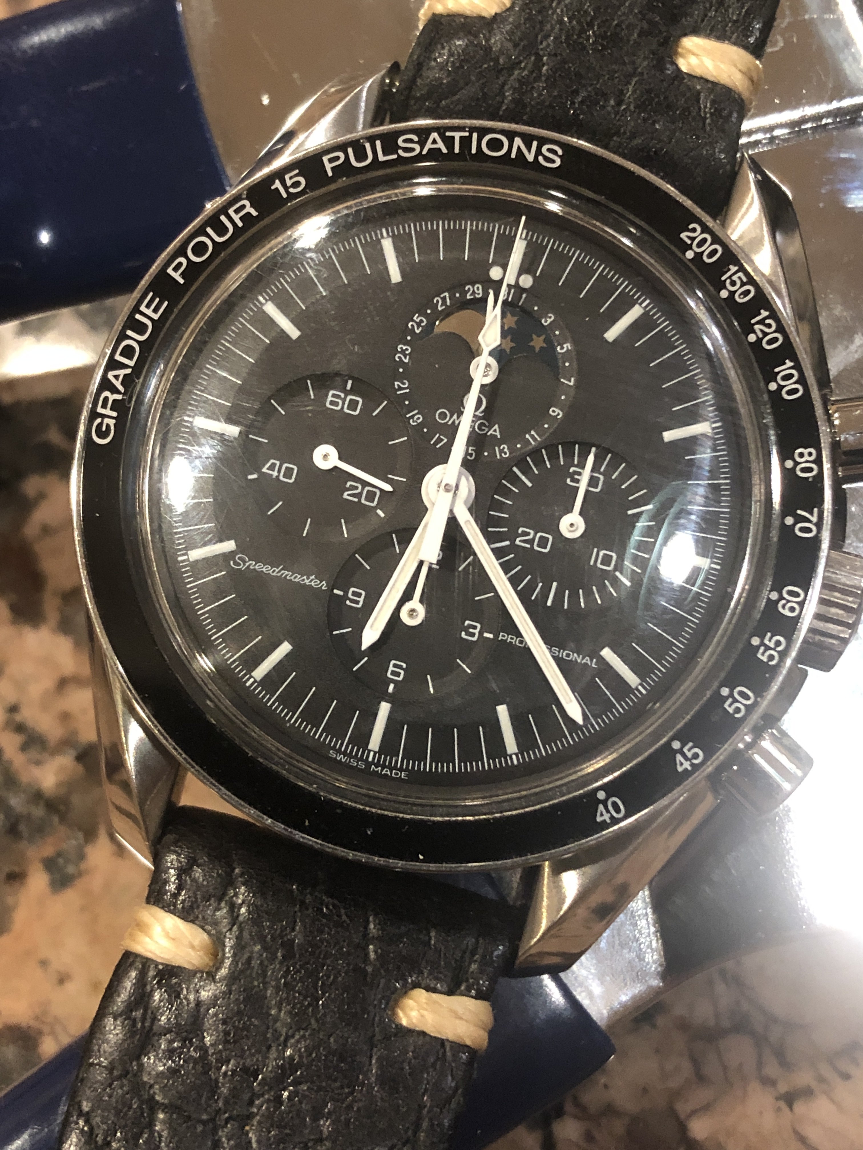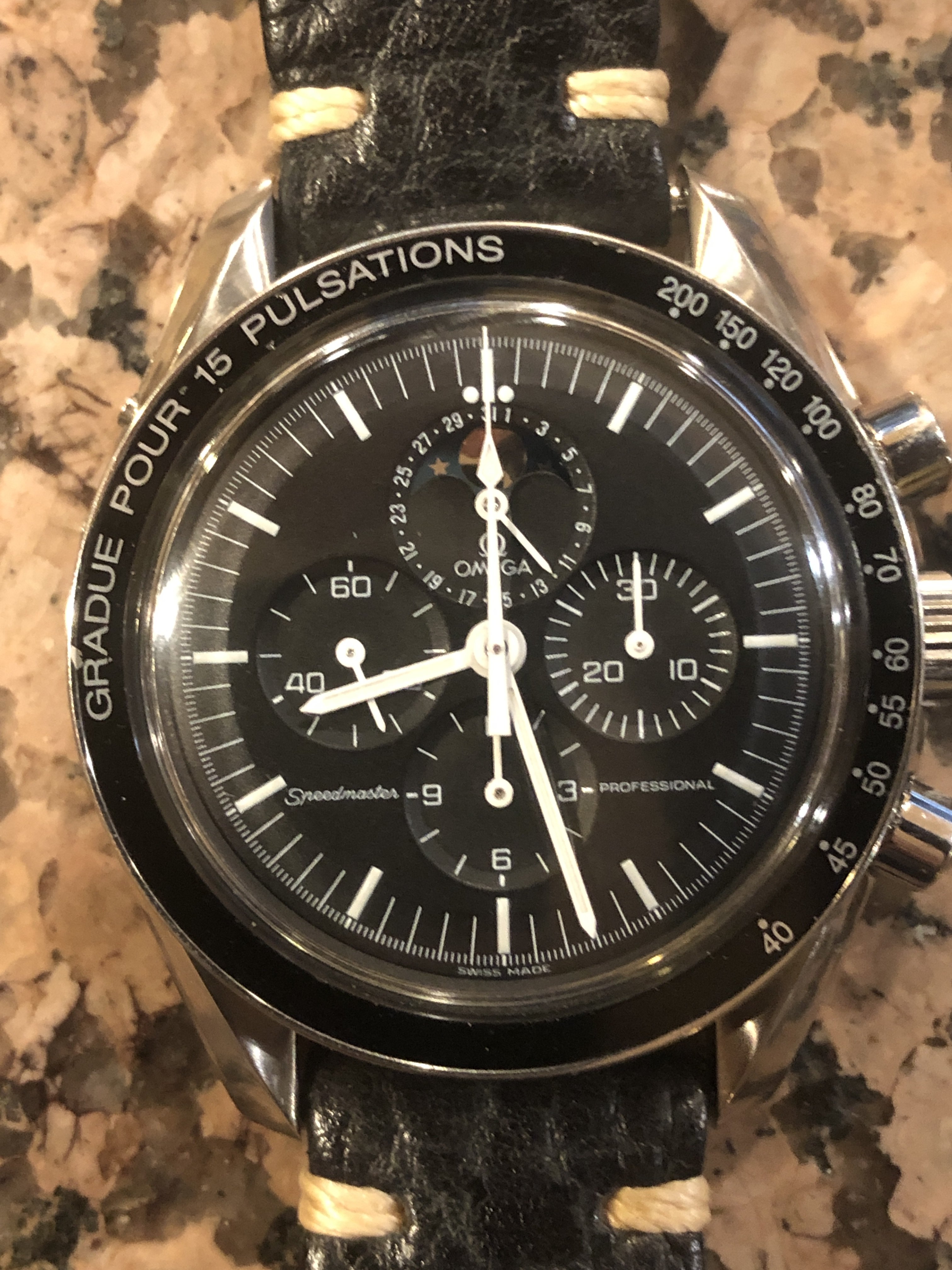 With an OEM pulse meter bezel and sapphire case back, built on a 3675.50.00 base. Effectively a 145.0809 powered by a 1866 movement. Acrylic crystal, no ring dial.
