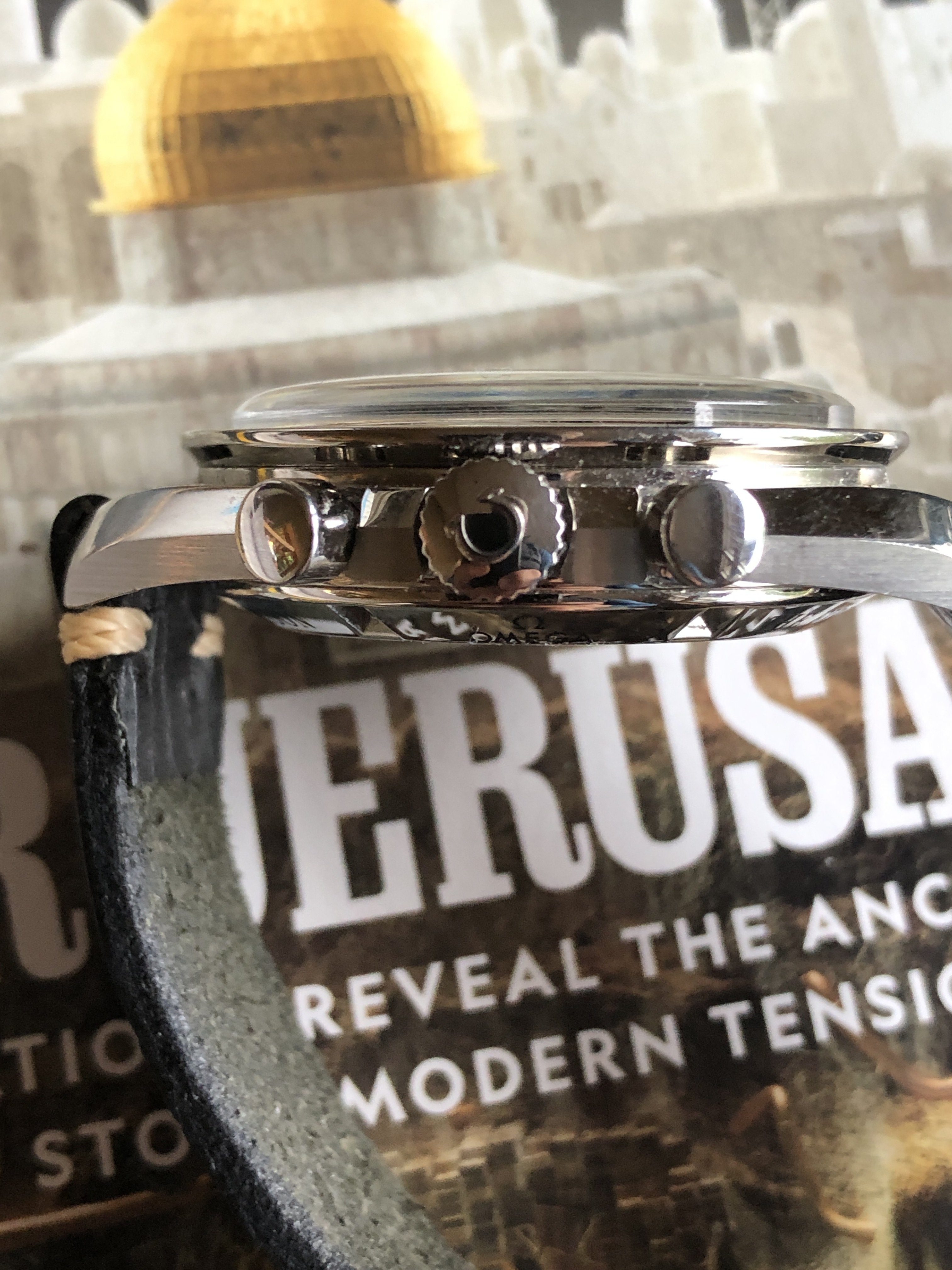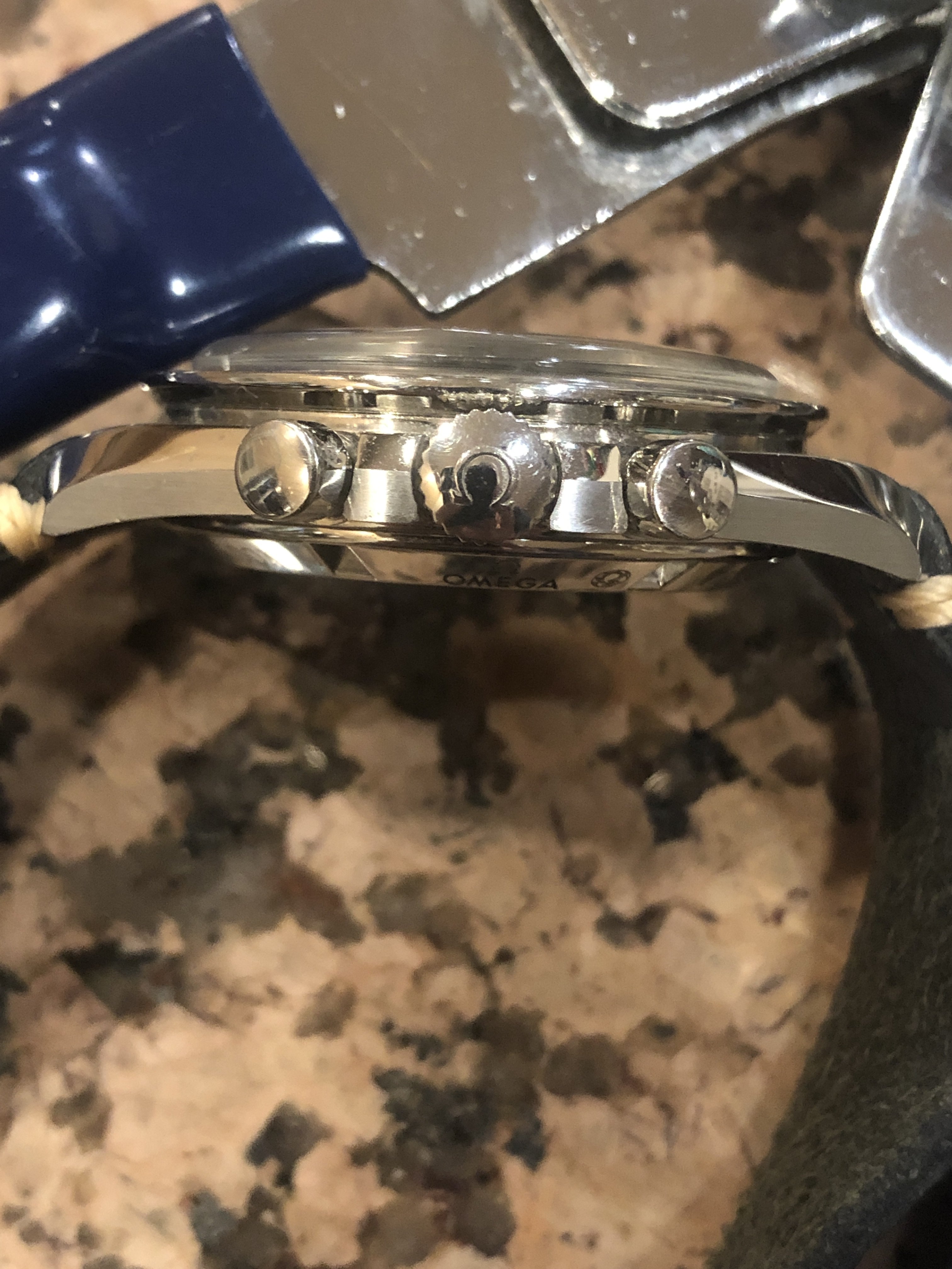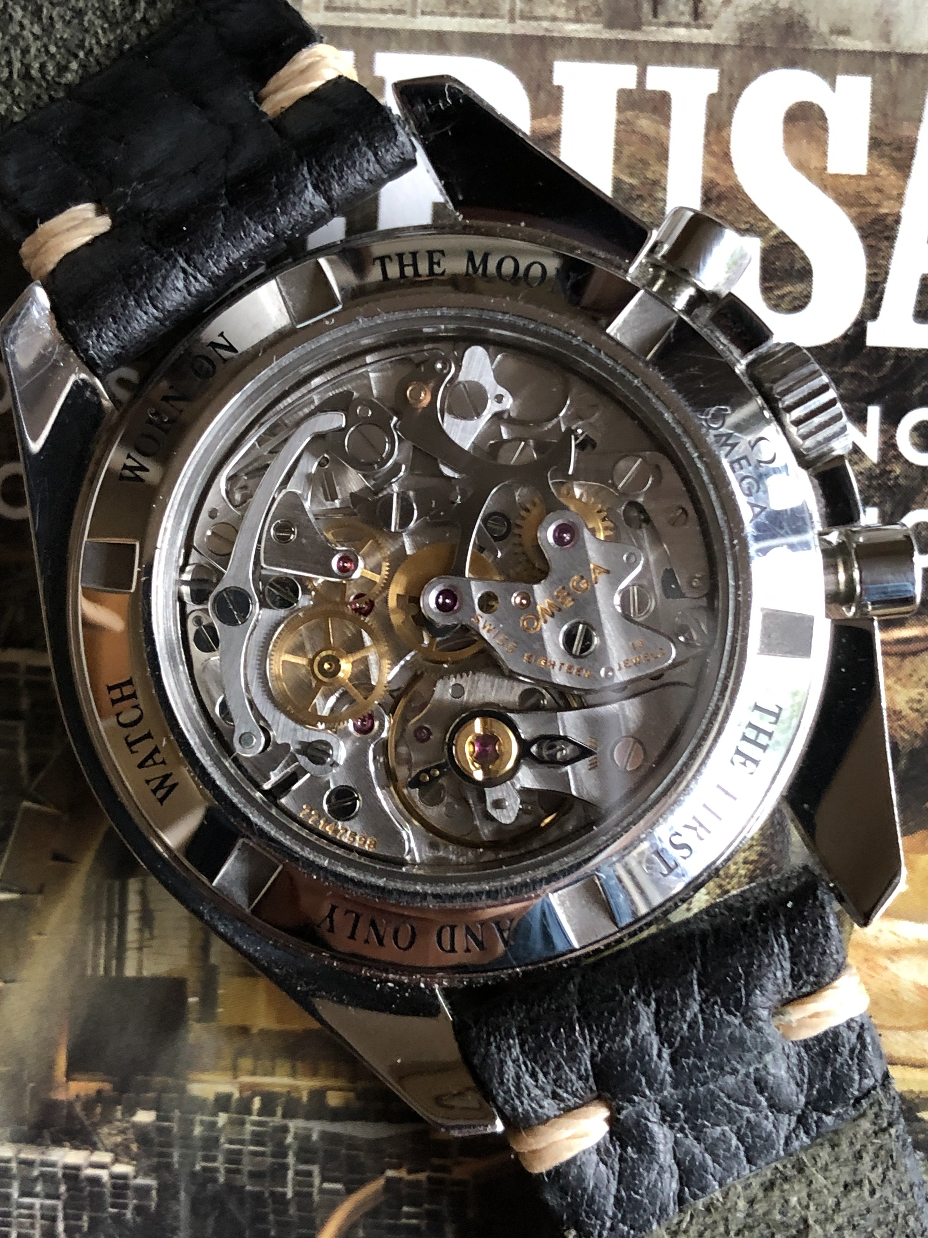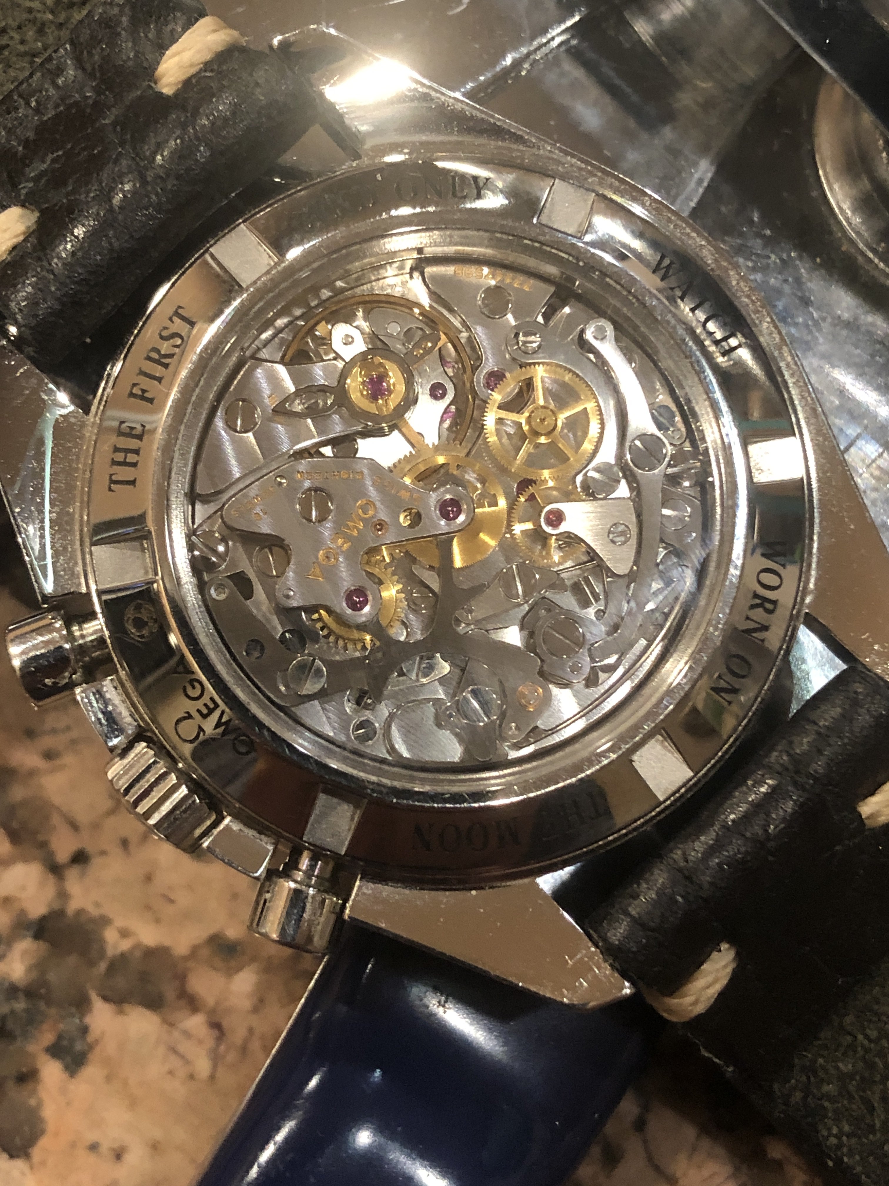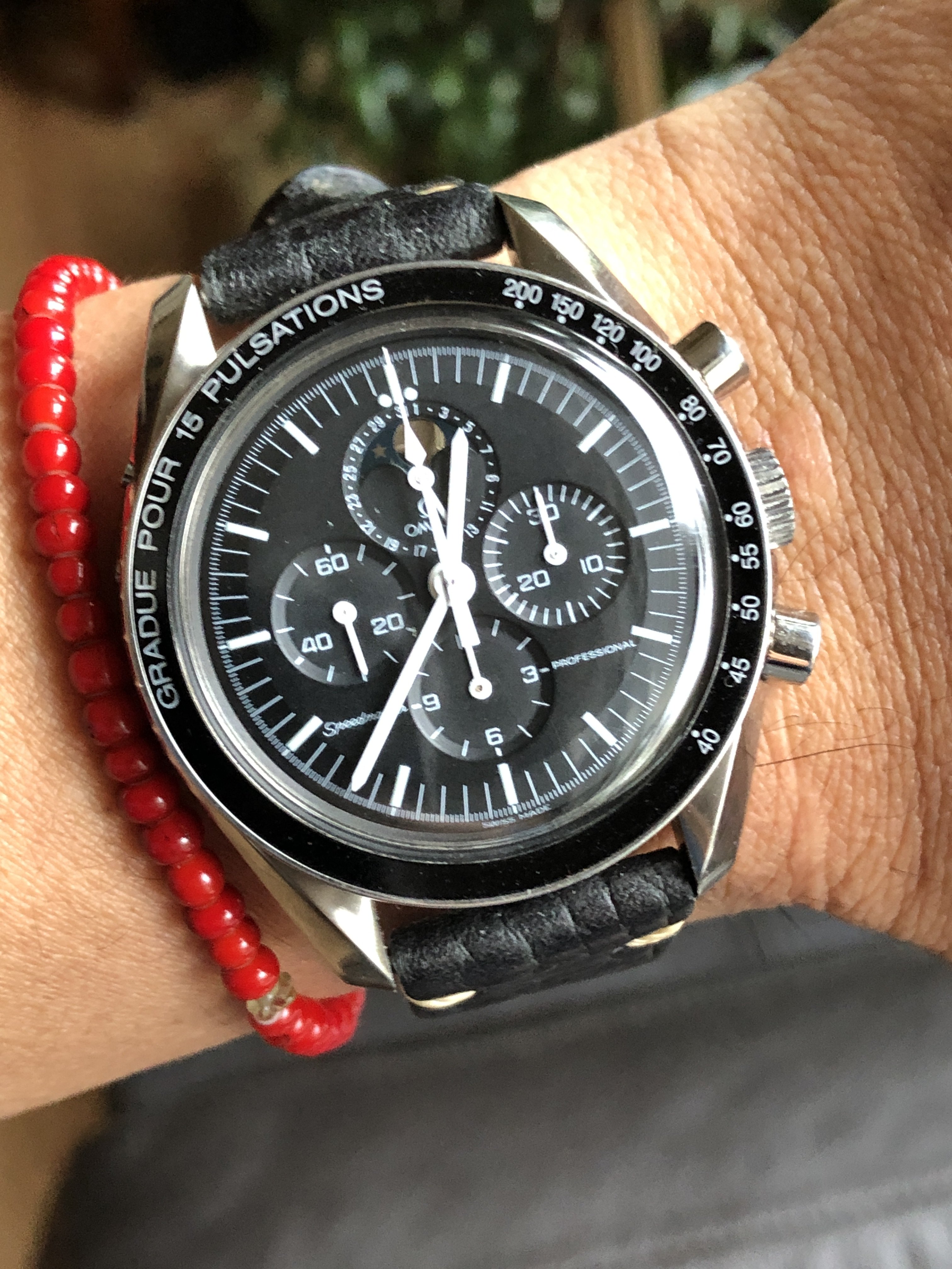 With an OEM pulse meter bezel and sapphire case back, built on a 3675.50.00 base. Effectively a 145.0809 powered by a 1866 movement. Acrylic crystal, no ring dial.