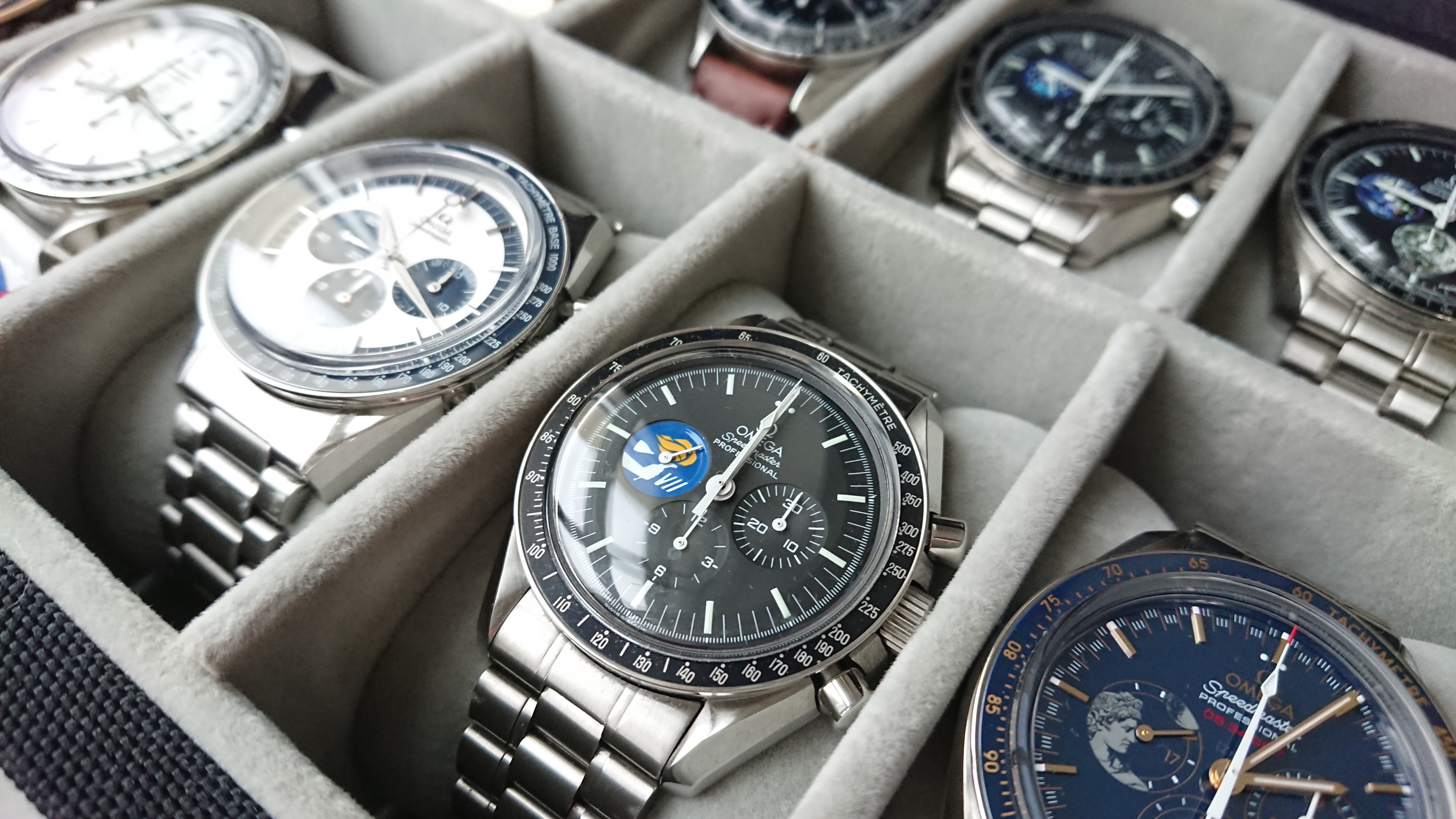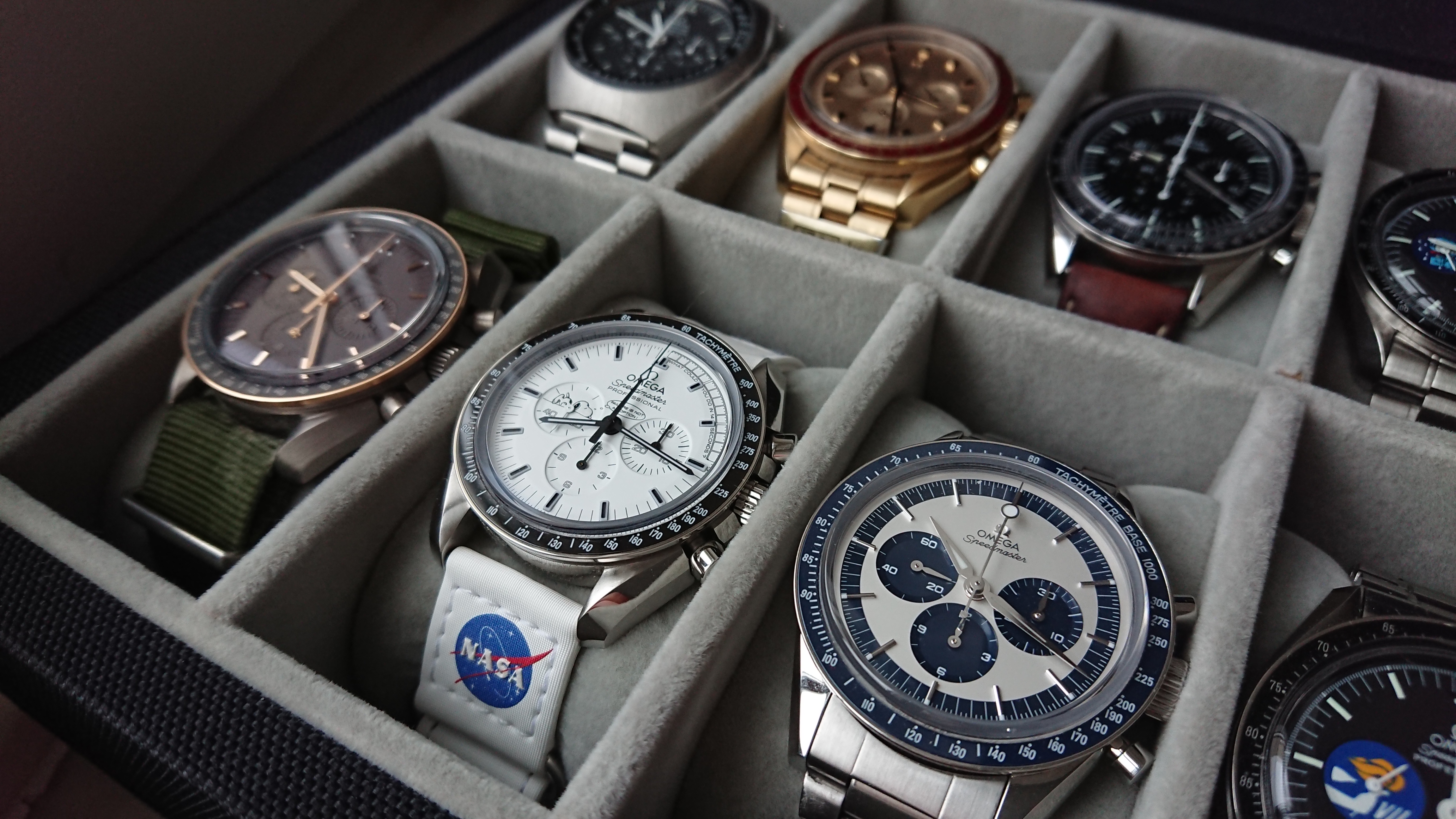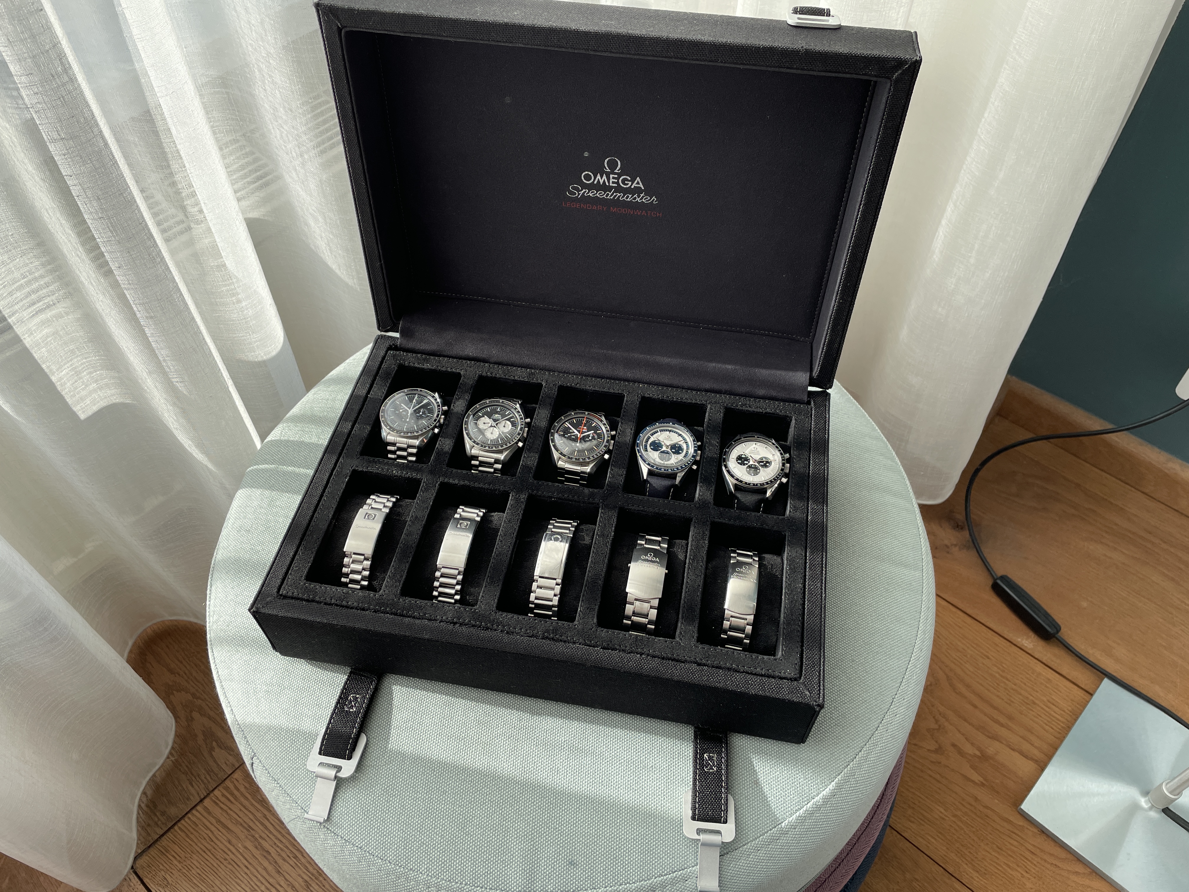 The quality of the MisterChrono tray is very good, feels very solid and is very heavy. The cushions are large and the depth of each tray compartment is sufficient. A Speedmaster on a strap or a bracelet will not stick out. A 42mm Speedmaster is a tight fit though, so larger Speedmasters will not fit probably. It comes with a large soft cover which you can put on top of the tray, for maximum protection. By the way, my wrists are 18 cm and my Speedmasters on bracelet were a very tight fit around the cushion, so keep this in mind. If you have smaller wrists, be sure to order smaller ones. Update: Pierre-Yves of MisterChrono contacted me today (13 feb) that he will deliver another set of bespoke watch cushions, made to my specifications. Great service!