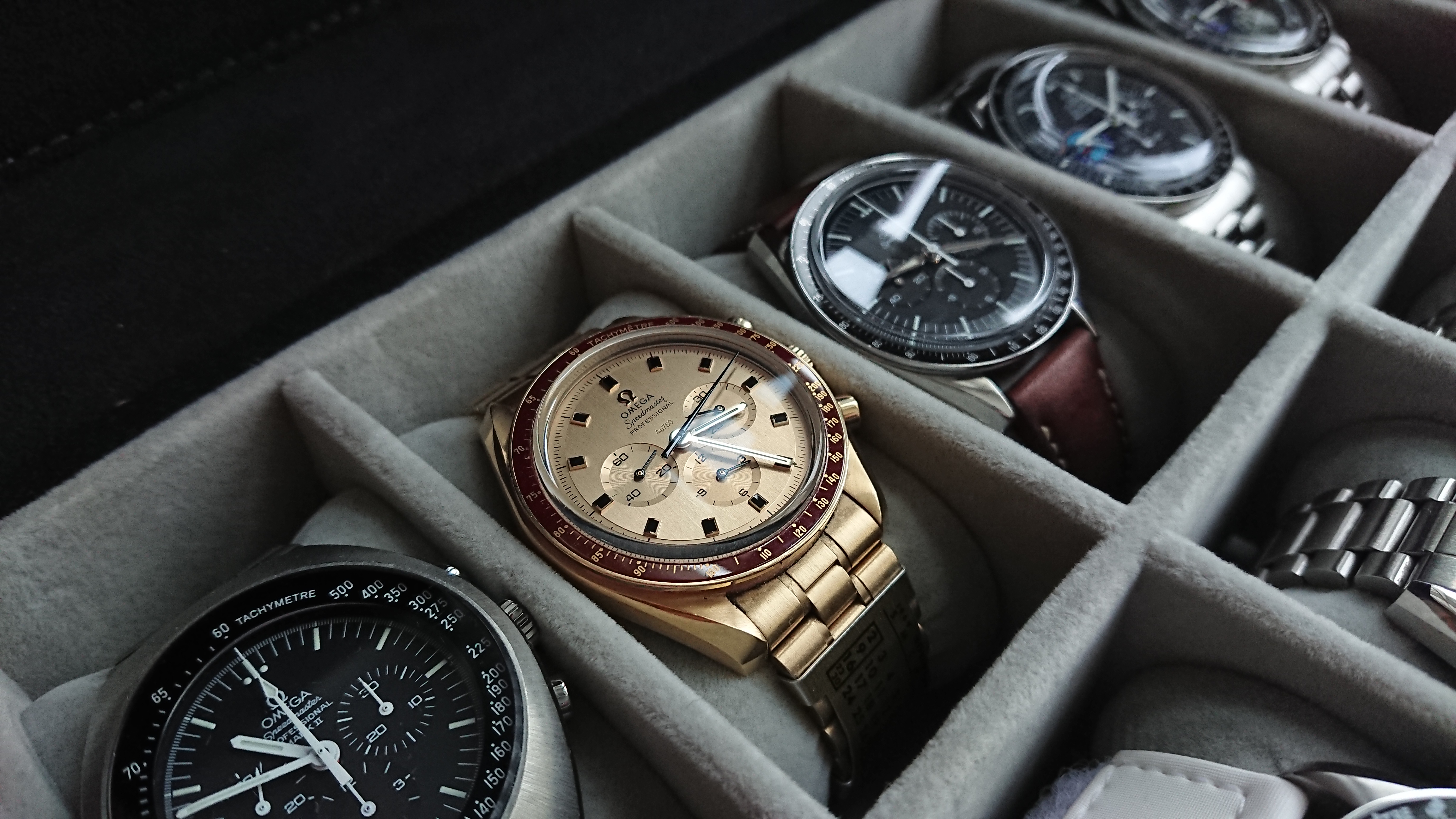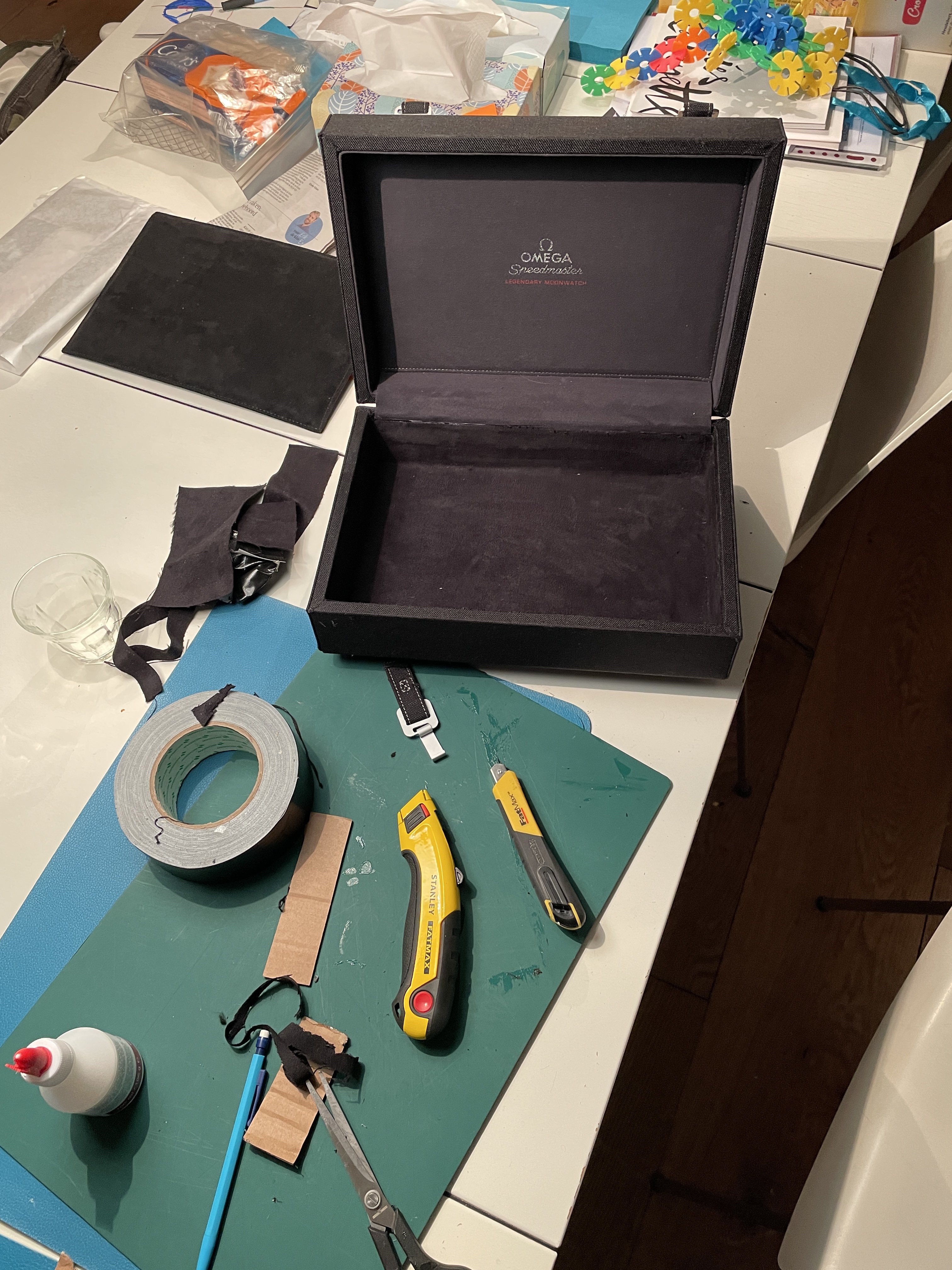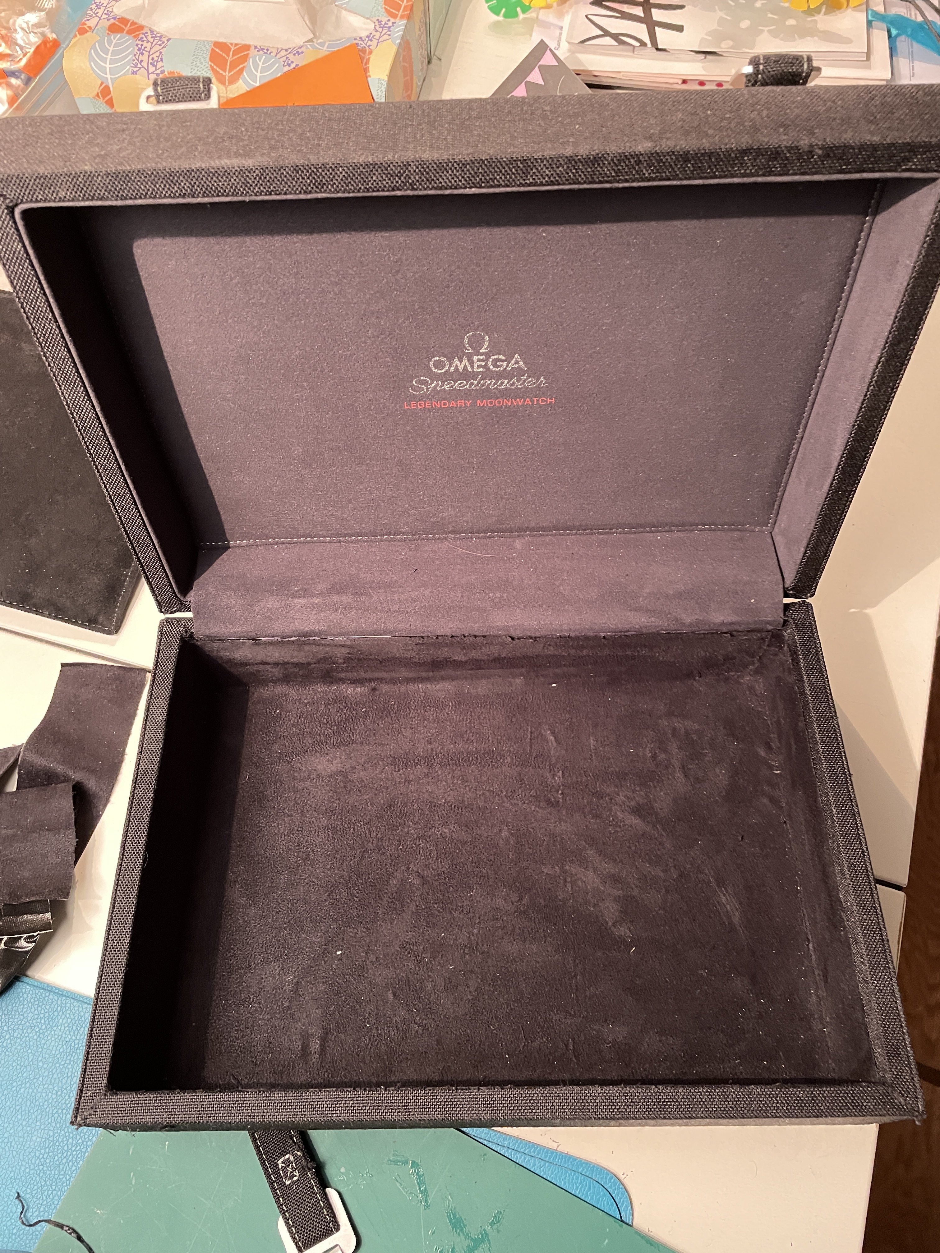The big bulky box of the Omega Speedmaster Moonwatch was just gathering dust, so I decided to turn it into a Speedmaster watch box. I stripped the box of the original inlay, which is just a bunch of cardboard layers and thin black lining and ordered a bespoke tray from MisterChrono (Hong Kong, but also delivers from Paris). The package arrived today, on Speedy Tuesday, so I guess it was meant to be ;-). It's a perfect fit and I love it!