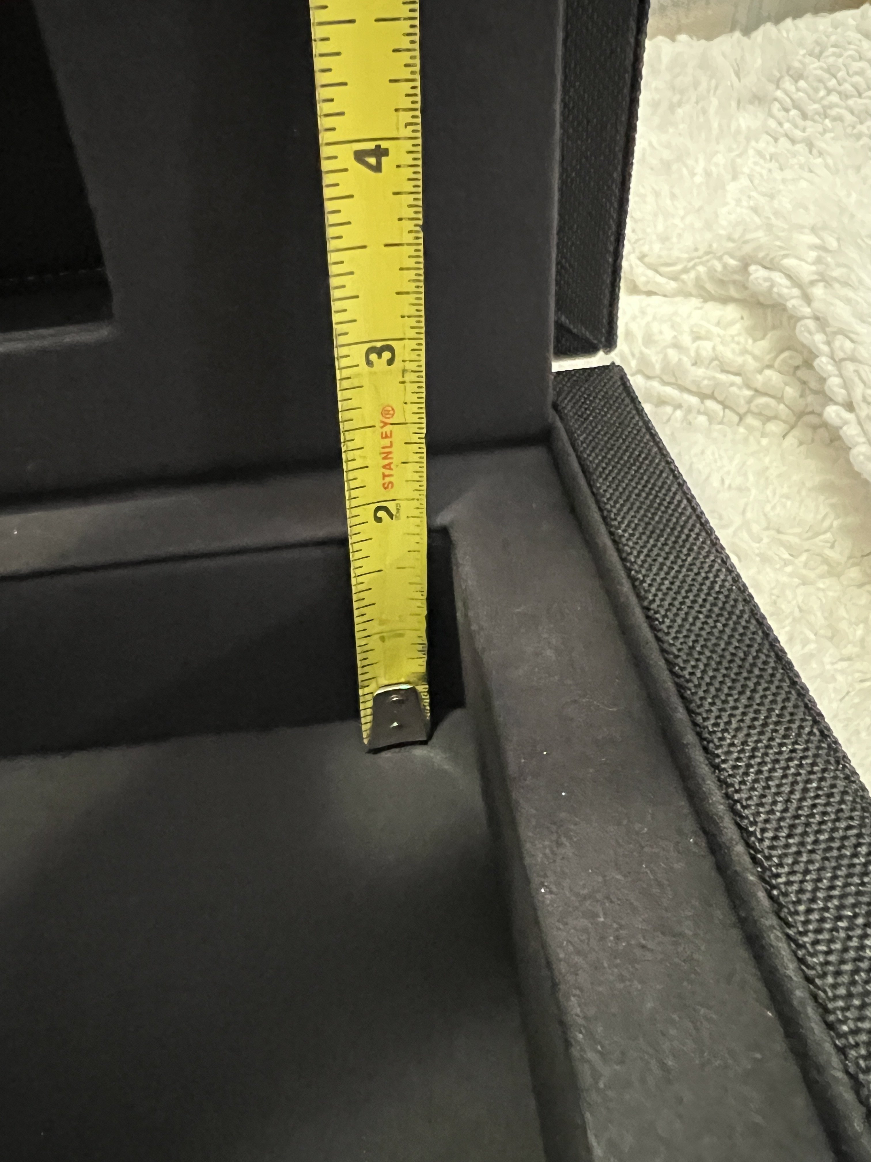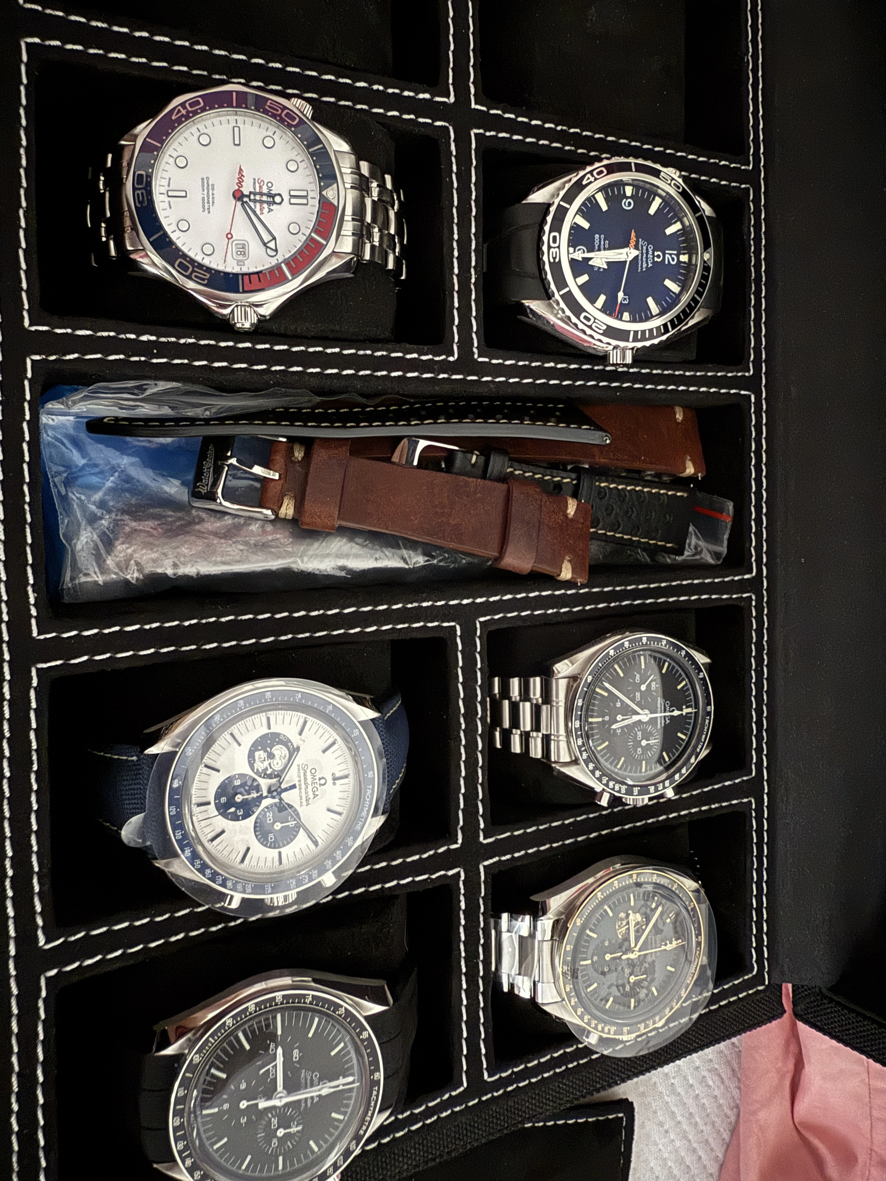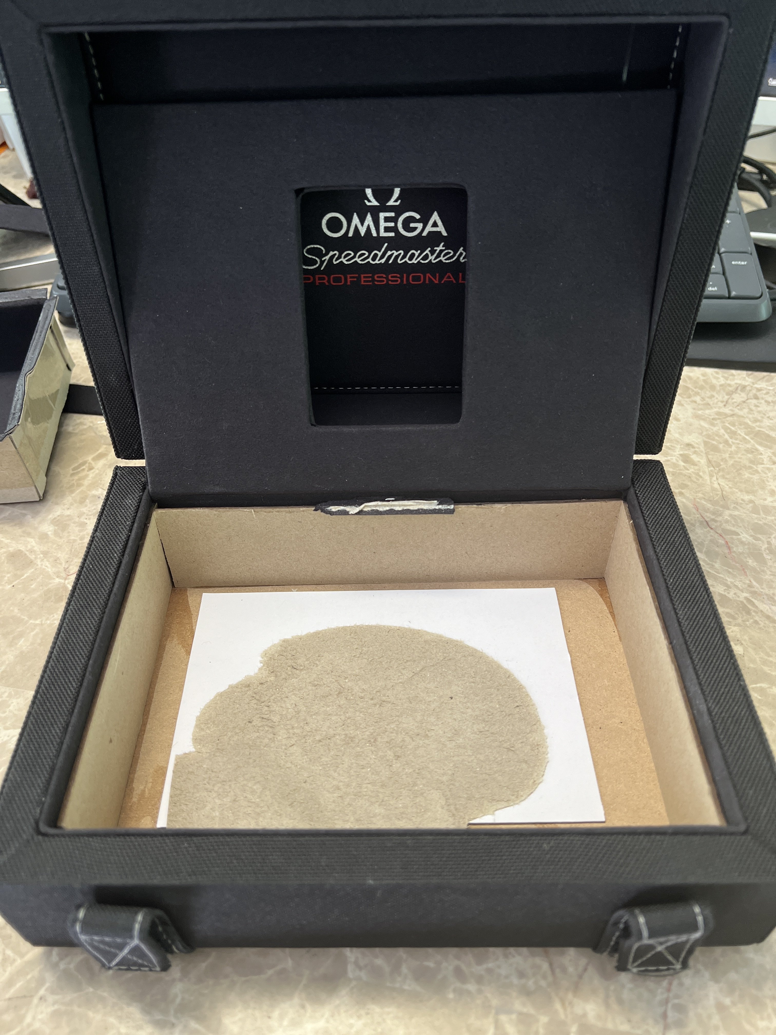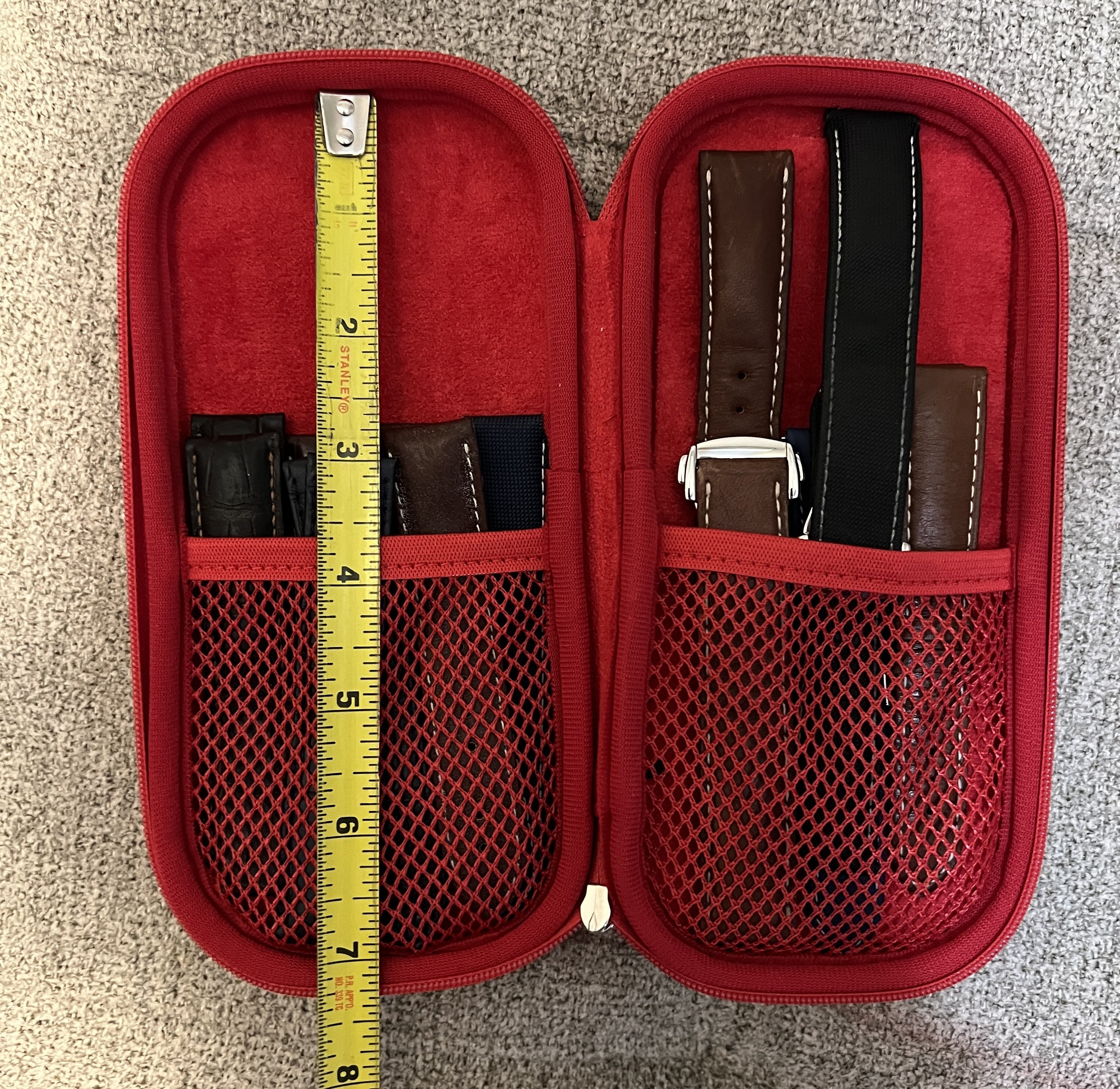 Am now considering converting a spare “small” Speedmaster 3861 box into a strap box, which would have about 7 1/2 inches wide x 5 1/2 inches length x 2 inches size on its bottom side (as shown below), enough to substitute several Omega red service cases which currently use to store my bands and bracelets