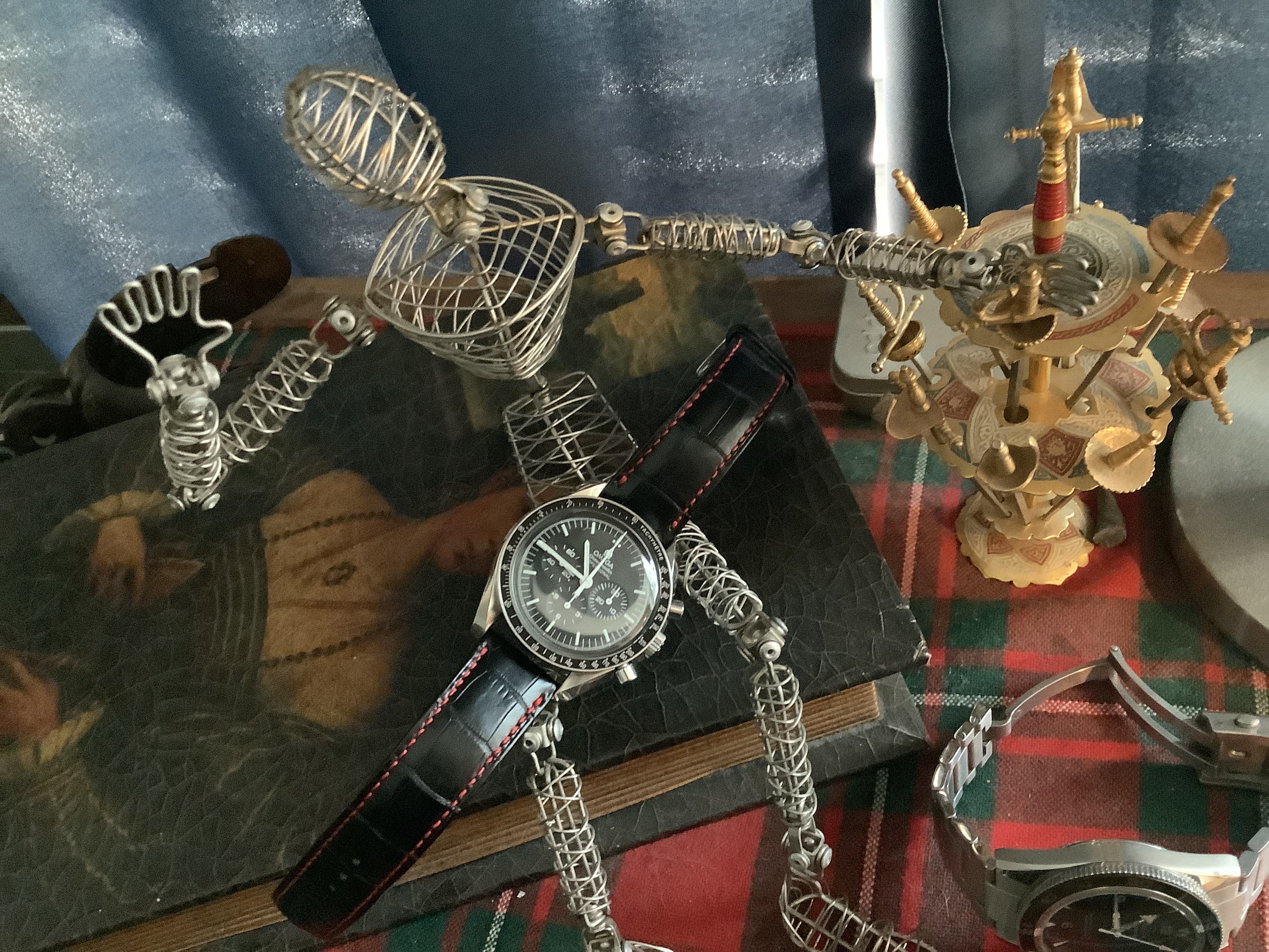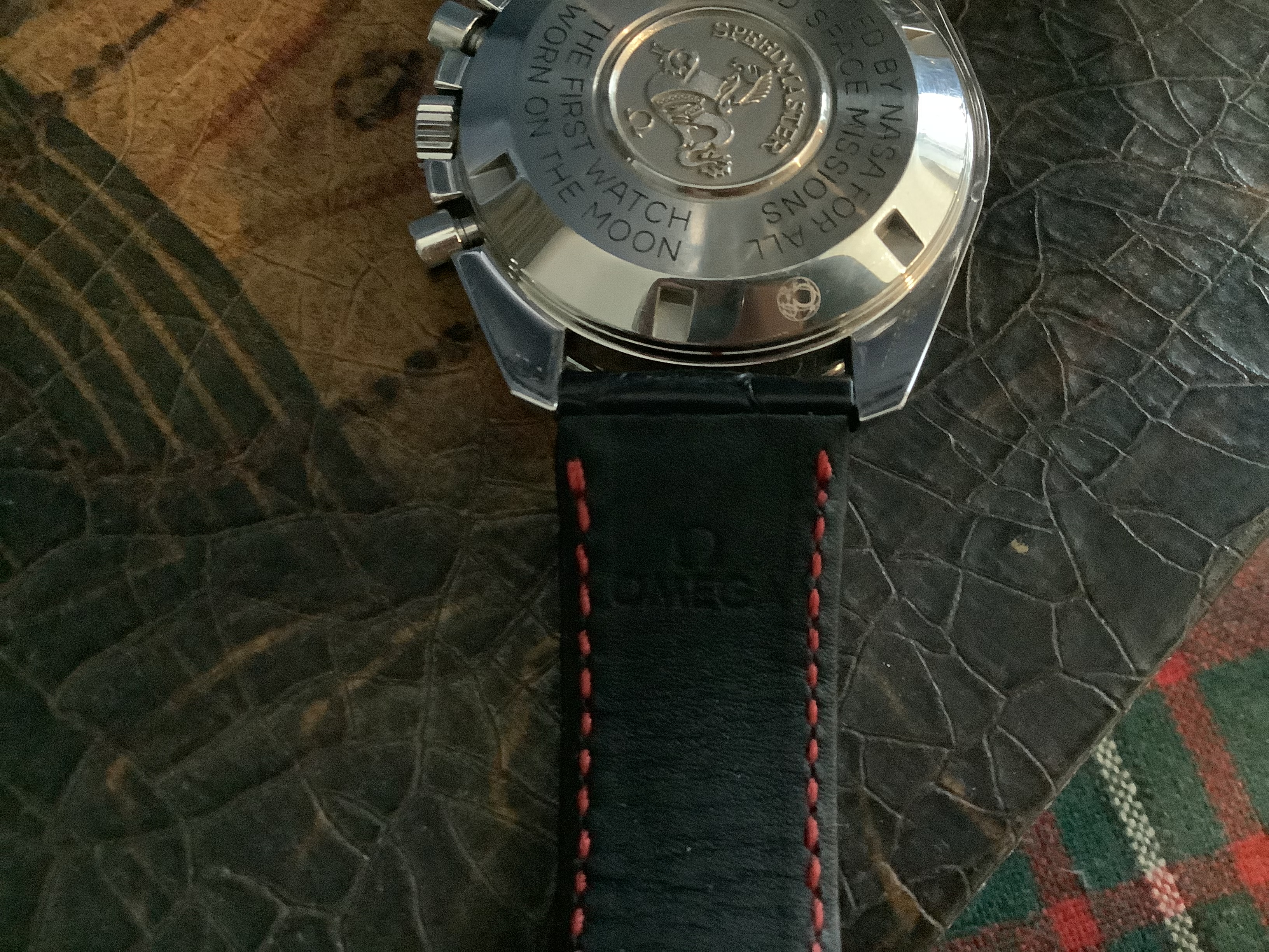 ·Wearing my recently devalued Speedmaster today on this splendid, semi-custom strap. Black with red stitching.