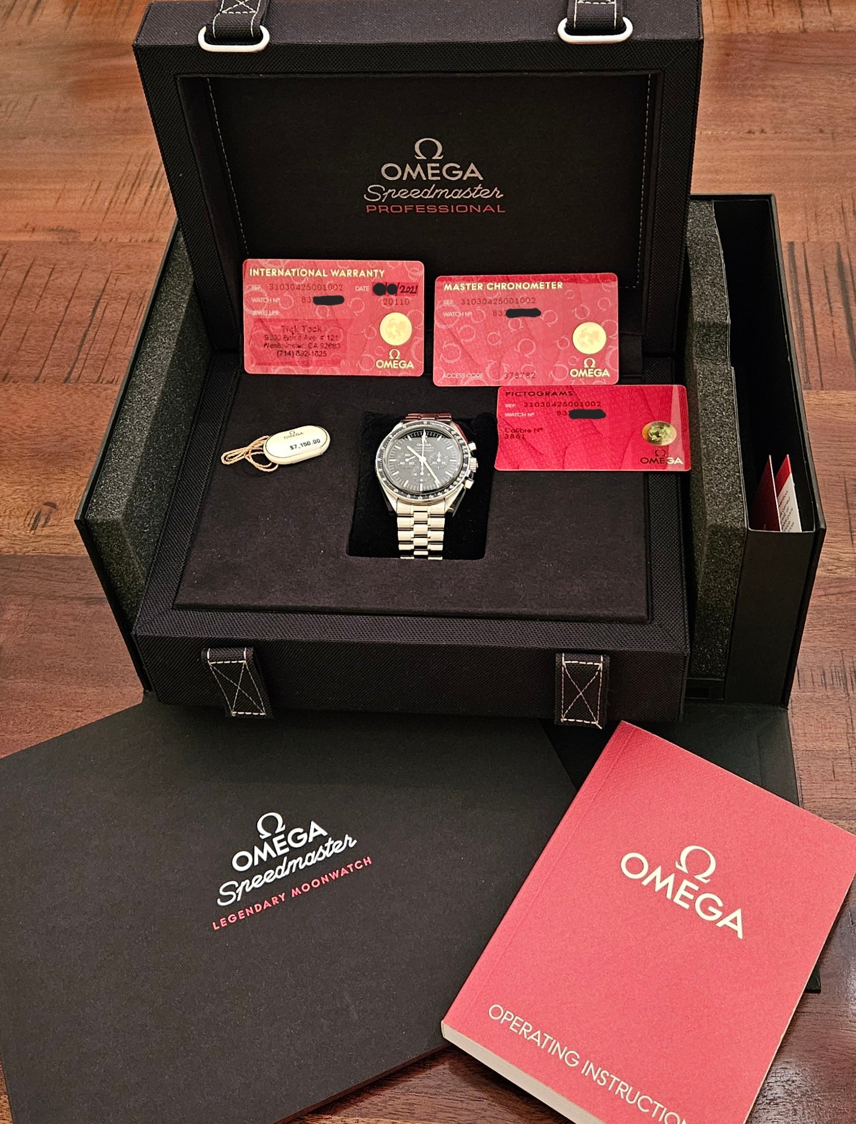 Box, Card, and Accessories: Outer black cardboard box + inner presentation box, all 3 Omega warranty cards, white serialized hang tag, original purchase receipt, Omega micro fiber polishing cloth, the inner watch cushion (missing the outer ring/cushion that goes around that), operating manual, and Speedmaster pictorial book.