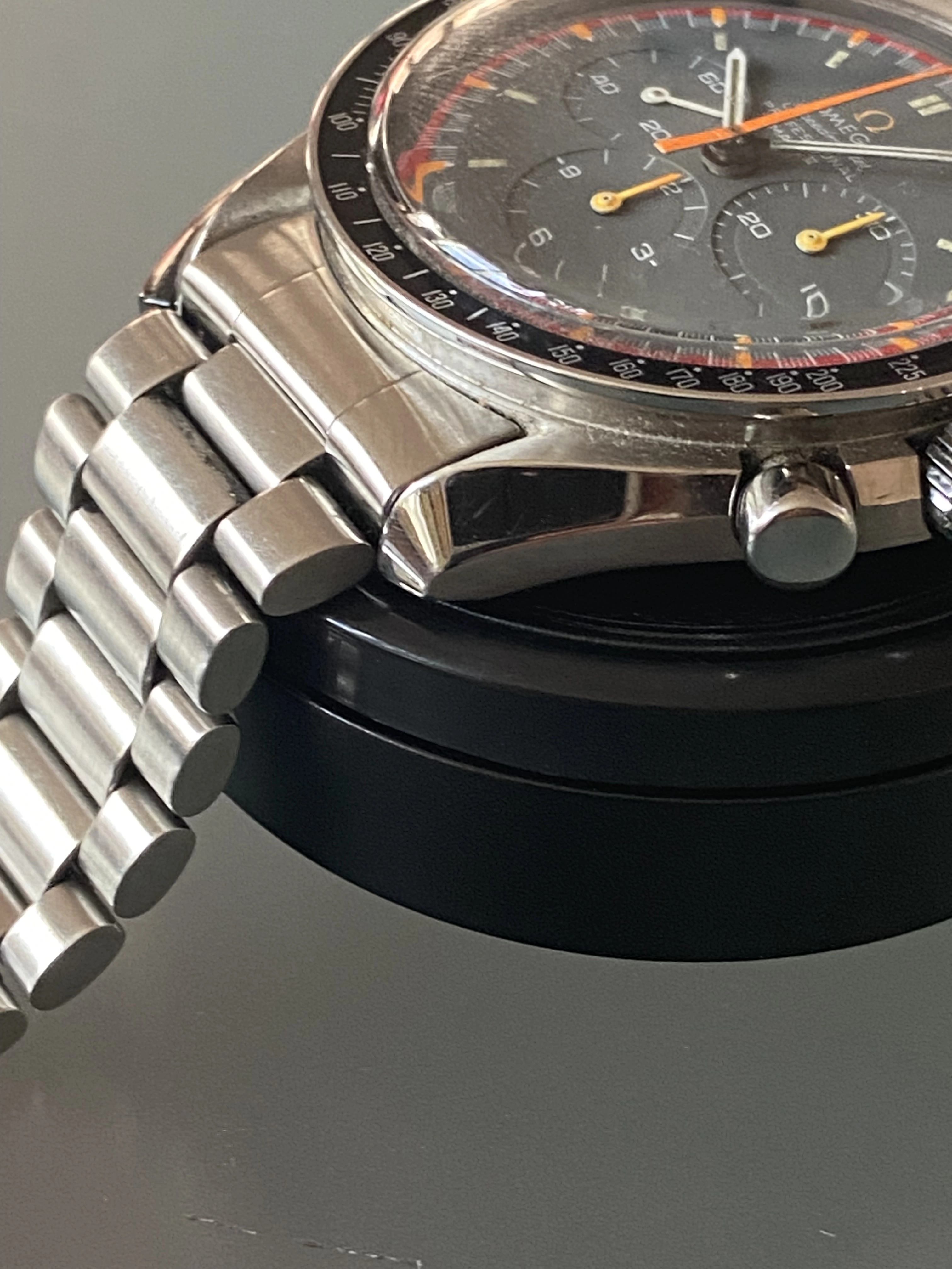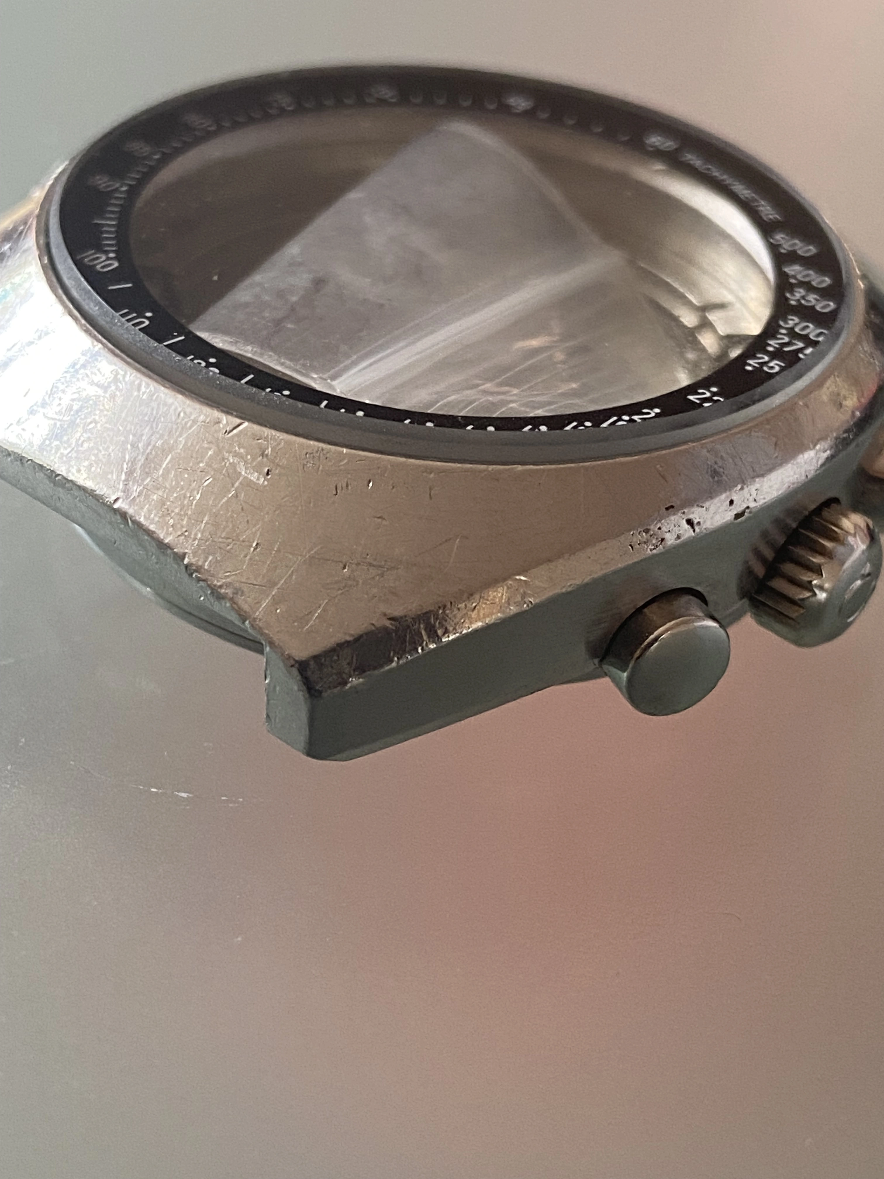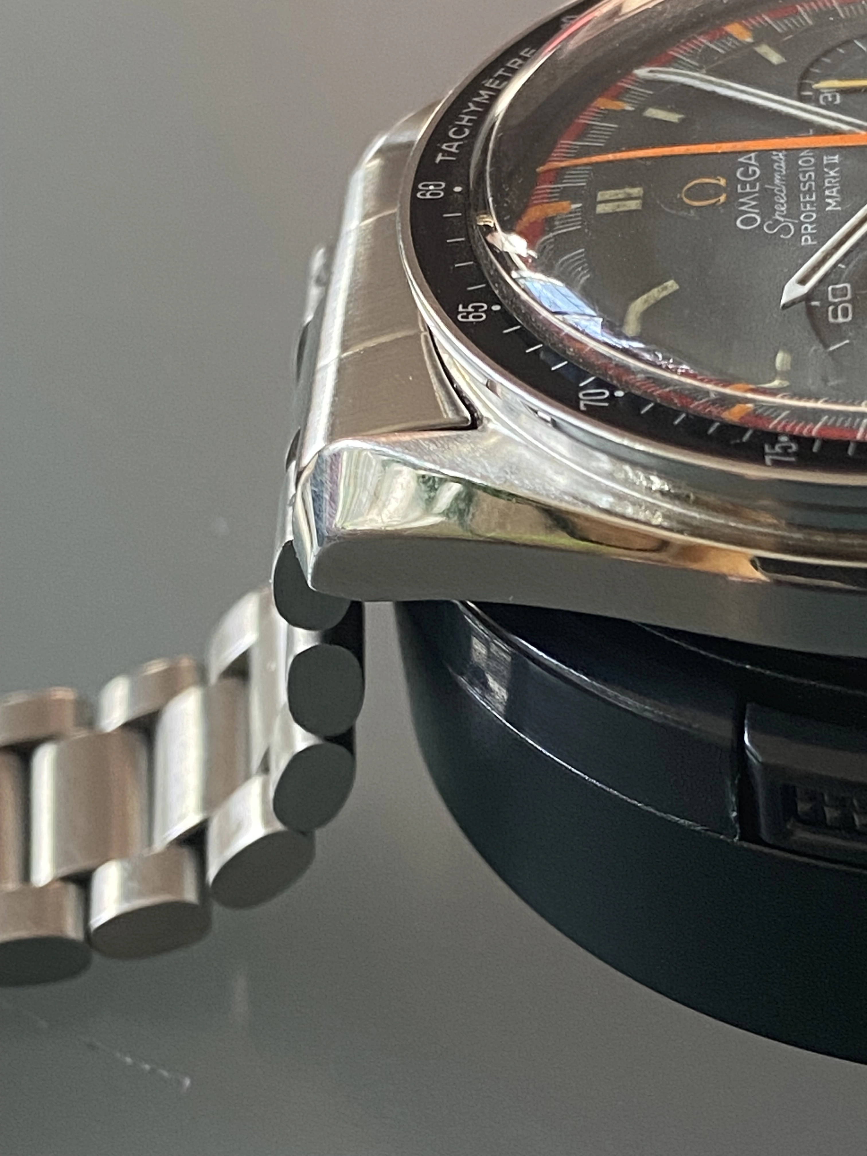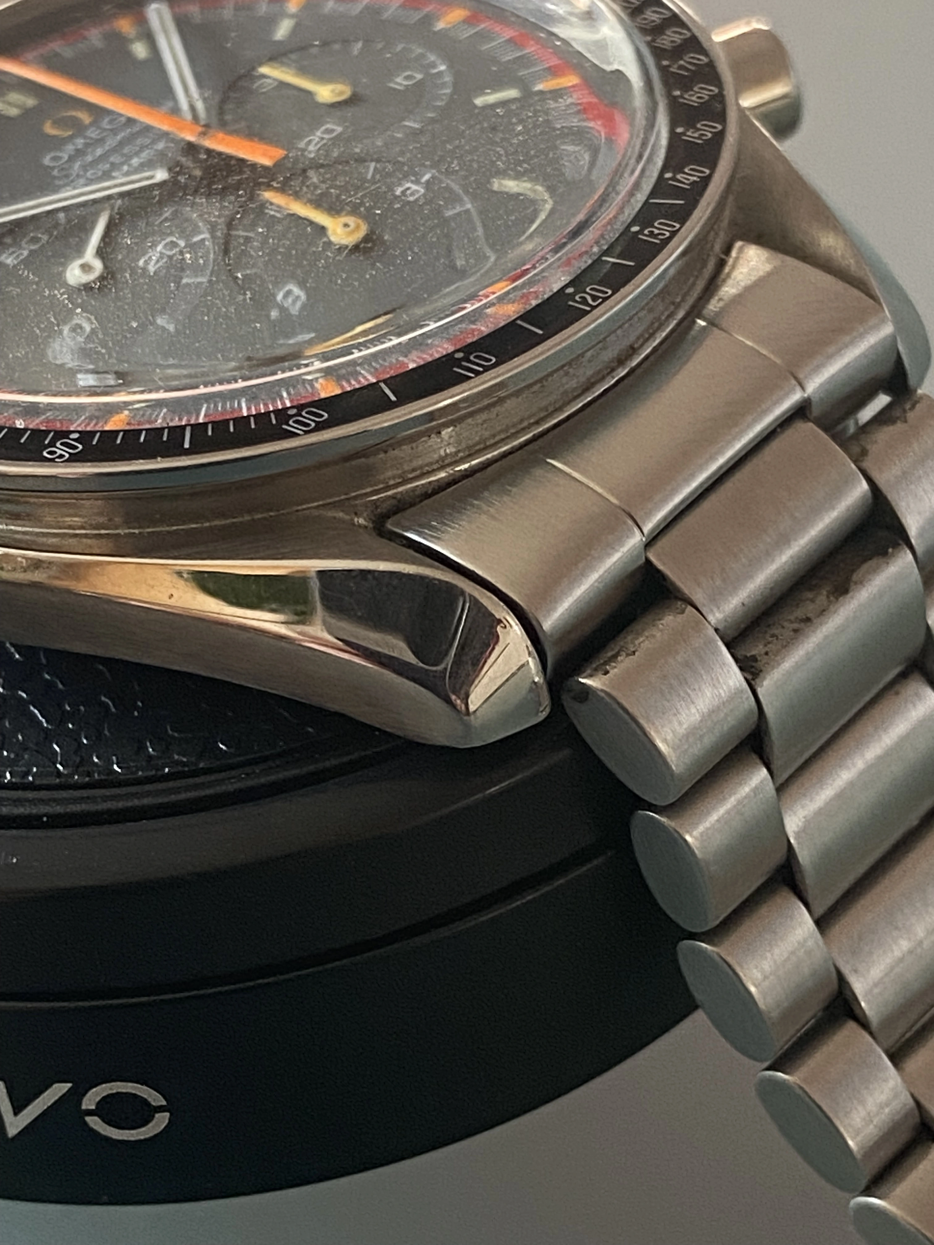Midcase has seen a polish, tops of the lugs look good and sharp and it looks great on the wrist. Polish seen most notably on one lug but it still has good definition. Caseback is a service caseback in the pre-moon style to make it look “correct” to the real Pro grey racing.