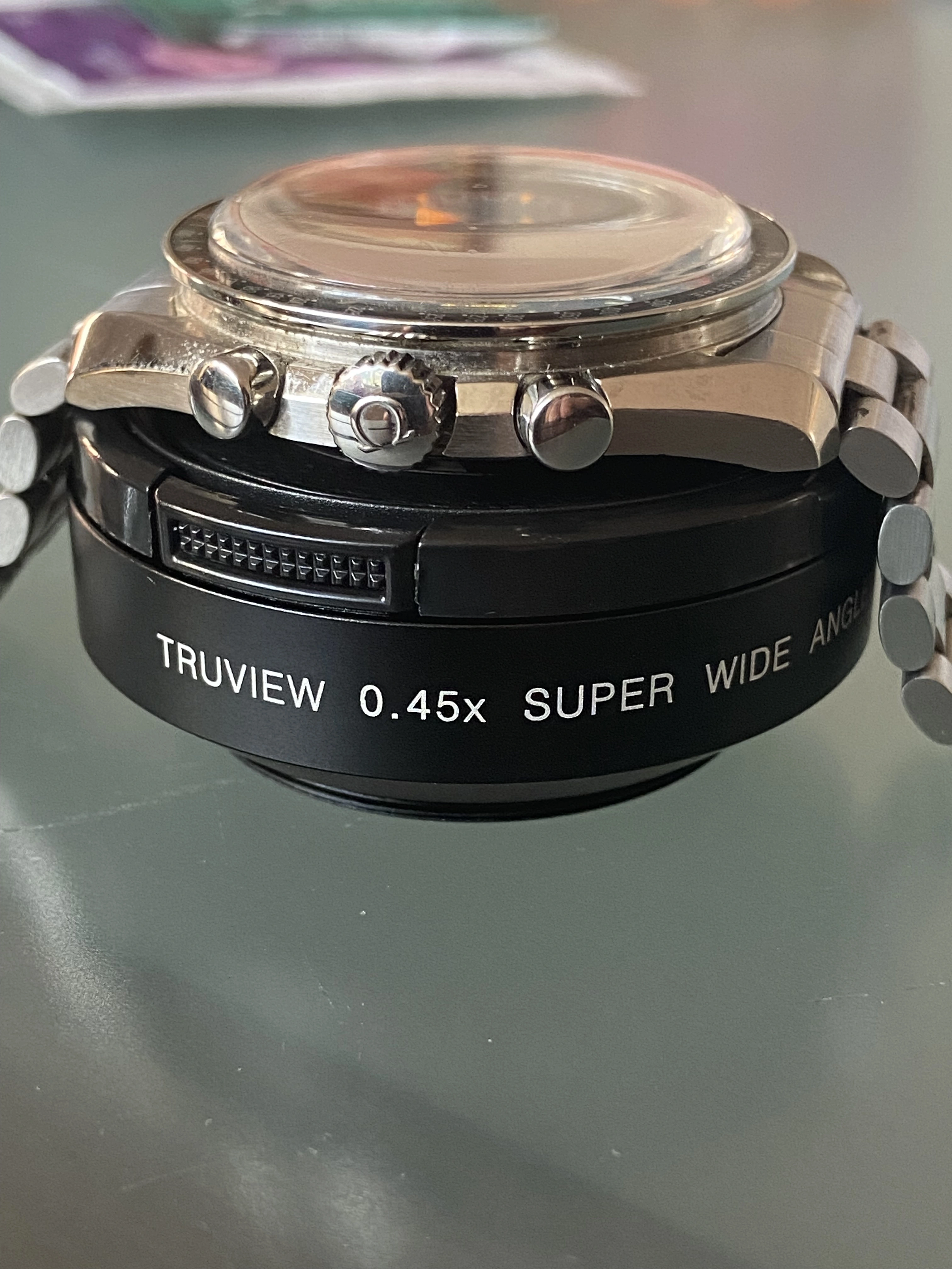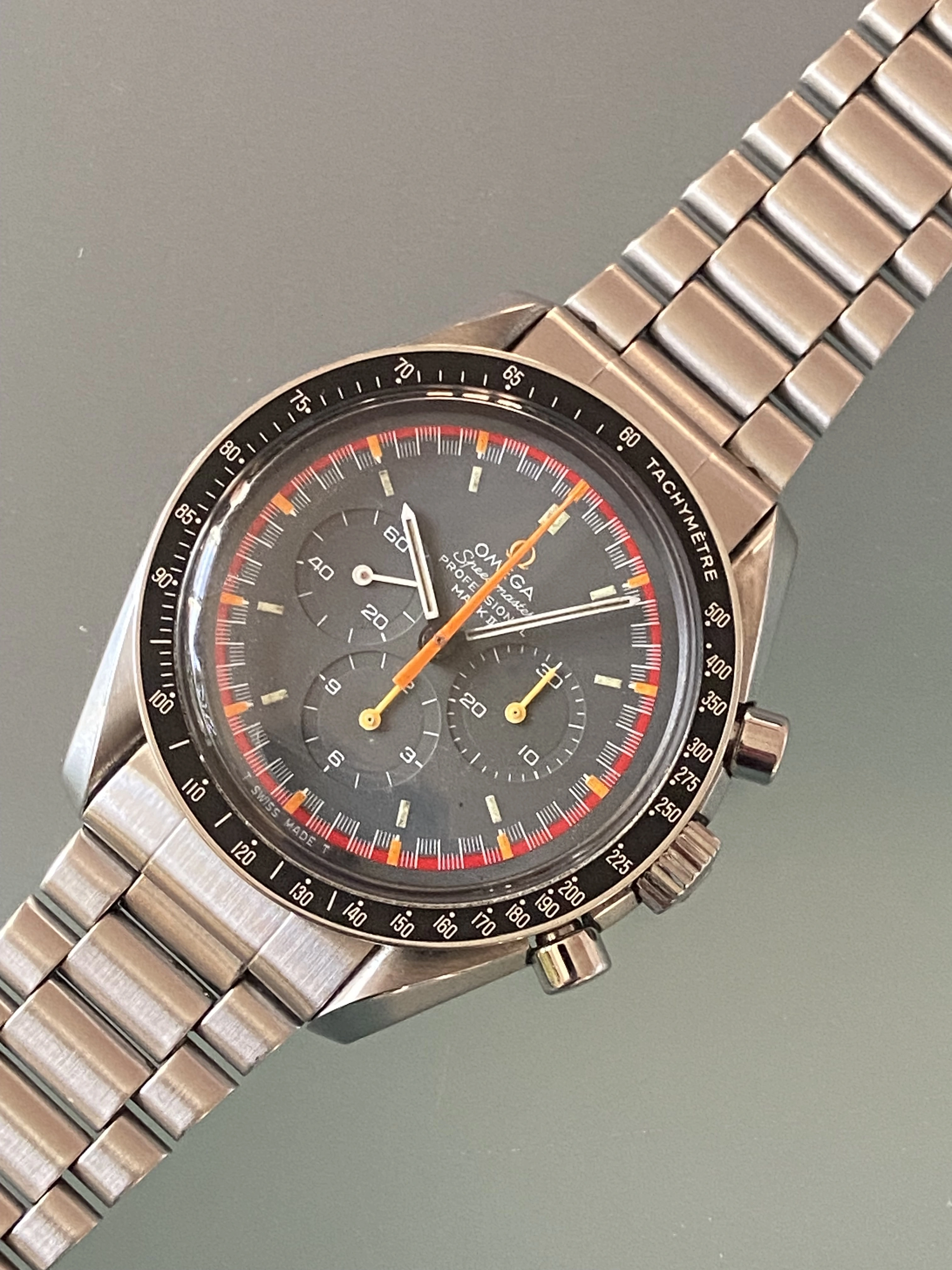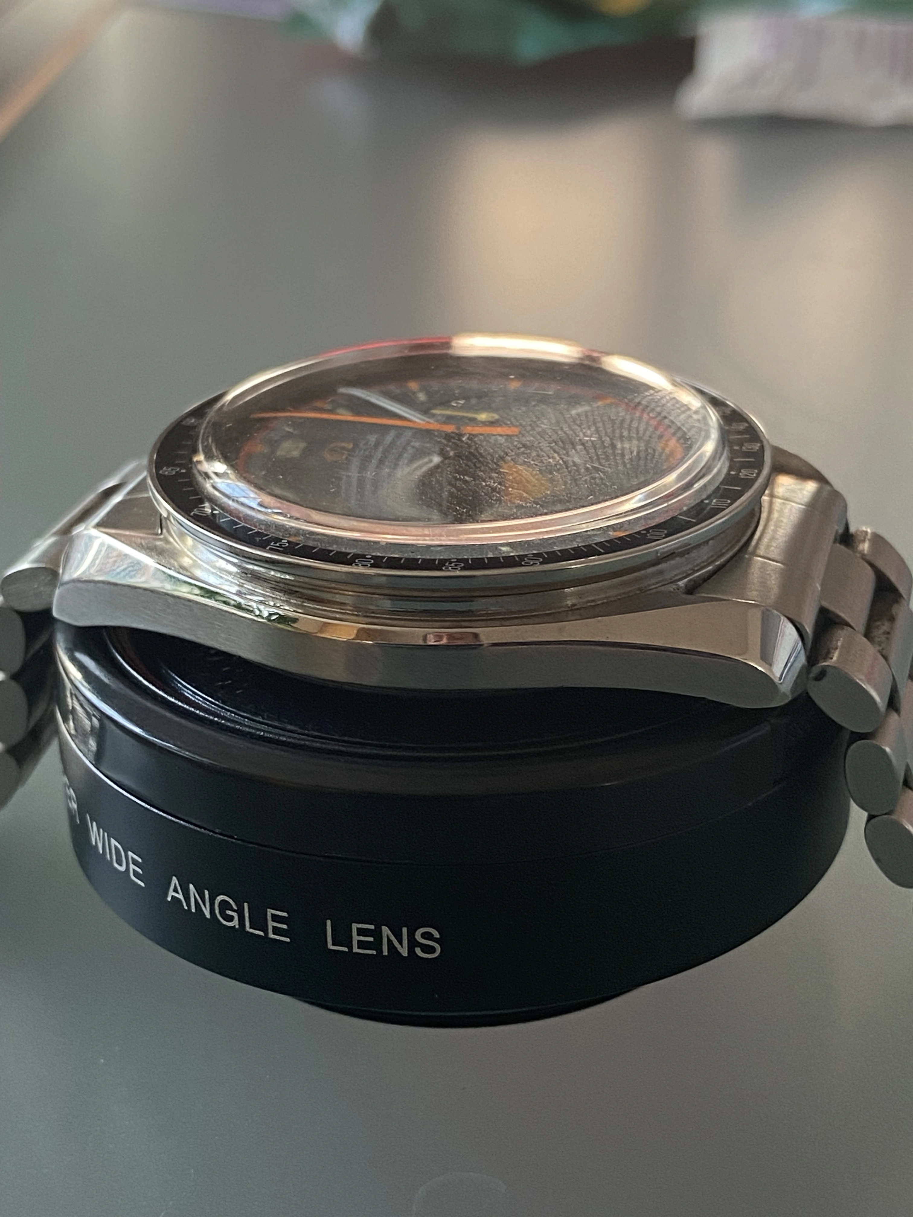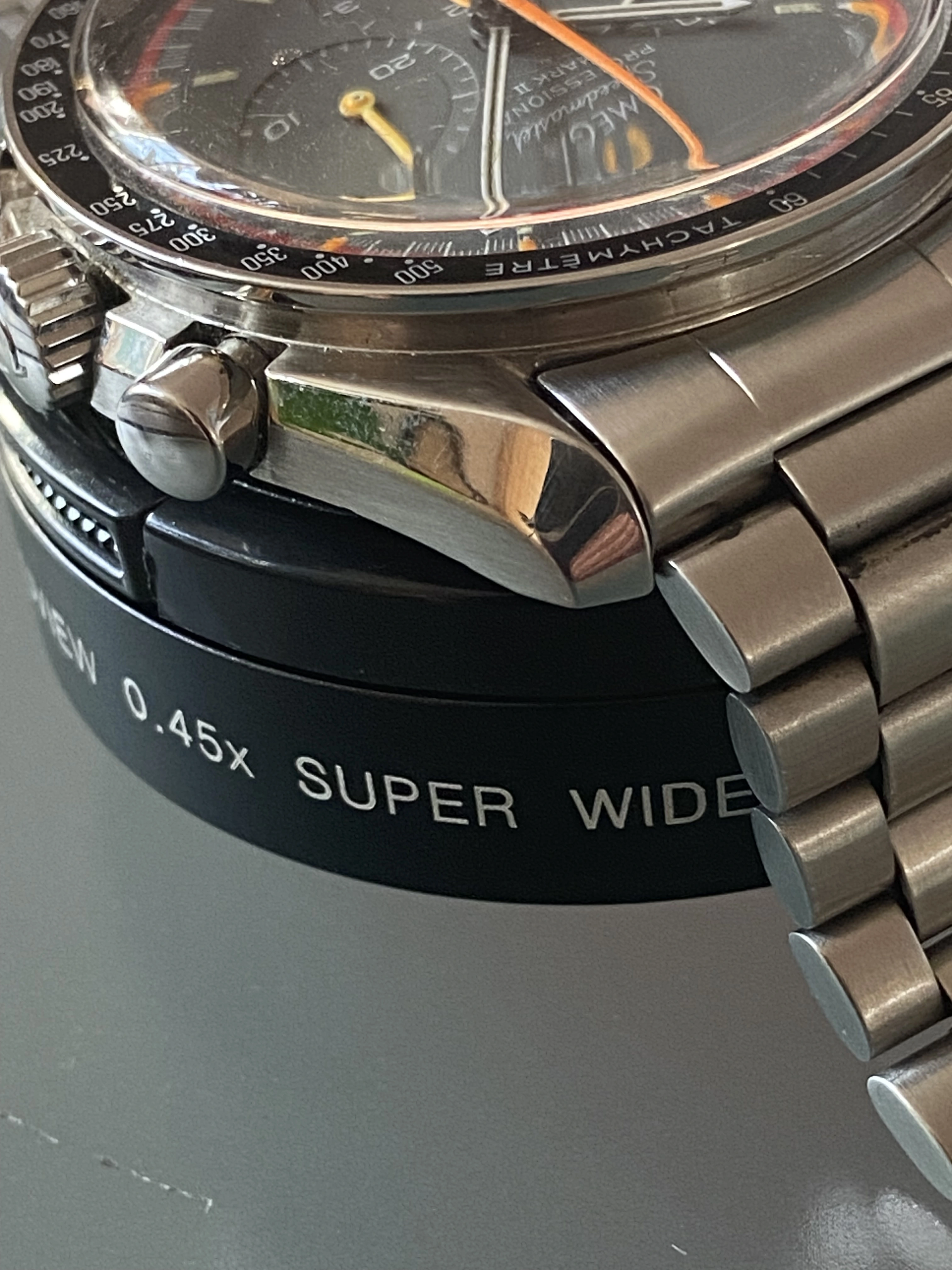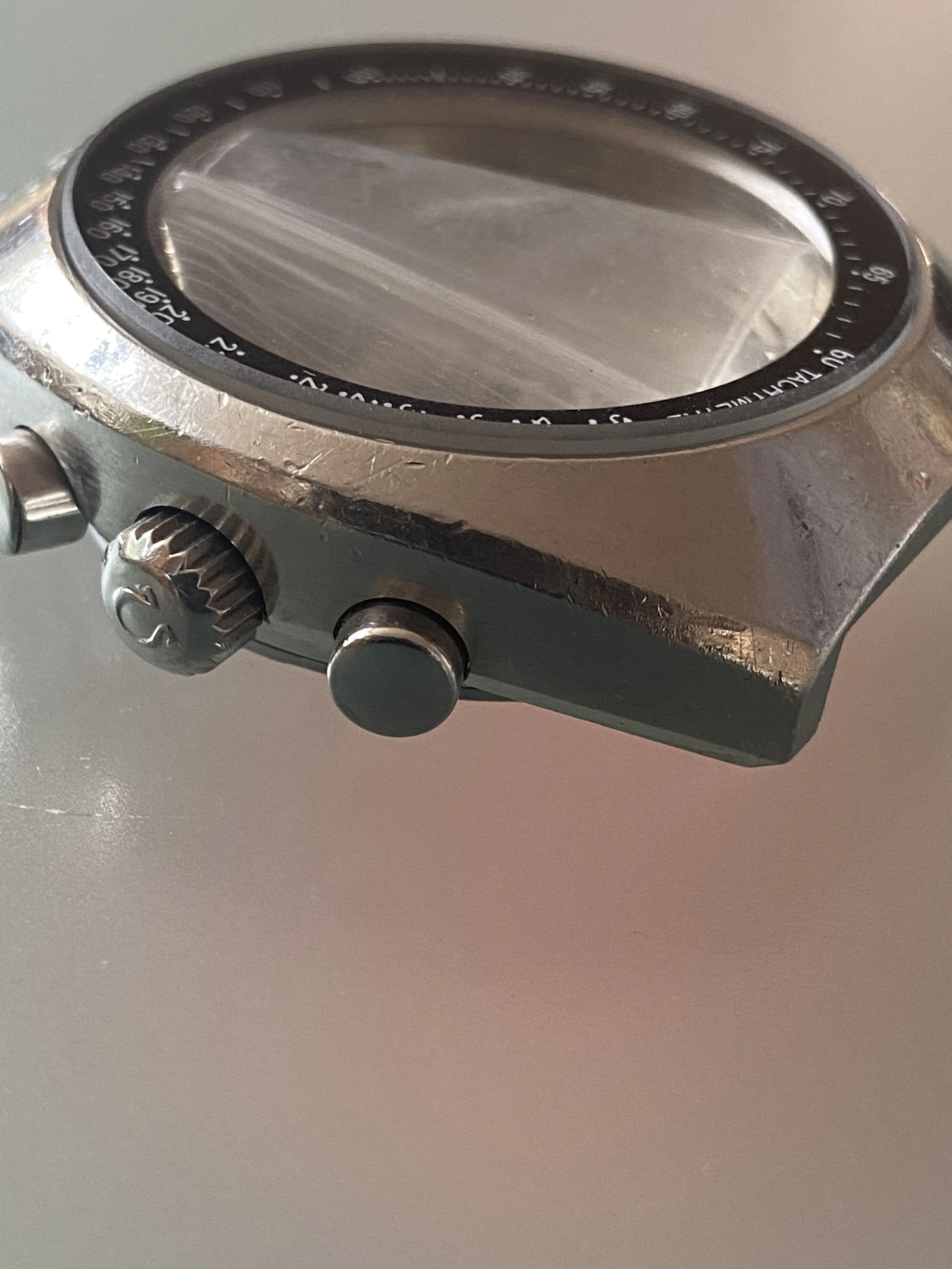Midcase has seen a polish, tops of the lugs look good and sharp and it looks great on the wrist. Polish seen most notably on one lug but it still has good definition. Caseback is a service caseback in the pre-moon style to make it look “correct” to the real Pro grey racing.