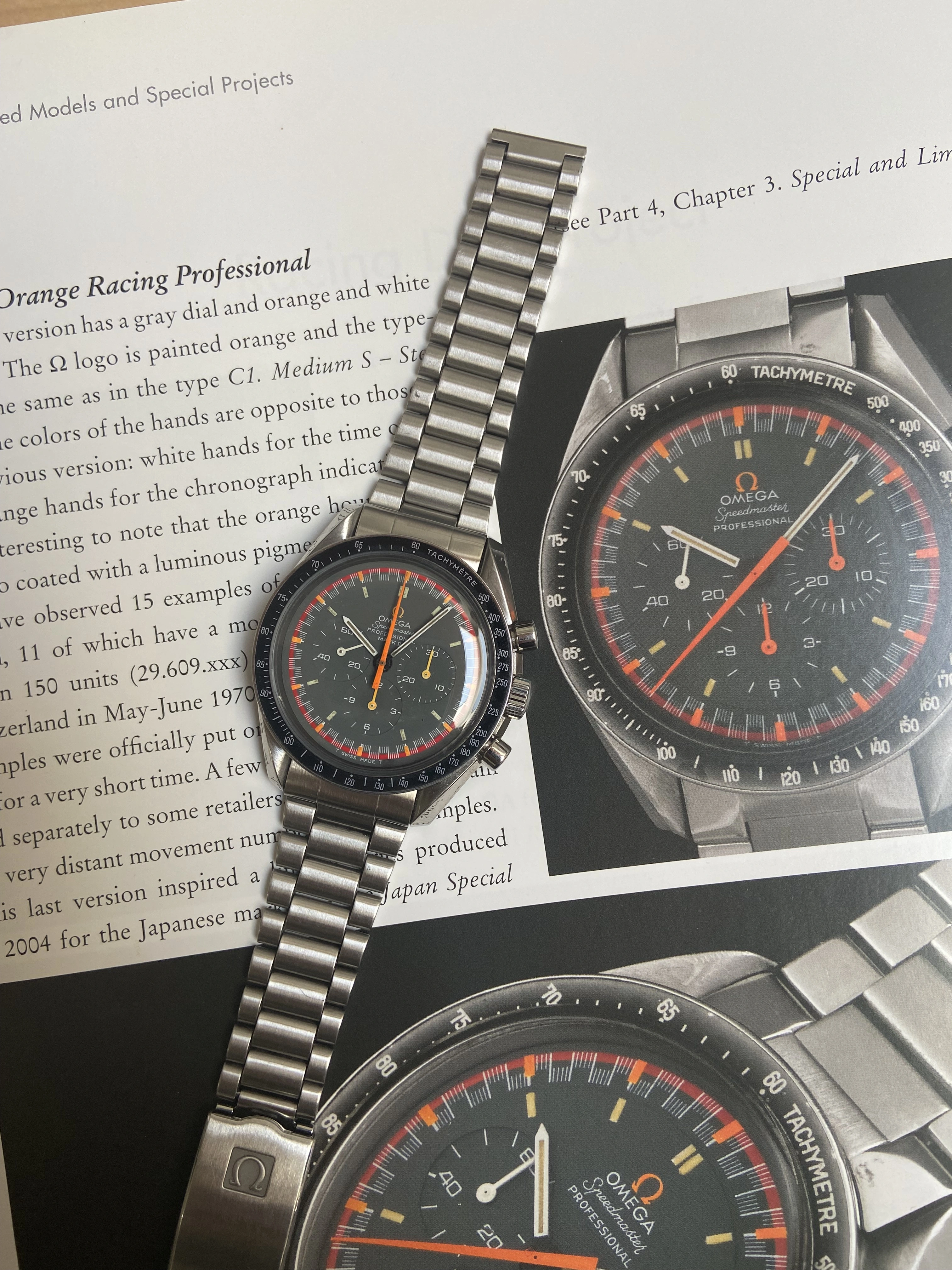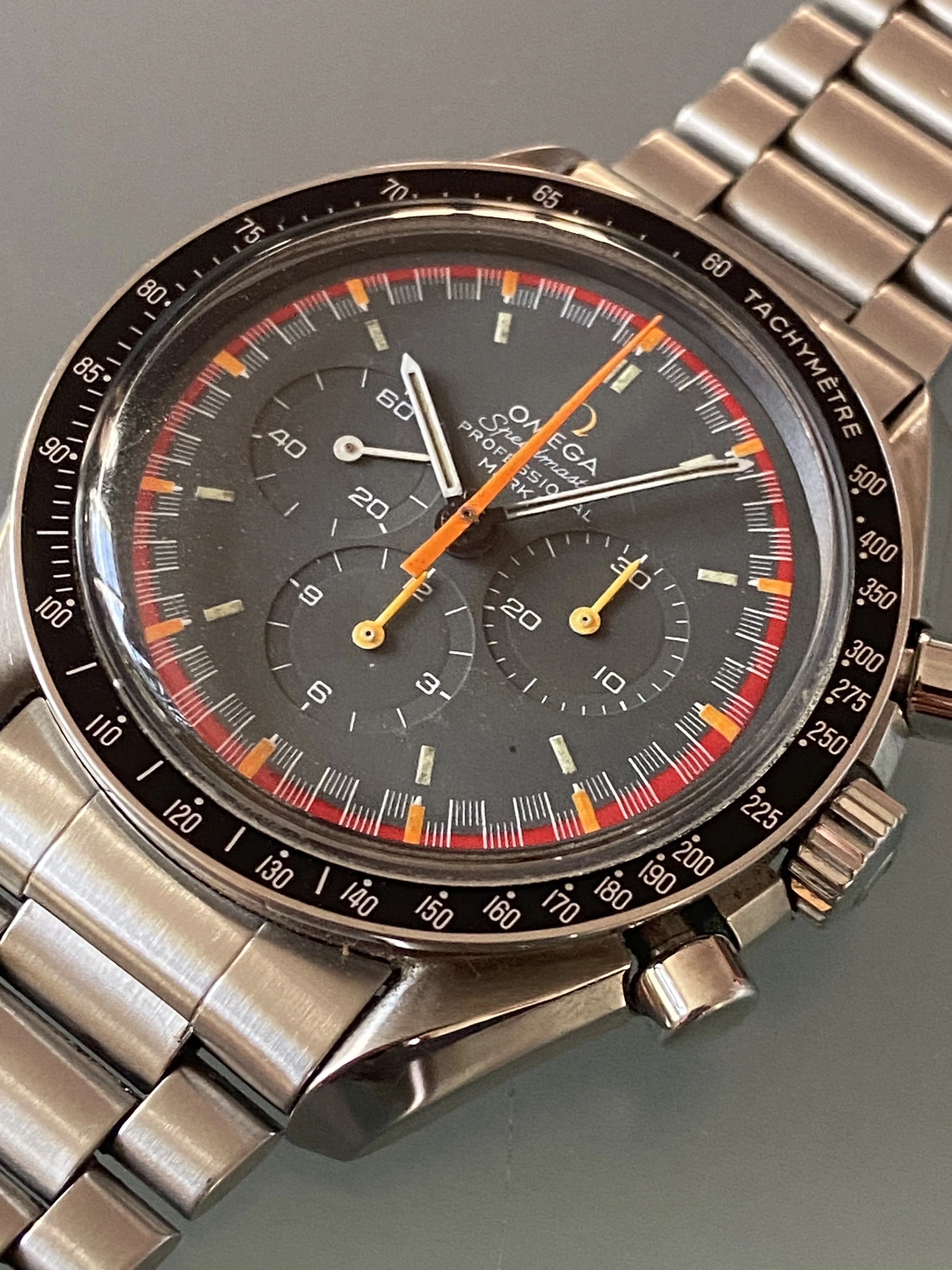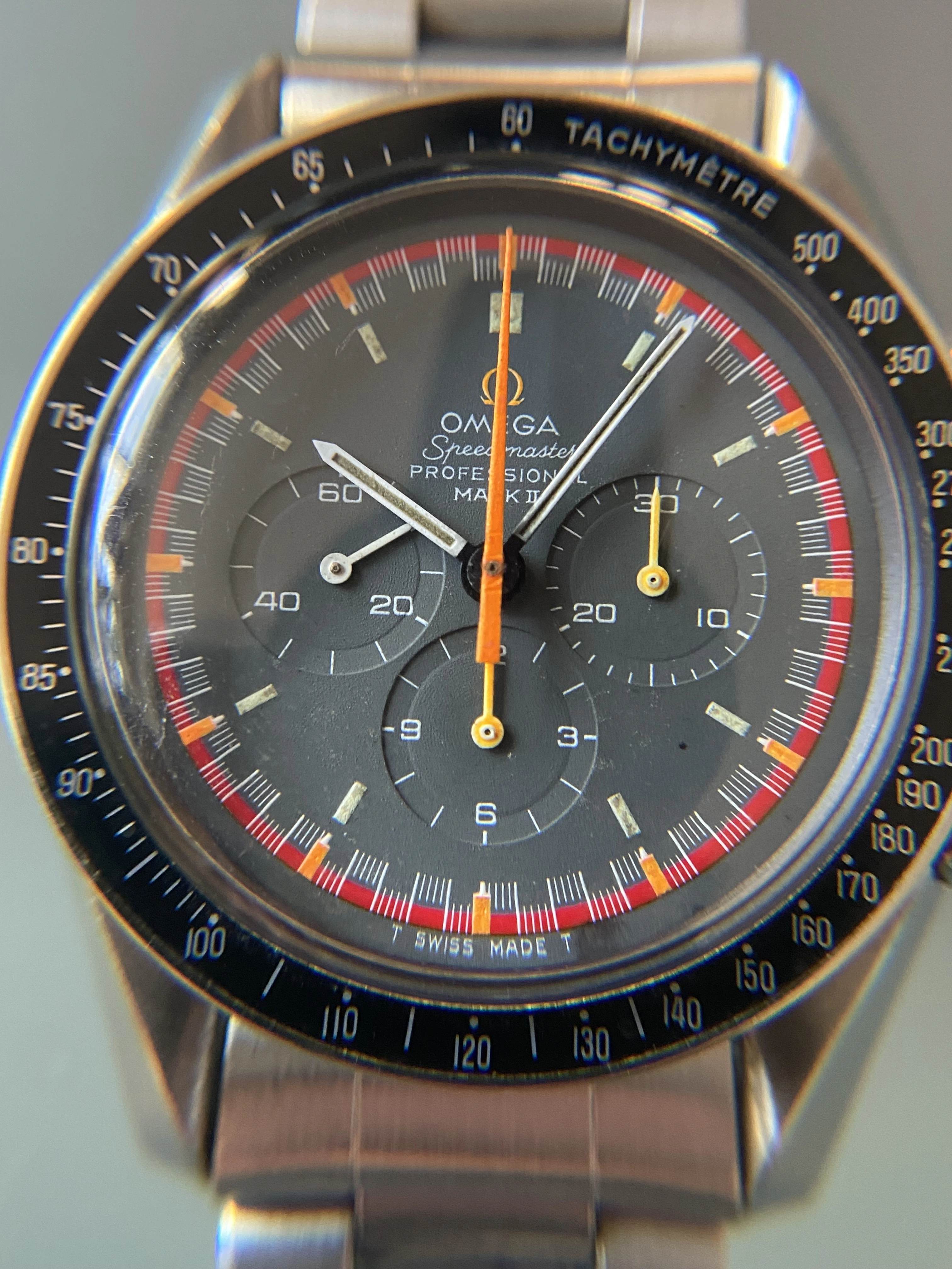 What we have here is an Omega Speedmaster Mark II with the rarer racing dial/hands, recased into a Professional style case. Fun watch for daily wear and a great conversation starter with other watch-nerds.