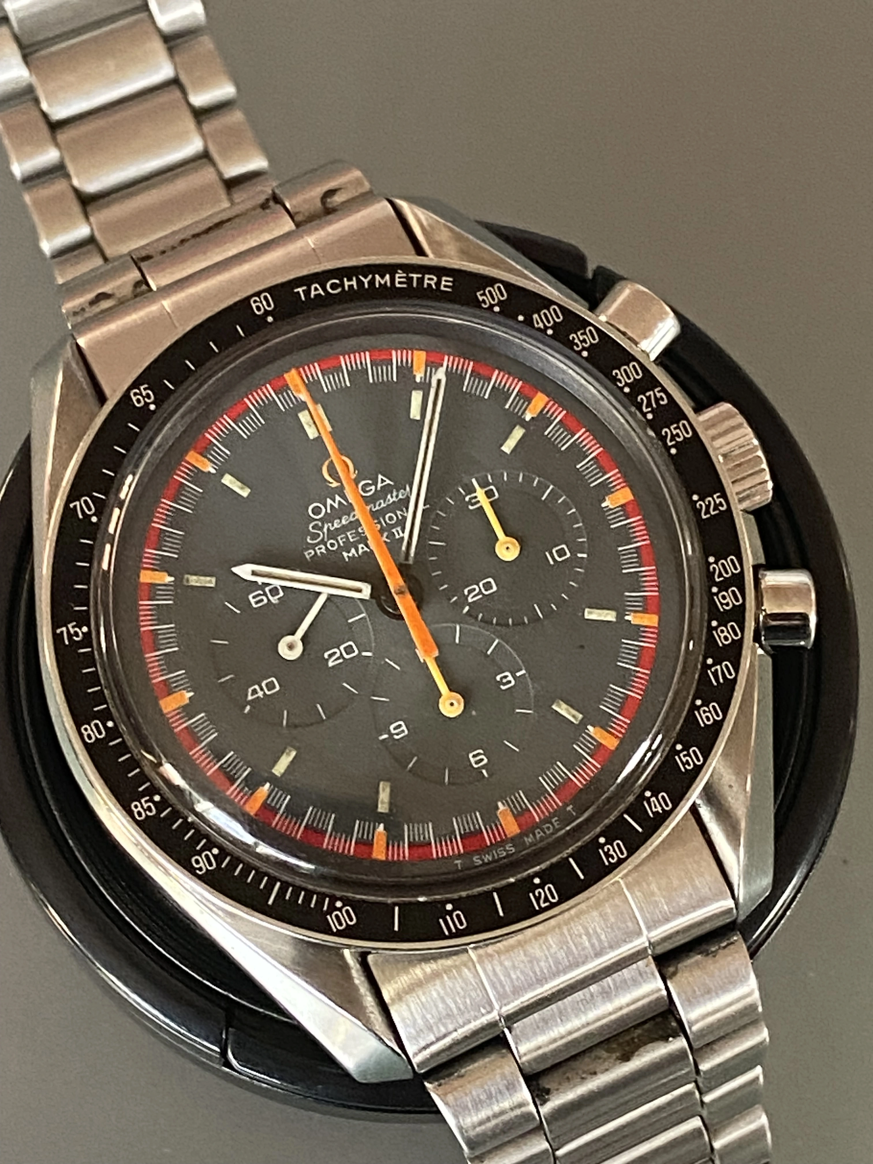 The hands are the much rarer thin racing with black center, the same type used on the ultra rare pro grey racing dial, not the more standard thick MKII hands. Took a while to find a MKII with these hands.