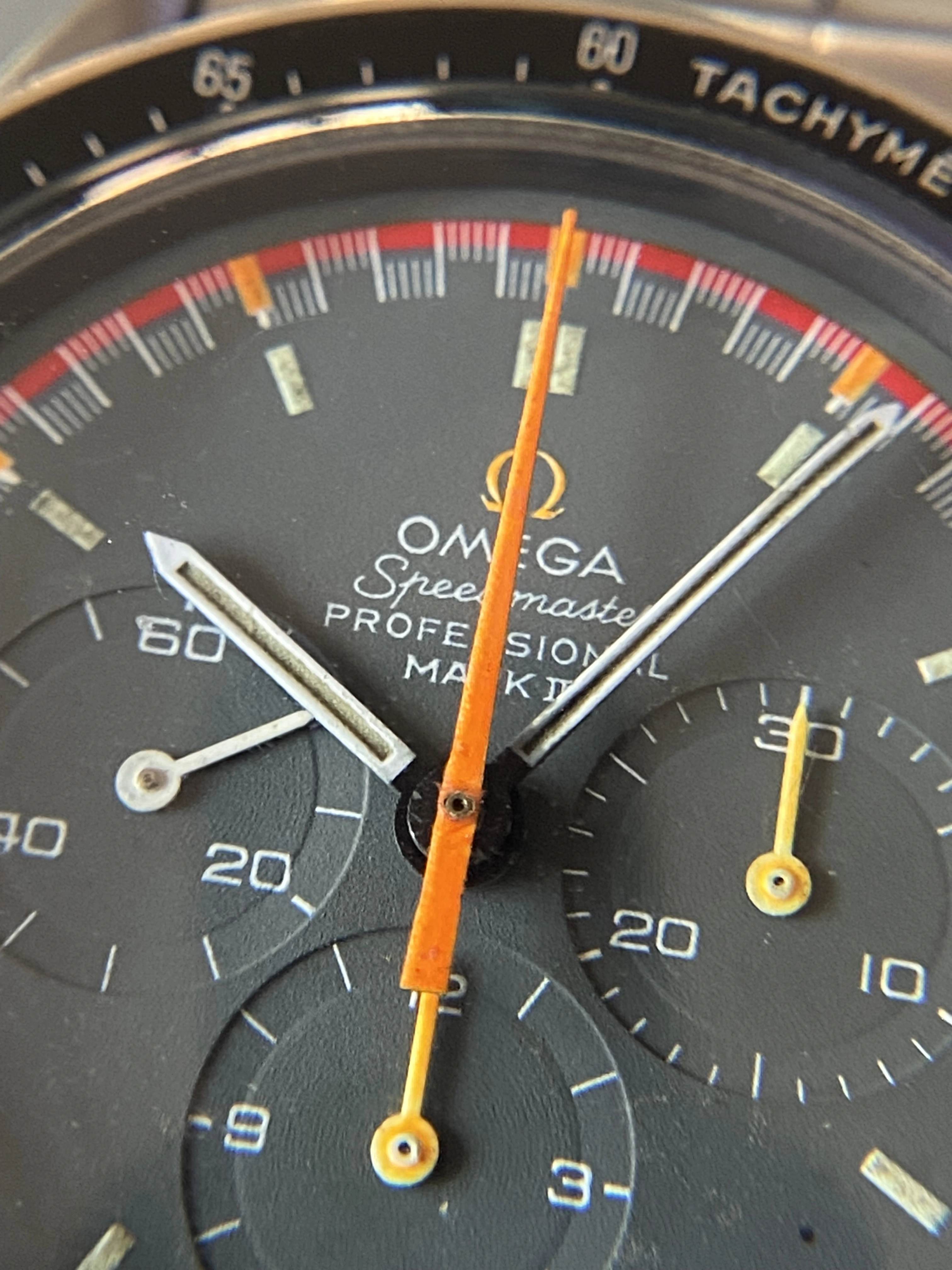 Dial is good looking but not perfect. (You don’t sacrifice a perfect MKII for a mod). Good looking lume with a mark or two on the dial surface, including a tiny scratch on the hour subdial, and one speck of melted gasket goo between 4:00-5:00 that I didn’t risk removing. I don’t notice the defects on the wrist but I’ll make sure they are highlighted in the photos.