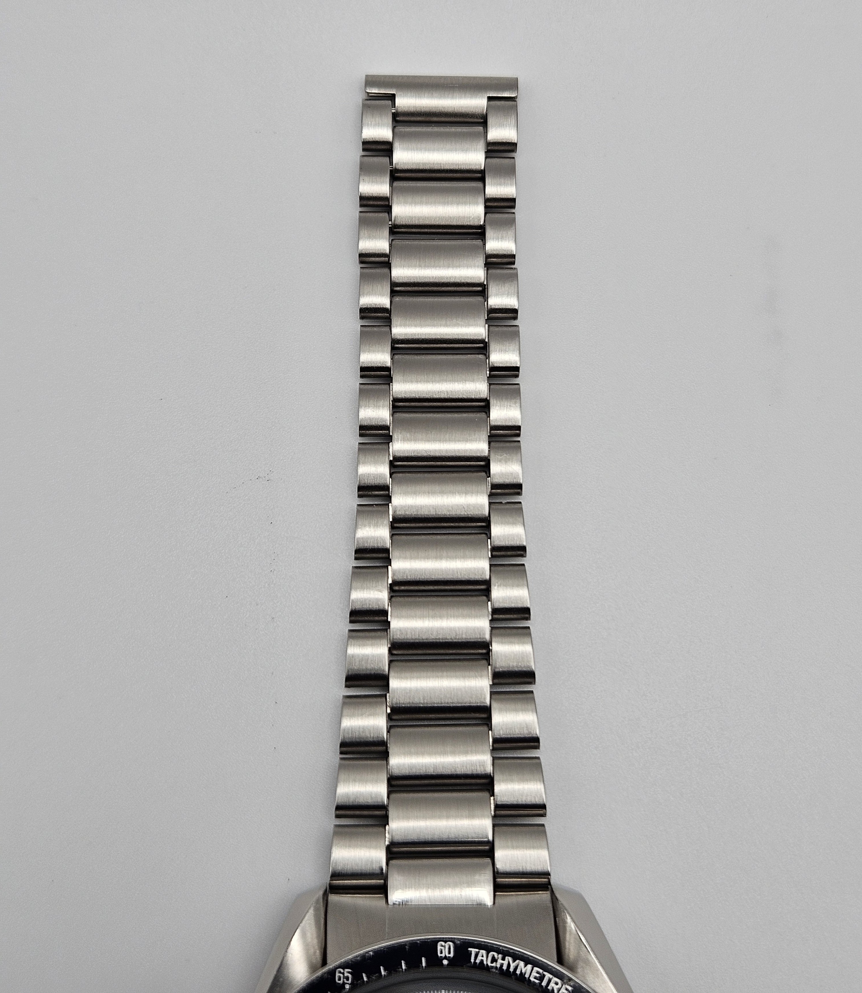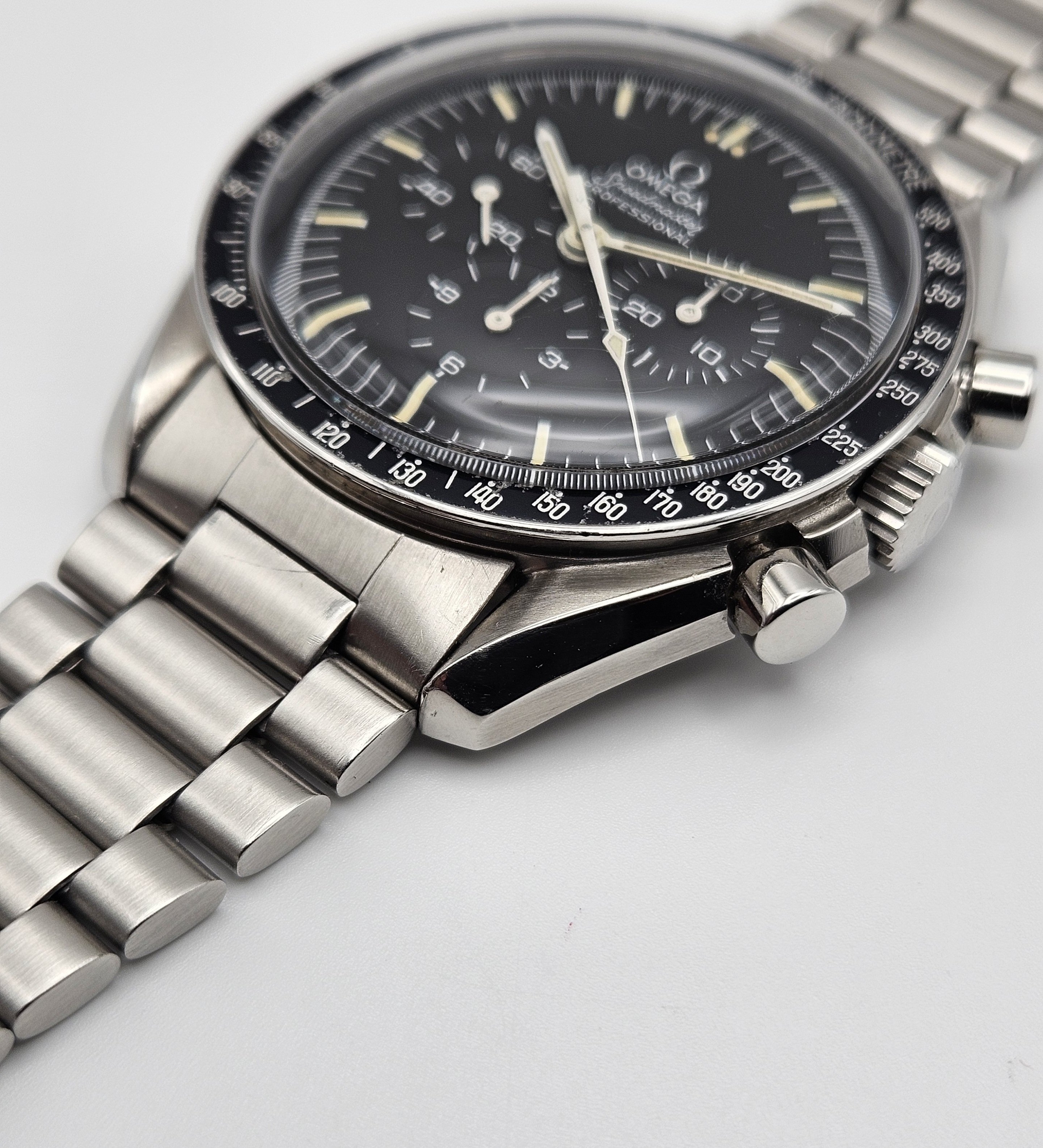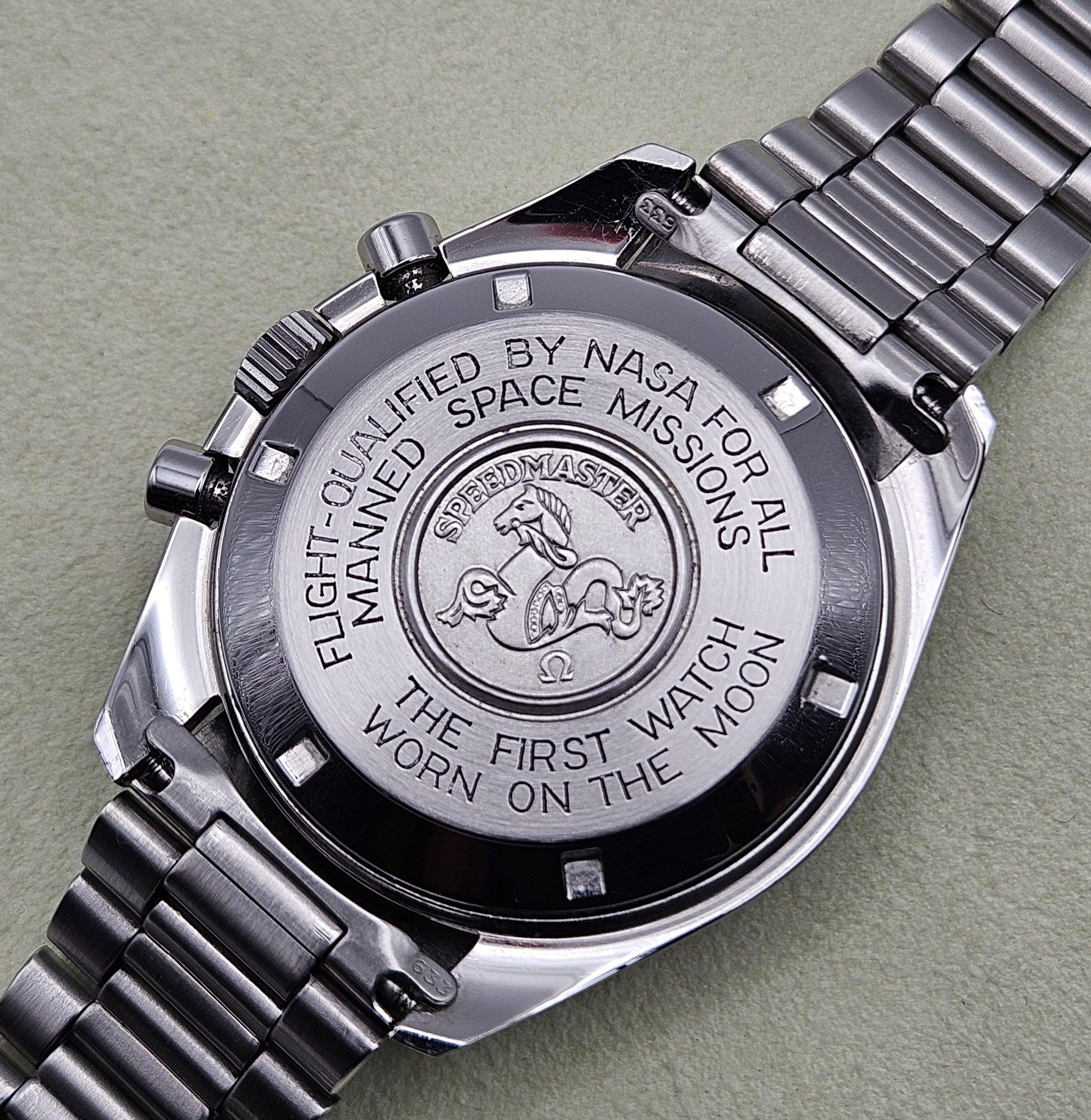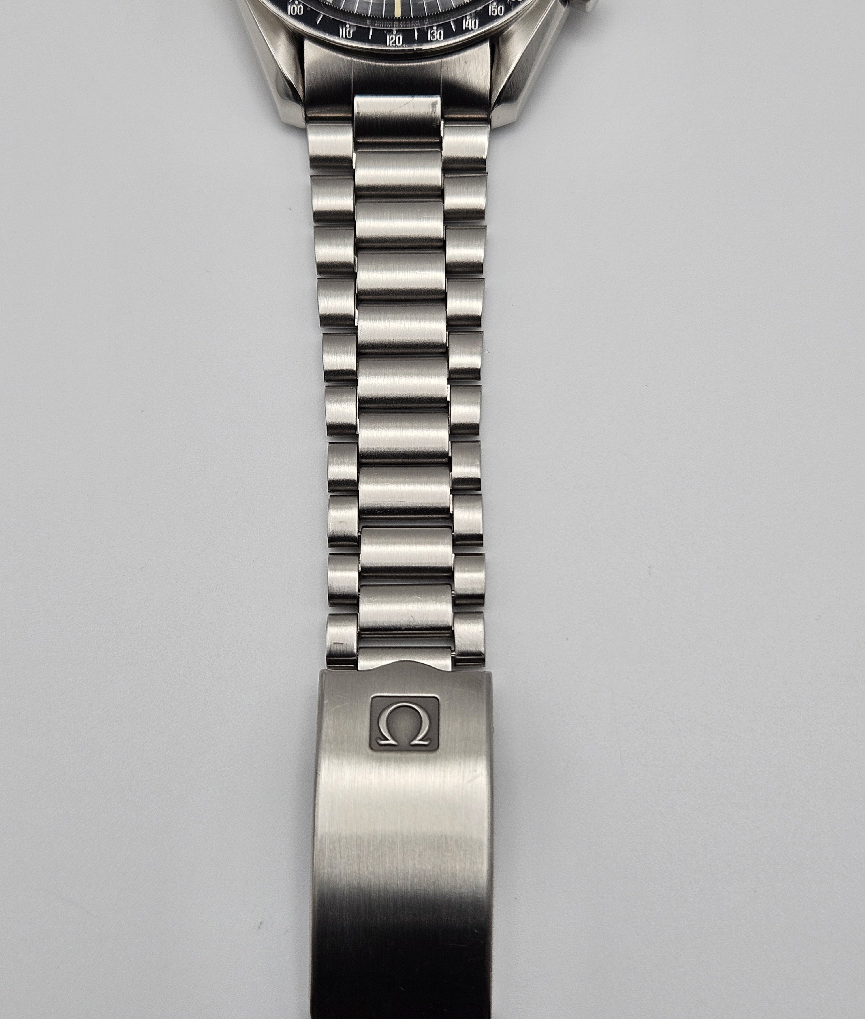 Aesthetic Condition: No major scratches or gouges in/on the Hesalite crystal. The Omega symbol is present on the crystal. The hour markers on the dial have developed a beautiful warm patina. The hands appear to be original behave similar to the lume on the dial when exposed to UV light. The case is in good condition for it’s age. As can be expected for a 40+ year old that's been carefully worn and enjoyed, there are some small hairline scratches and swirl marks on the case, and one small flea bite on the upper right lug. There are no dings or dents in/on the bezel. The bezel insert has some damage visible on the black enamel at the 70 & 75 tach markers. The caseback metal is in nice condition, no signs of any caseback tool slippage/scratches. There is some loss of enamel in the letters on the caseback. The 1171 bracelet is in good condition as well, with no major scratches on the links or clasp, and very little sag when held horizontally.