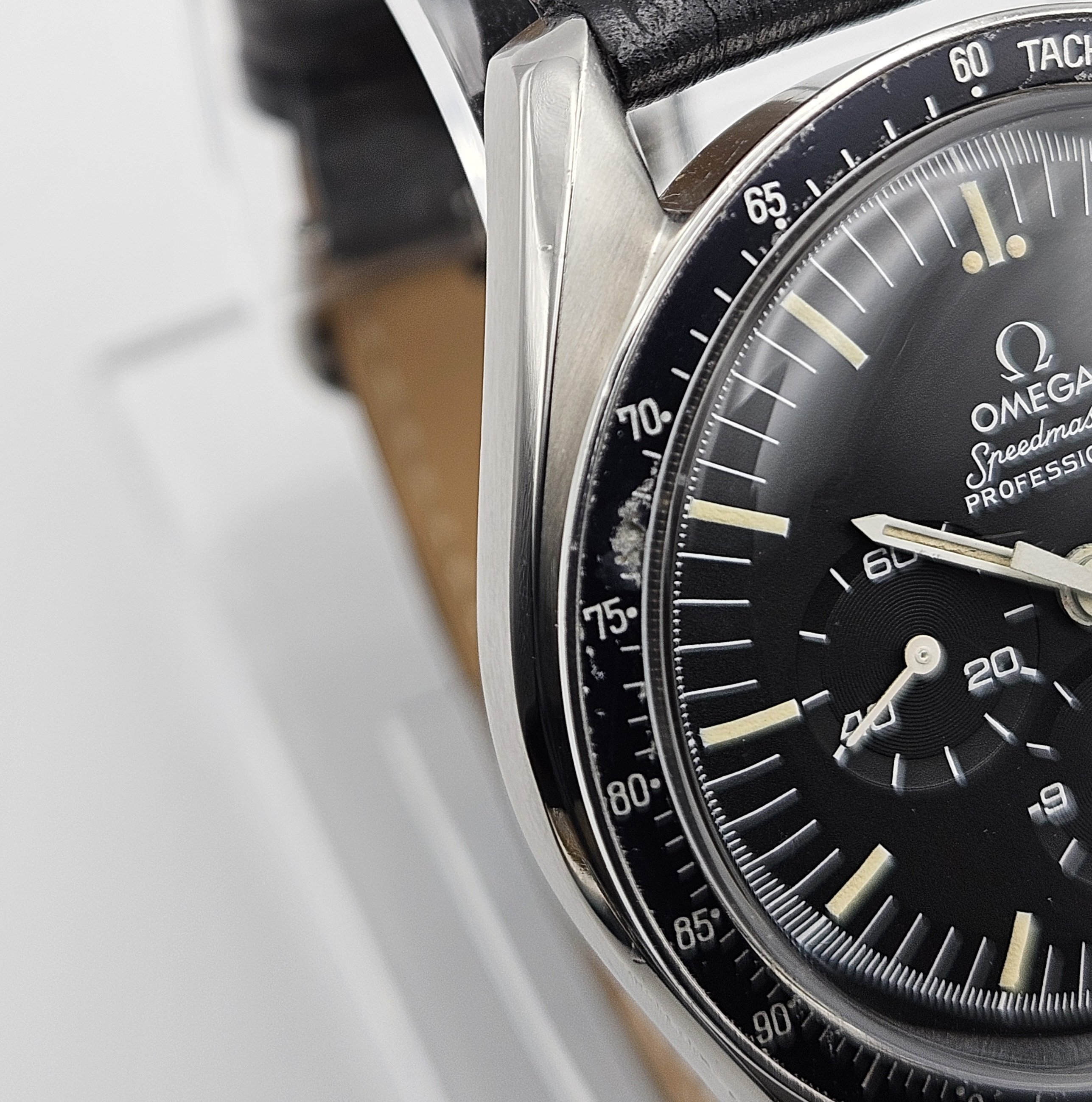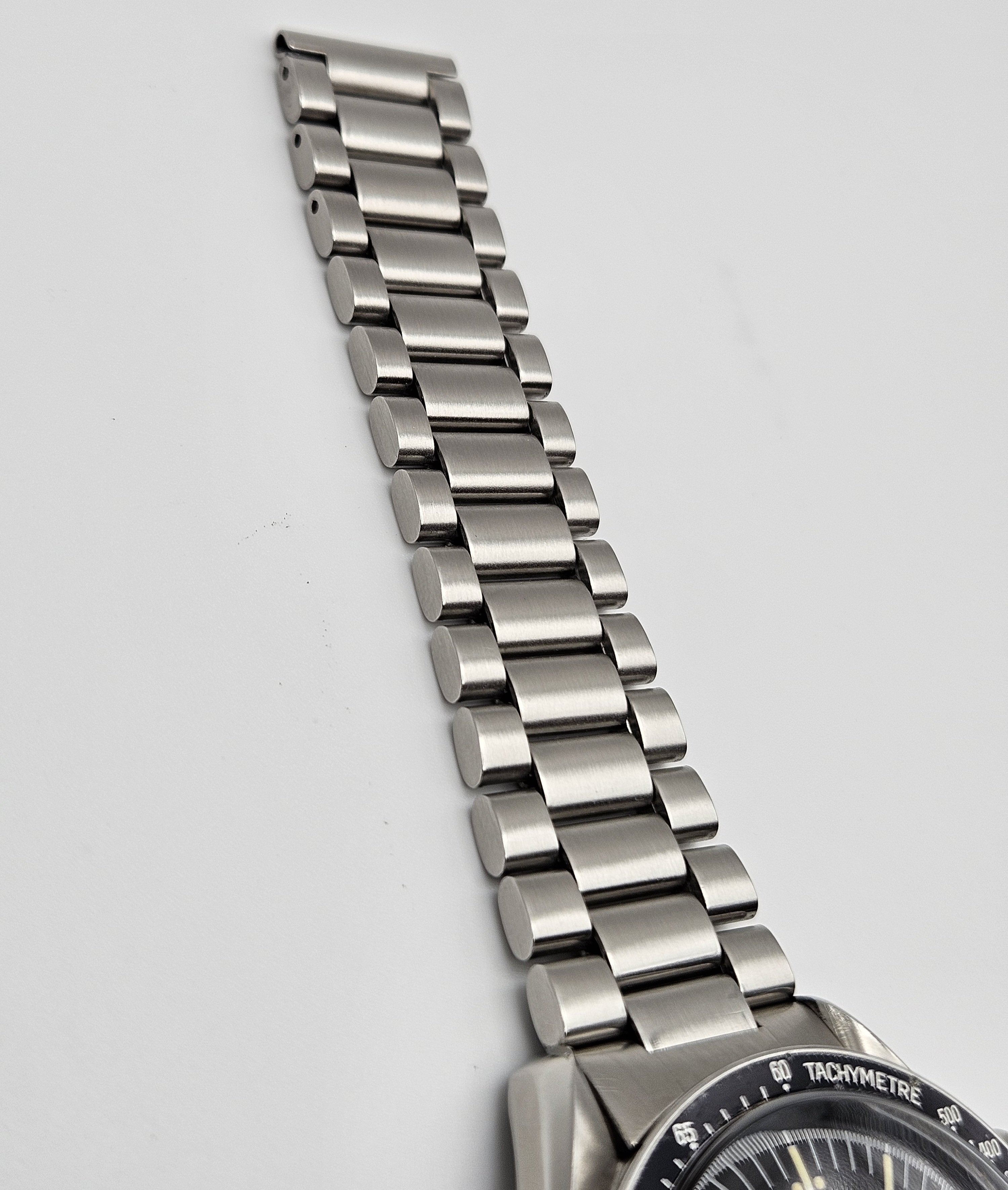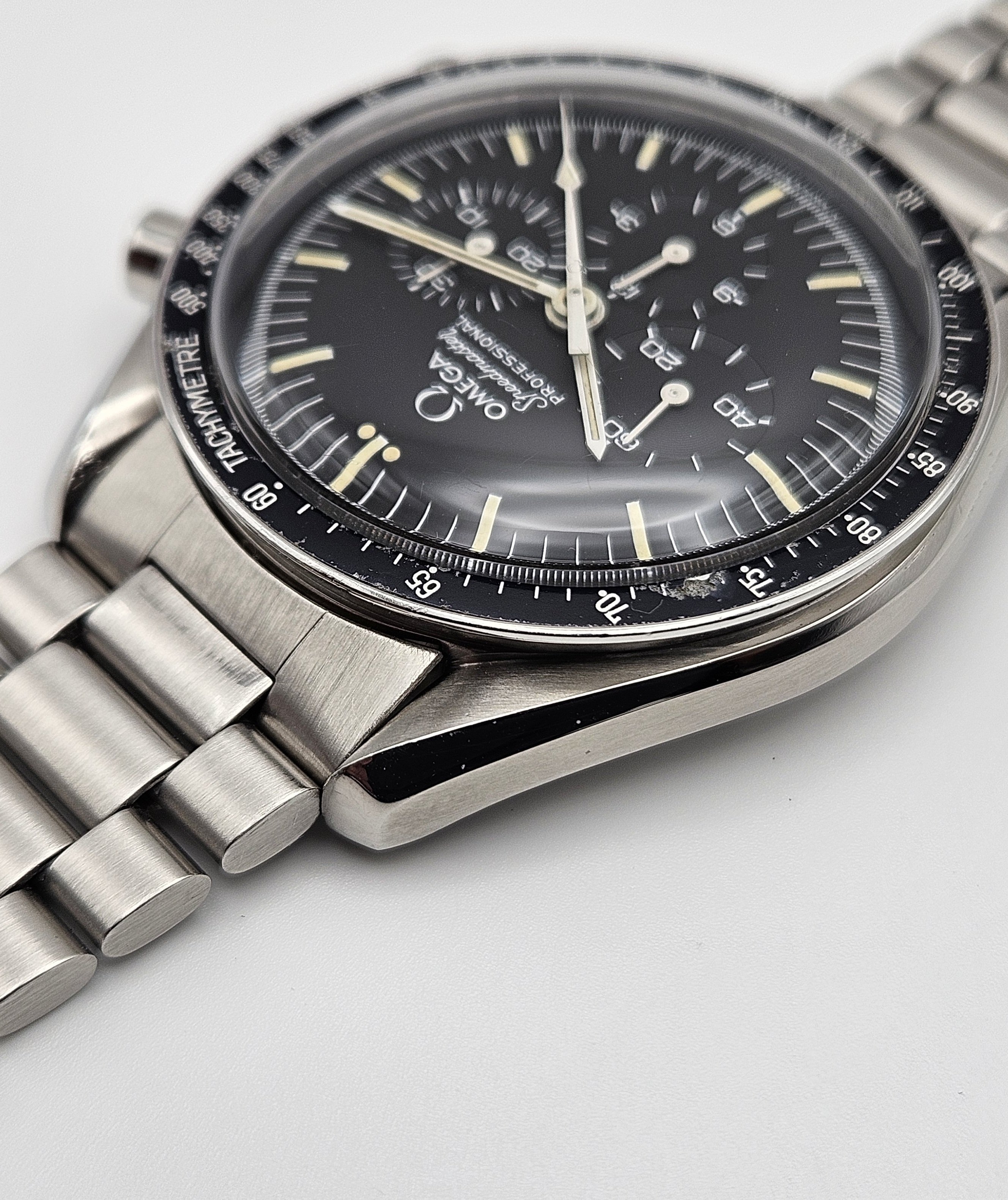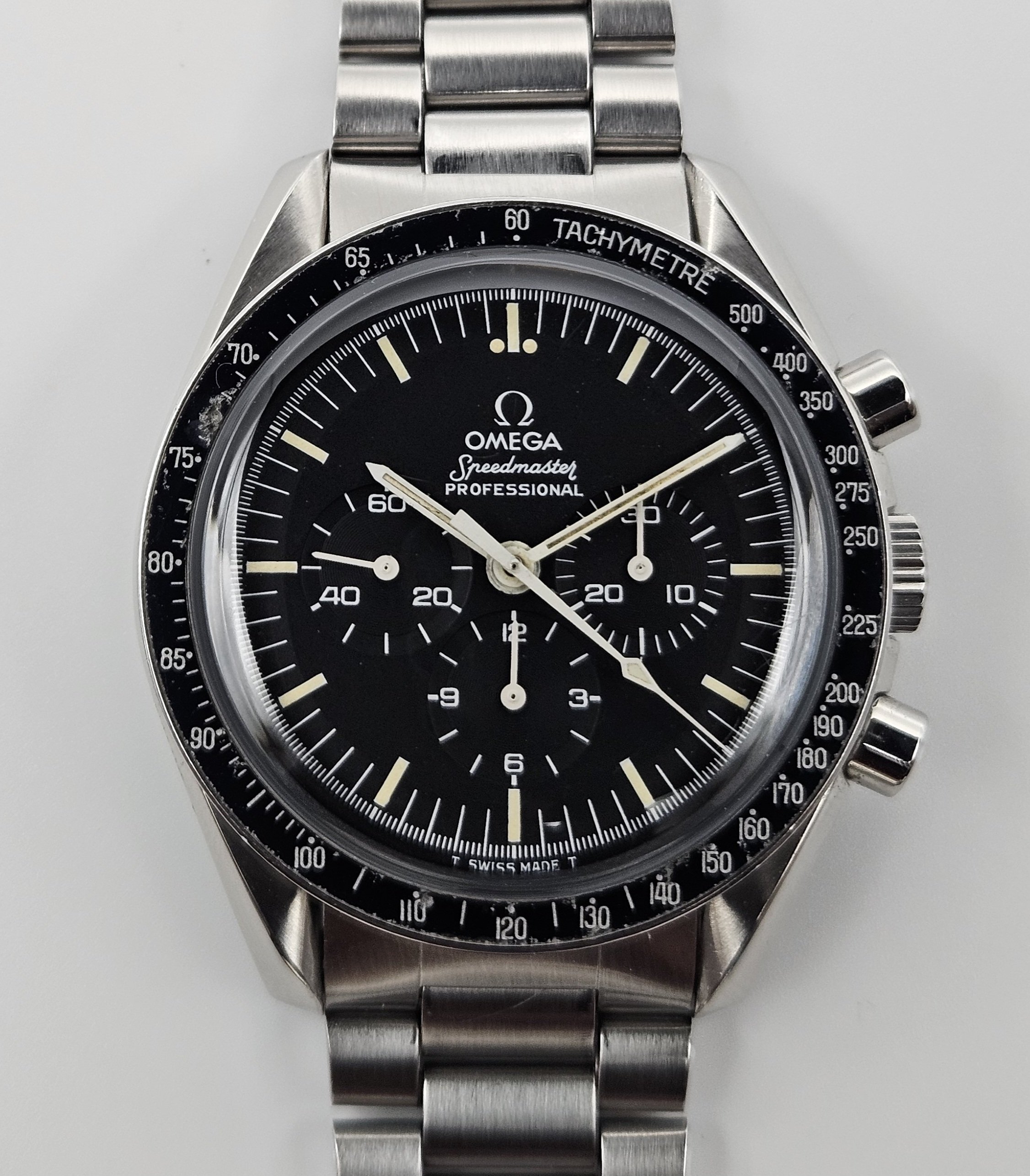 Aesthetic Condition: No major scratches or gouges in/on the Hesalite crystal. The Omega symbol is present on the crystal. The hour markers on the dial have developed a beautiful warm patina. The hands appear to be original behave similar to the lume on the dial when exposed to UV light. The case is in good condition for it’s age. As can be expected for a 40+ year old that's been carefully worn and enjoyed, there are some small hairline scratches and swirl marks on the case, and one small flea bite on the upper right lug. There are no dings or dents in/on the bezel. The bezel insert has some damage visible on the black enamel at the 70 & 75 tach markers. The caseback metal is in nice condition, no signs of any caseback tool slippage/scratches. There is some loss of enamel in the letters on the caseback. The 1171 bracelet is in good condition as well, with no major scratches on the links or clasp, and very little sag when held horizontally.