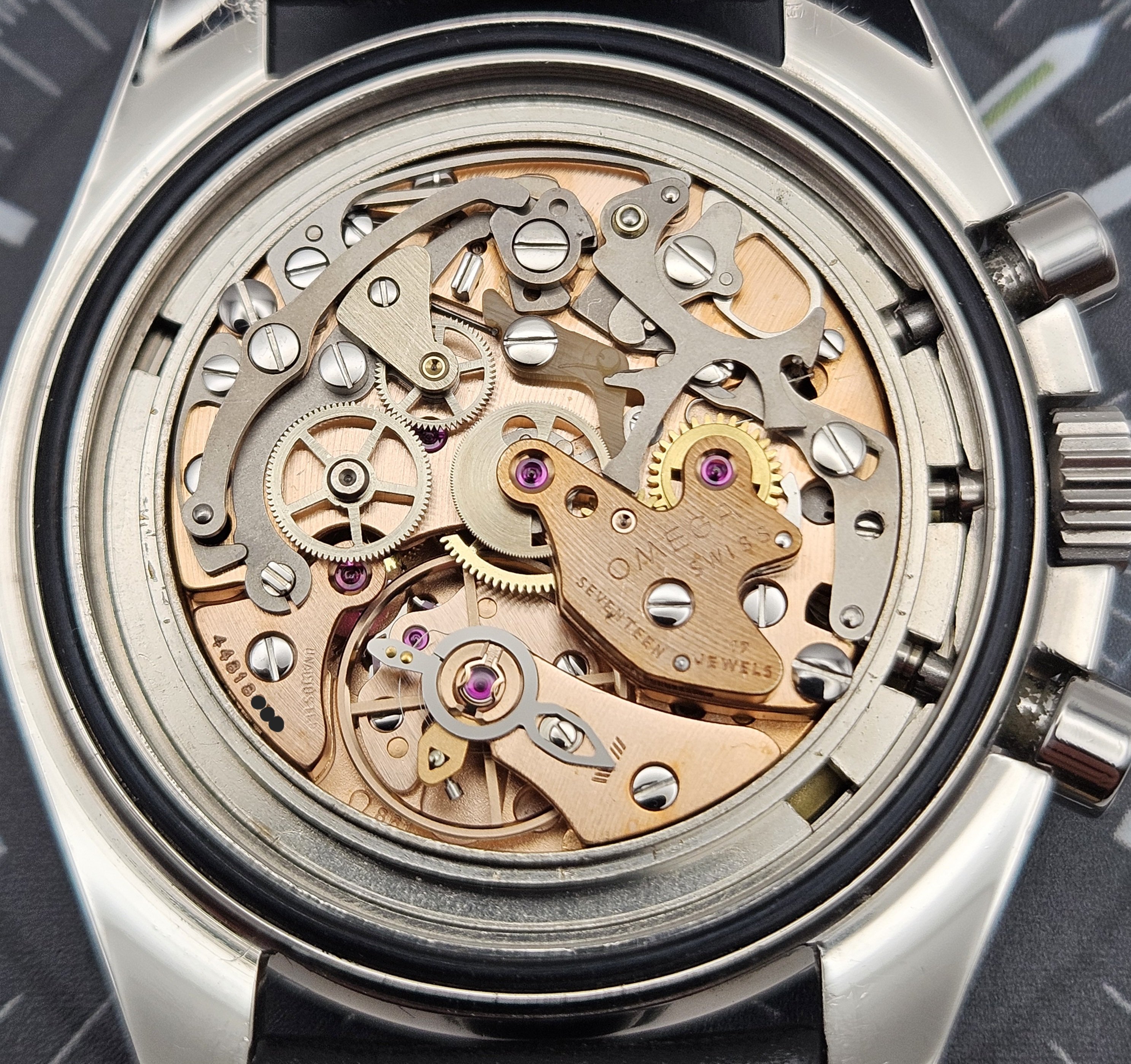 Period Correct Components: This example checks all the boxes for period correct components as defined by Moonwatch Only, starting with the serial # on caliber 861 movement, dial, bezel, tritium hands, caseback, crown, pushers, and bracelet.