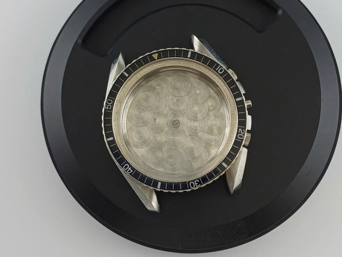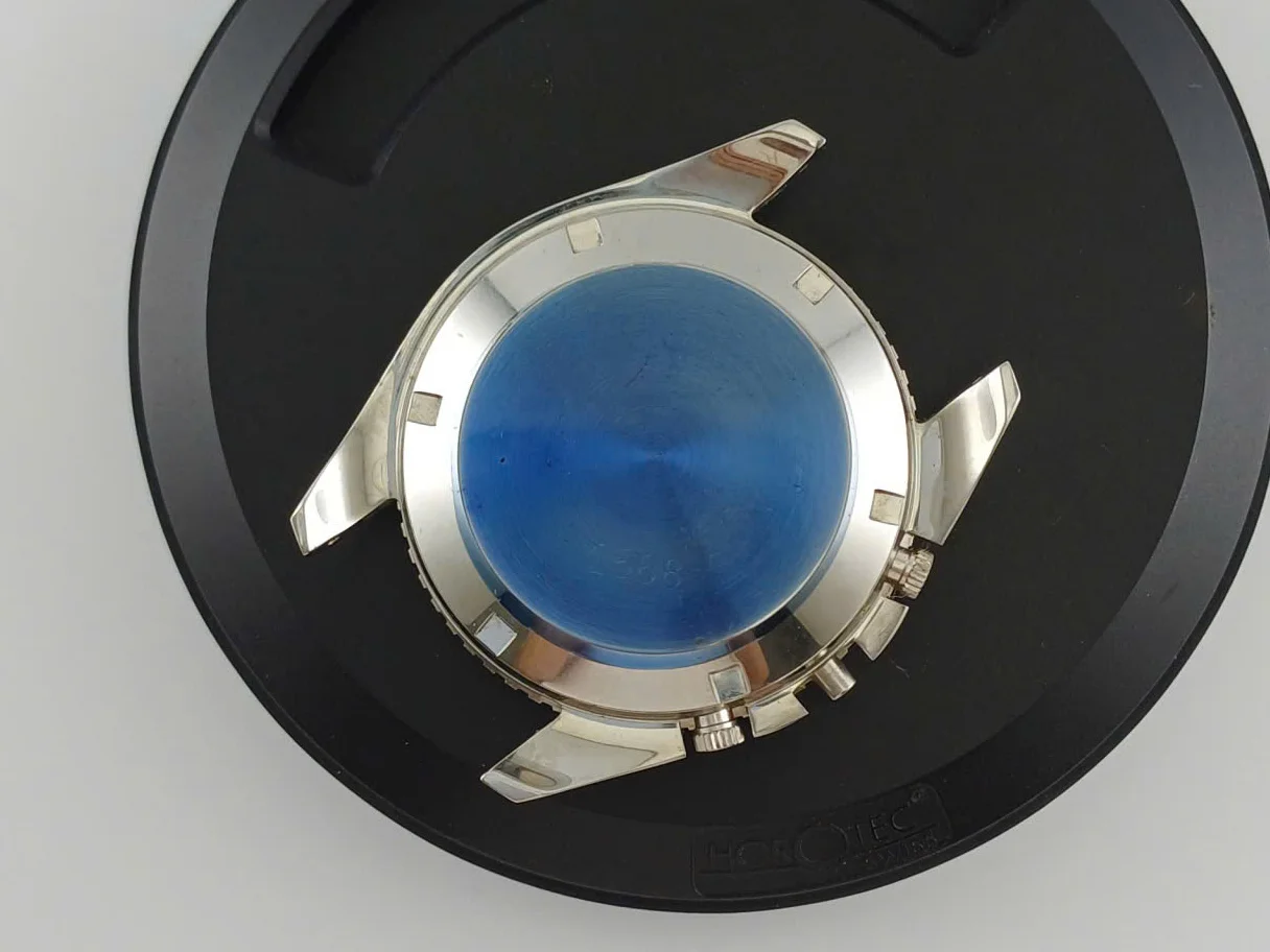 ·Years back, I know that people online were selling these odd speedmaster-style alleged Omega prototype cases made by HF. I’m aware that they were made for the Valjoux 7734 and that subsequent scholarship has revealed that these were actually prototype cases for a Doxa model.