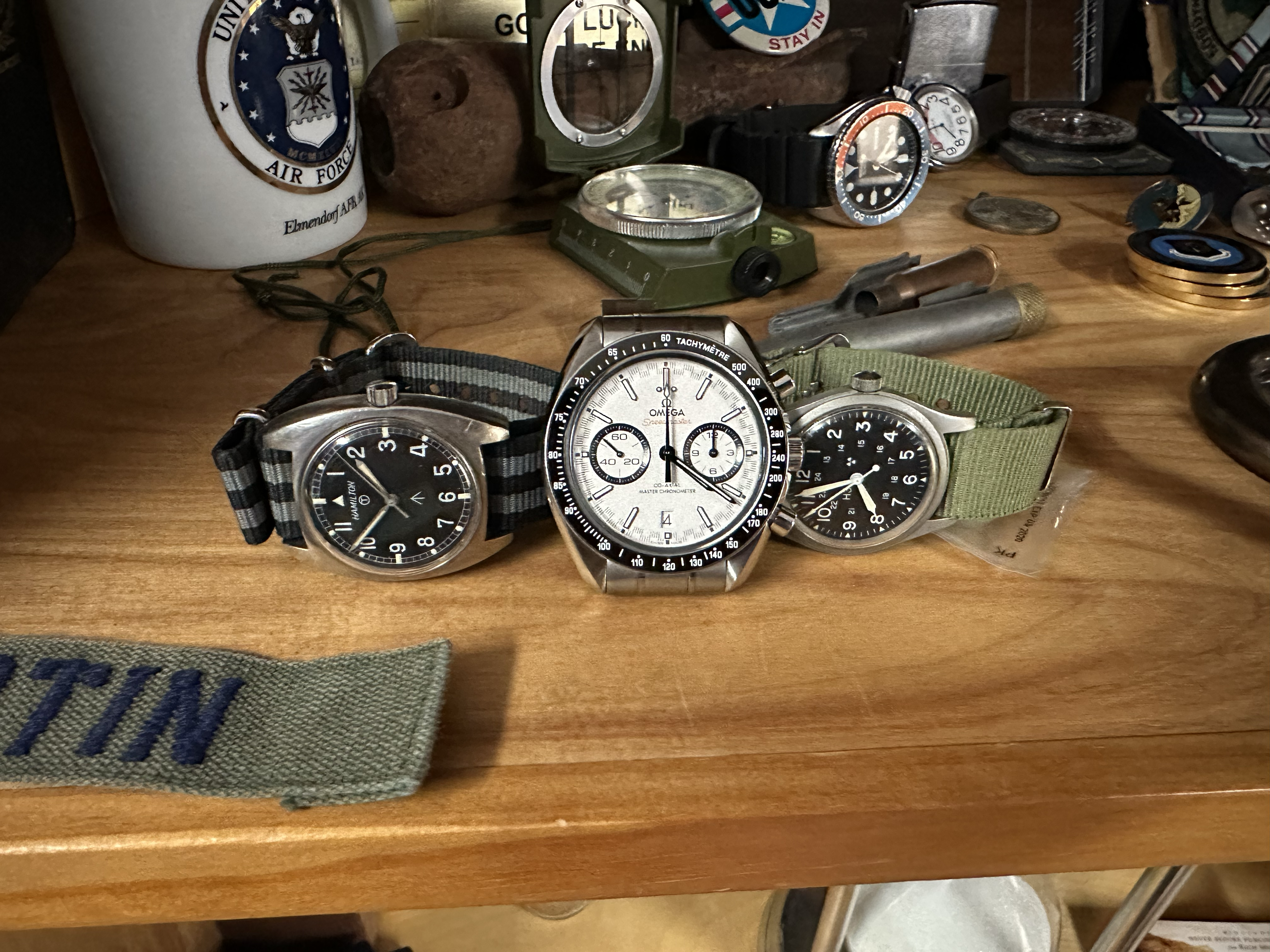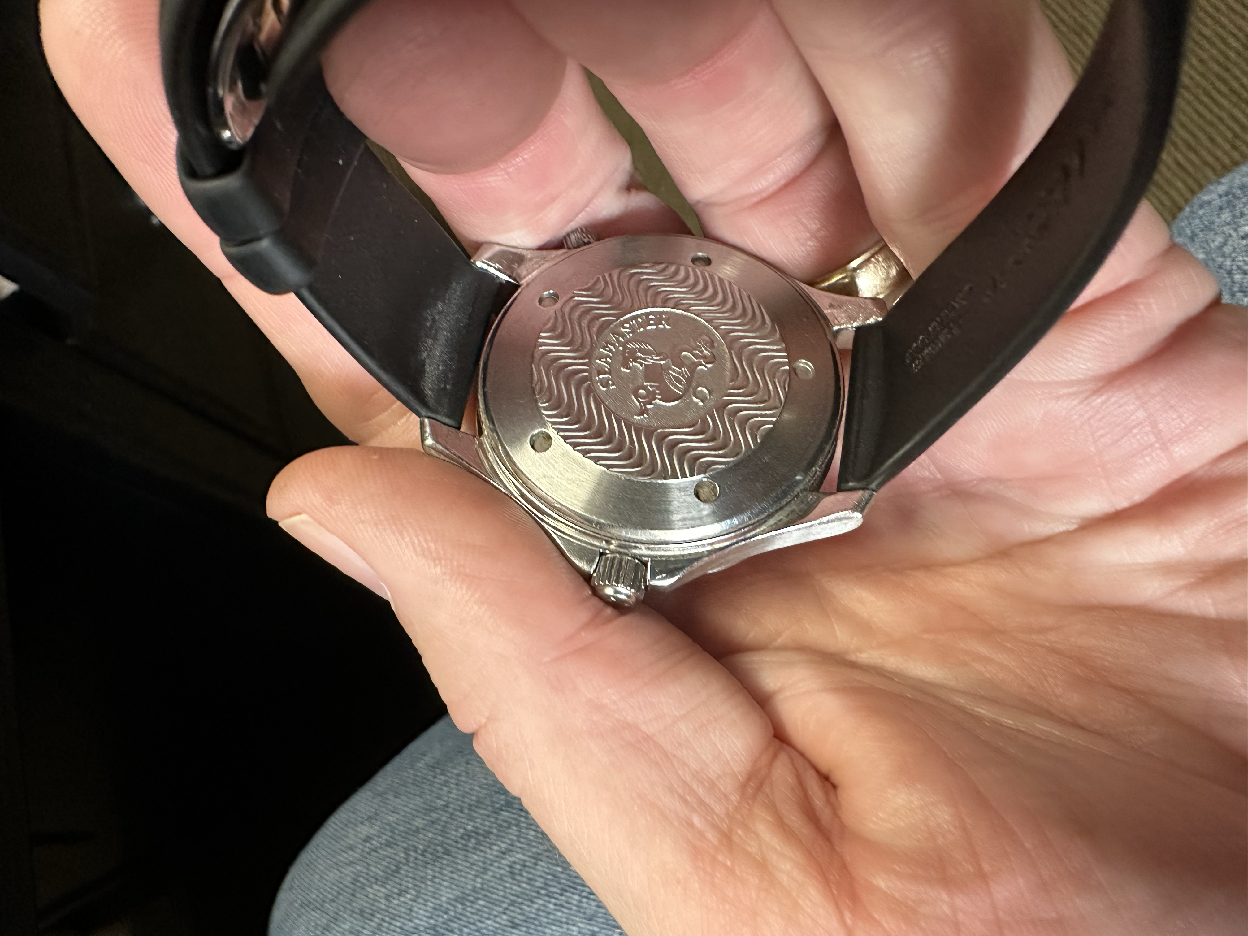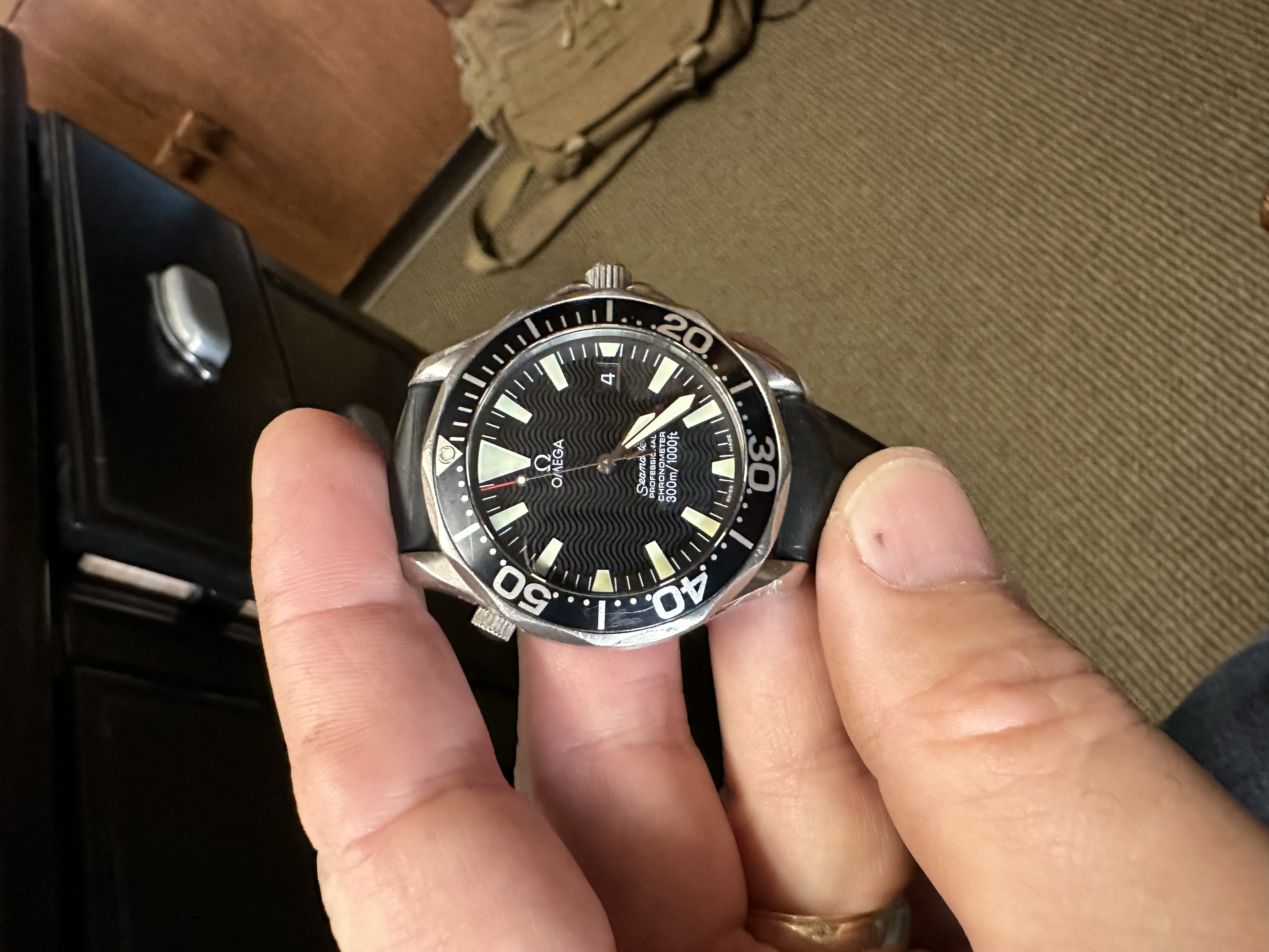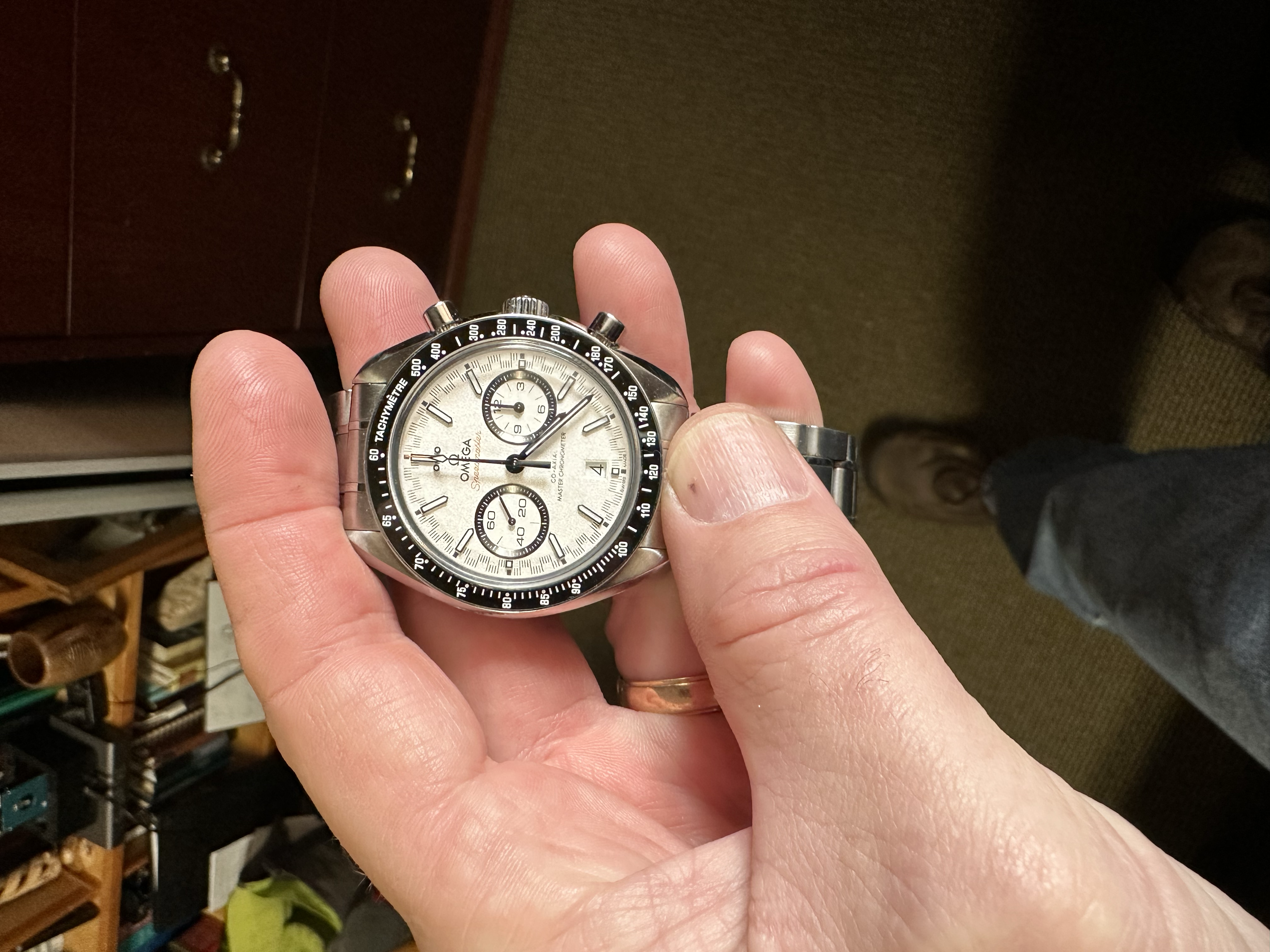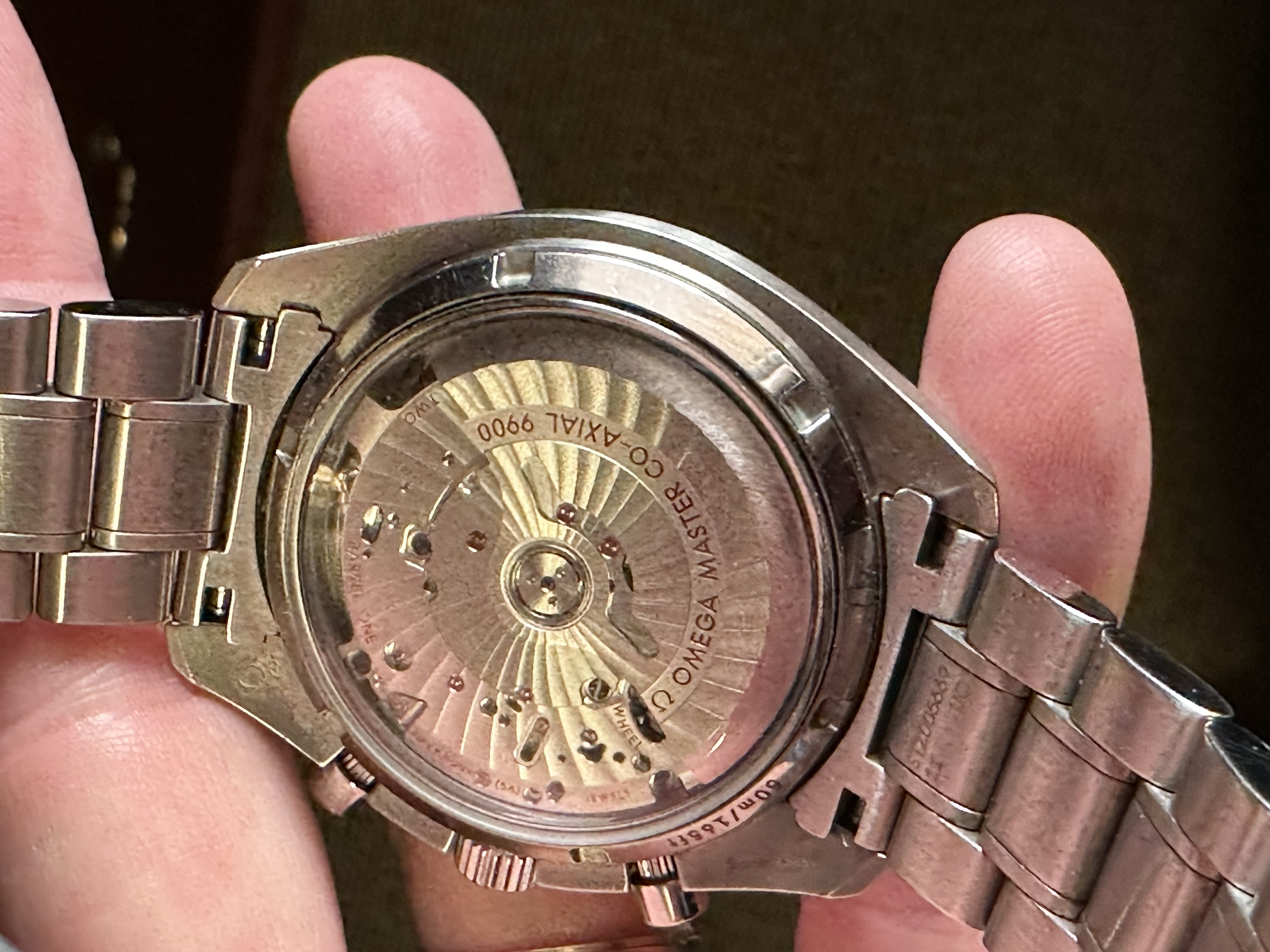 The Seamaster Pro has scratches on the lugs from removing the strap. When I first looked I thought "someone is scratching the serial # off" but under a loop it is there and the scratches are on opposite lugs. Pocket knives destroy these things. Anyway, I hadn't been looking for the Speedmaster Racing Co-axial because they are normally way out of my range.