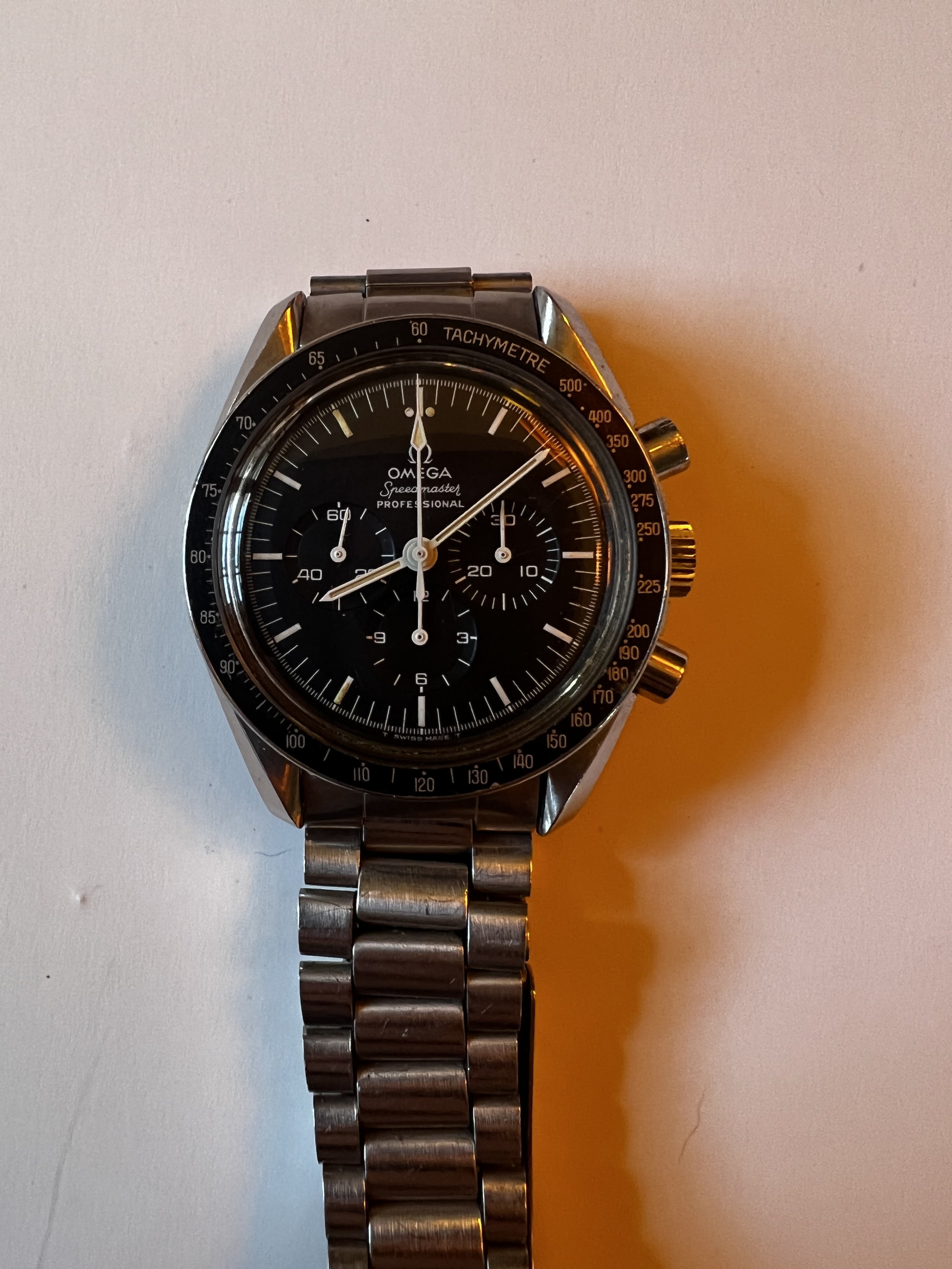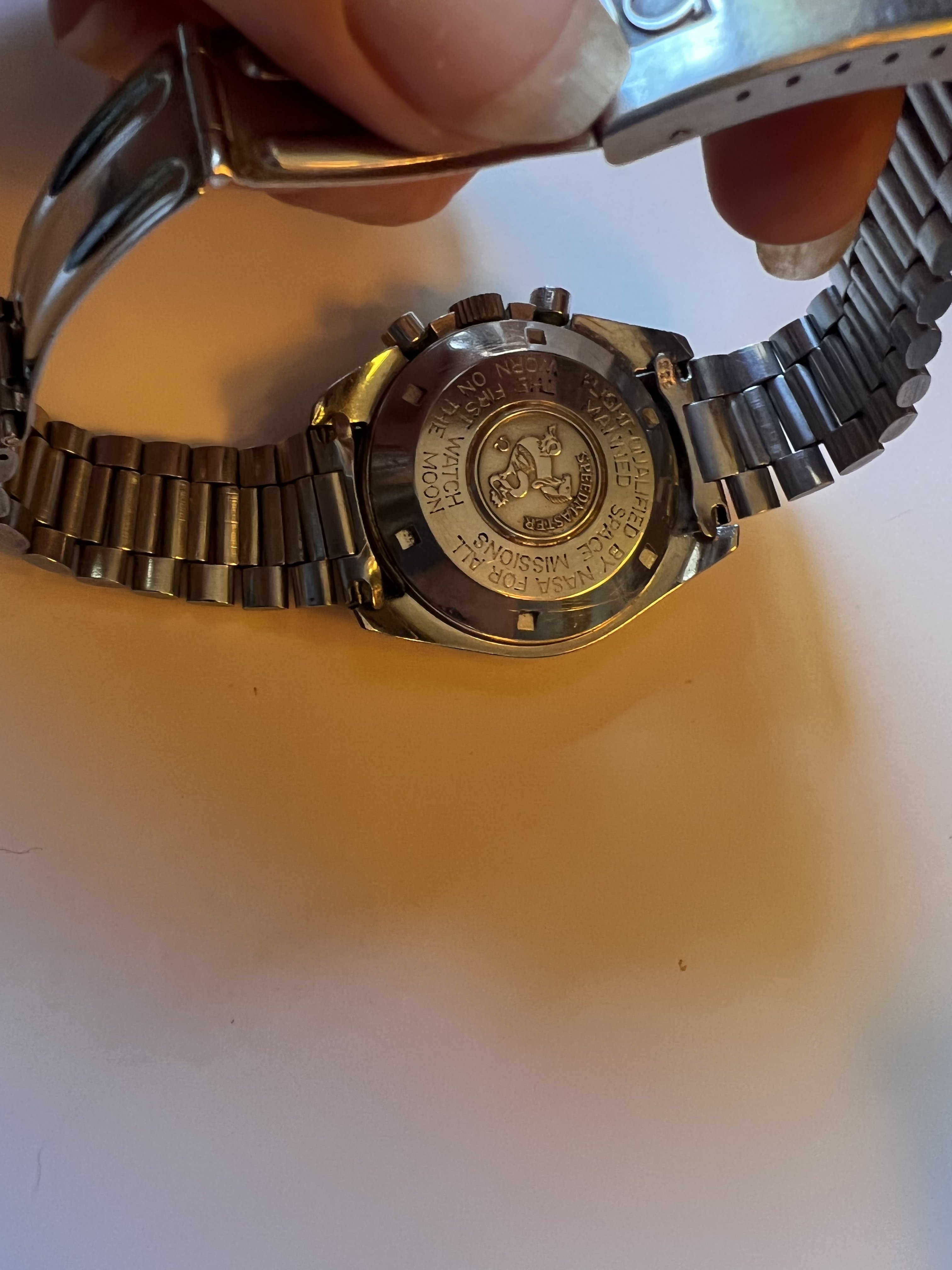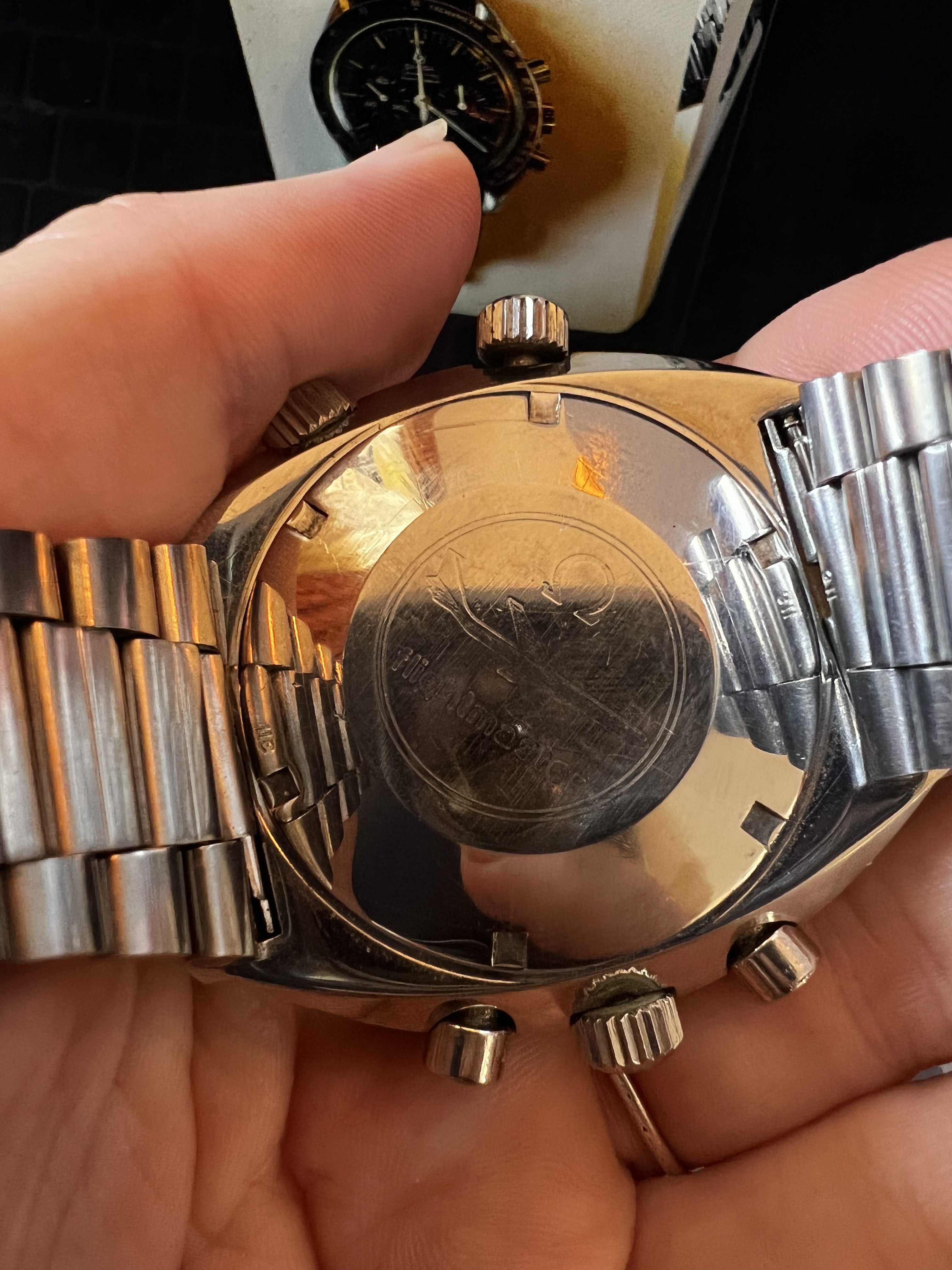 I’ll start with the Speedy Pros. Are you guys able to ID the models, and perhaps give a value estimate? She says both need work, and I assume neither has seen a full service in its life. The DON has the 1035(?) bracelet and seahorse-only caseback, and appears to be an embossed logo, not applied…145.022-6x? The other I find harder to date.