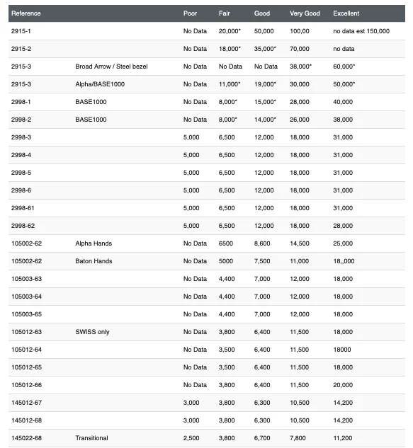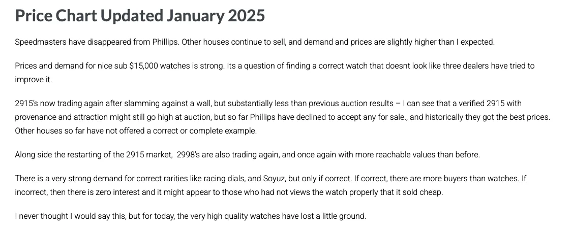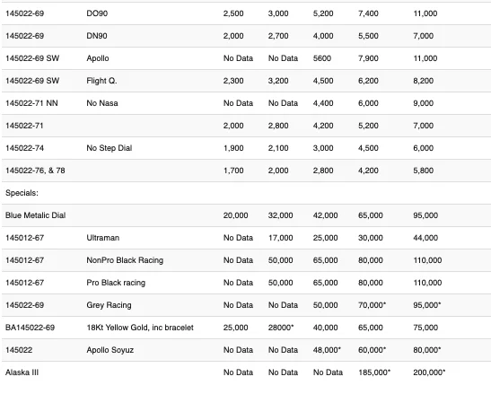 Posts 2,515 Likes 5,544 hansaboy ·Feb 9, 2025 Time again for some nice reading, thanks @Spacefruit !! https://speedmaster101.com/price-chart-2/
