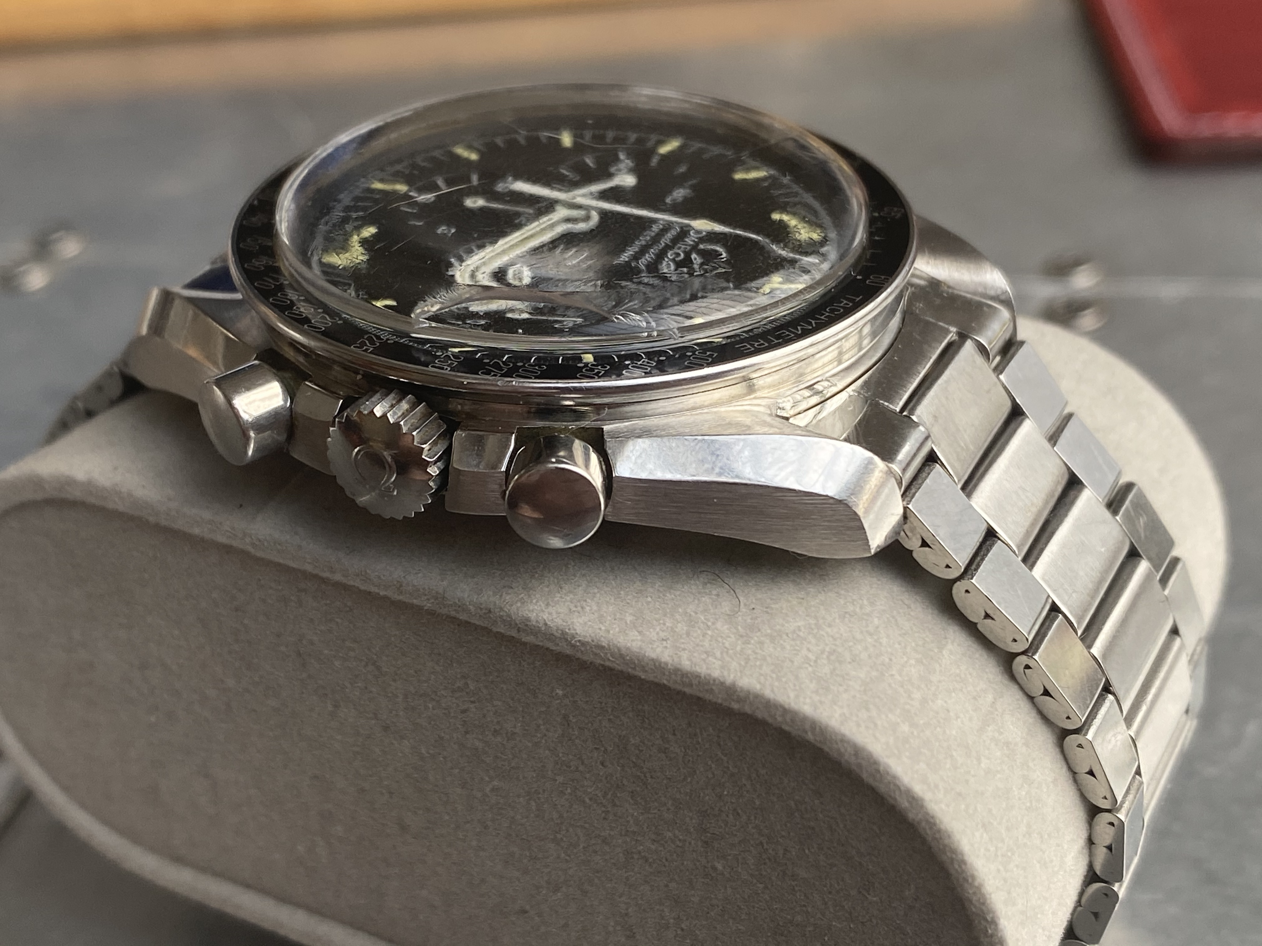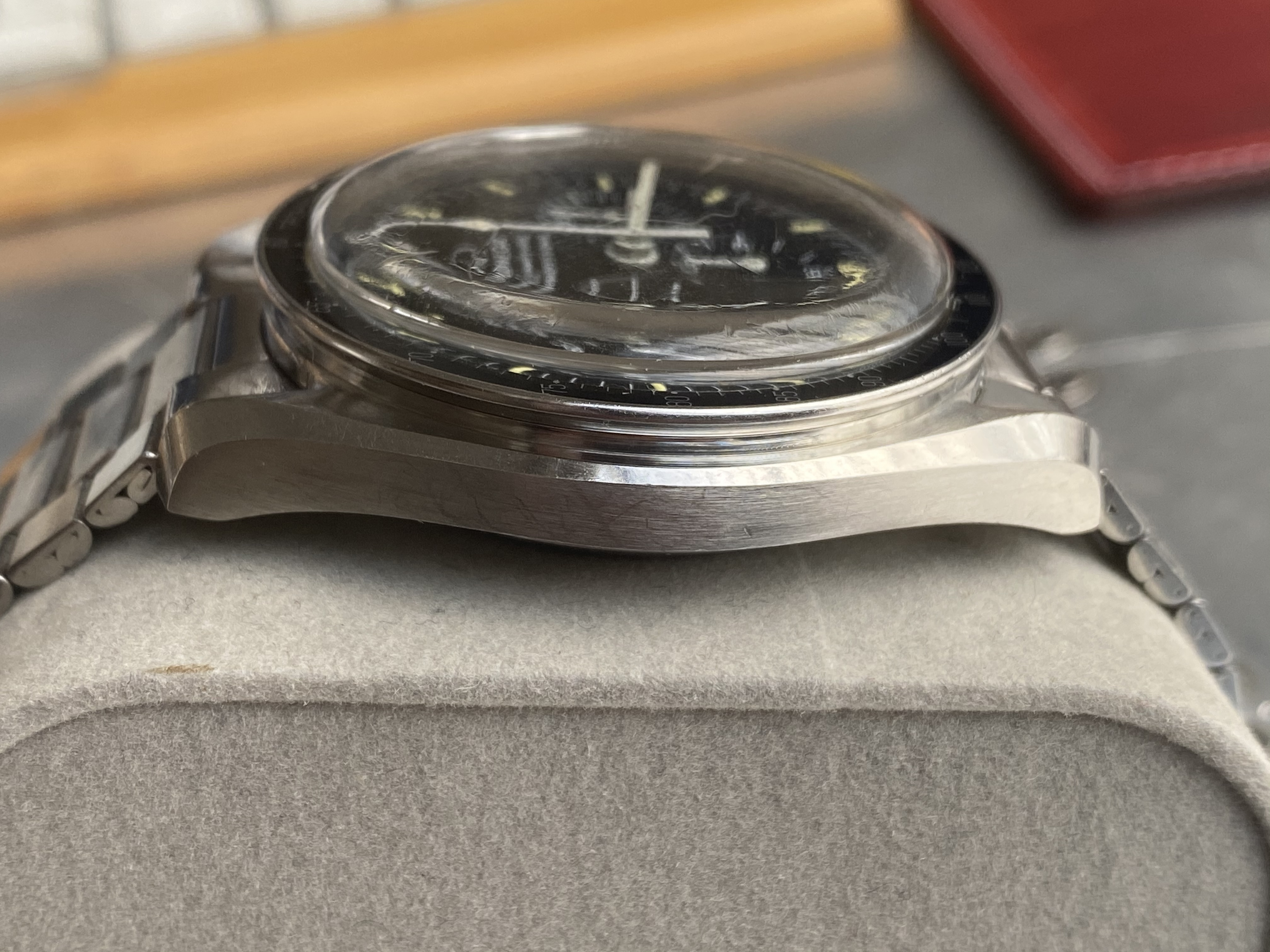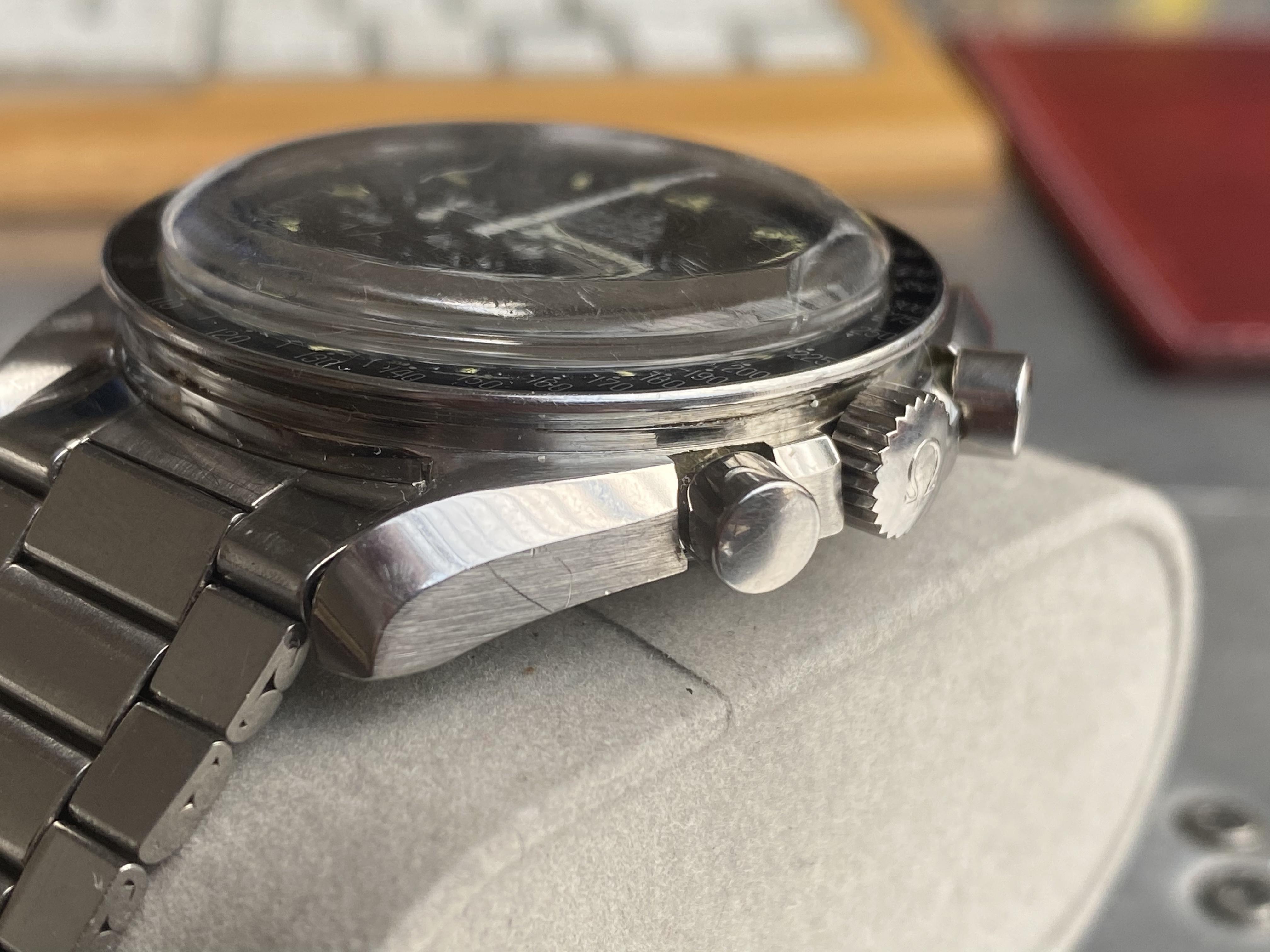 I have been spending more time than I should on trying to learn all the intricacies of the Speedmaster and have the sacred Moonwatch Only bible. When I saw this example I thought it ticked all the boxes, but I am sure that there is indeed potential for disappointment hidden in every golden cloud. I tried to really focus on condition this time around.