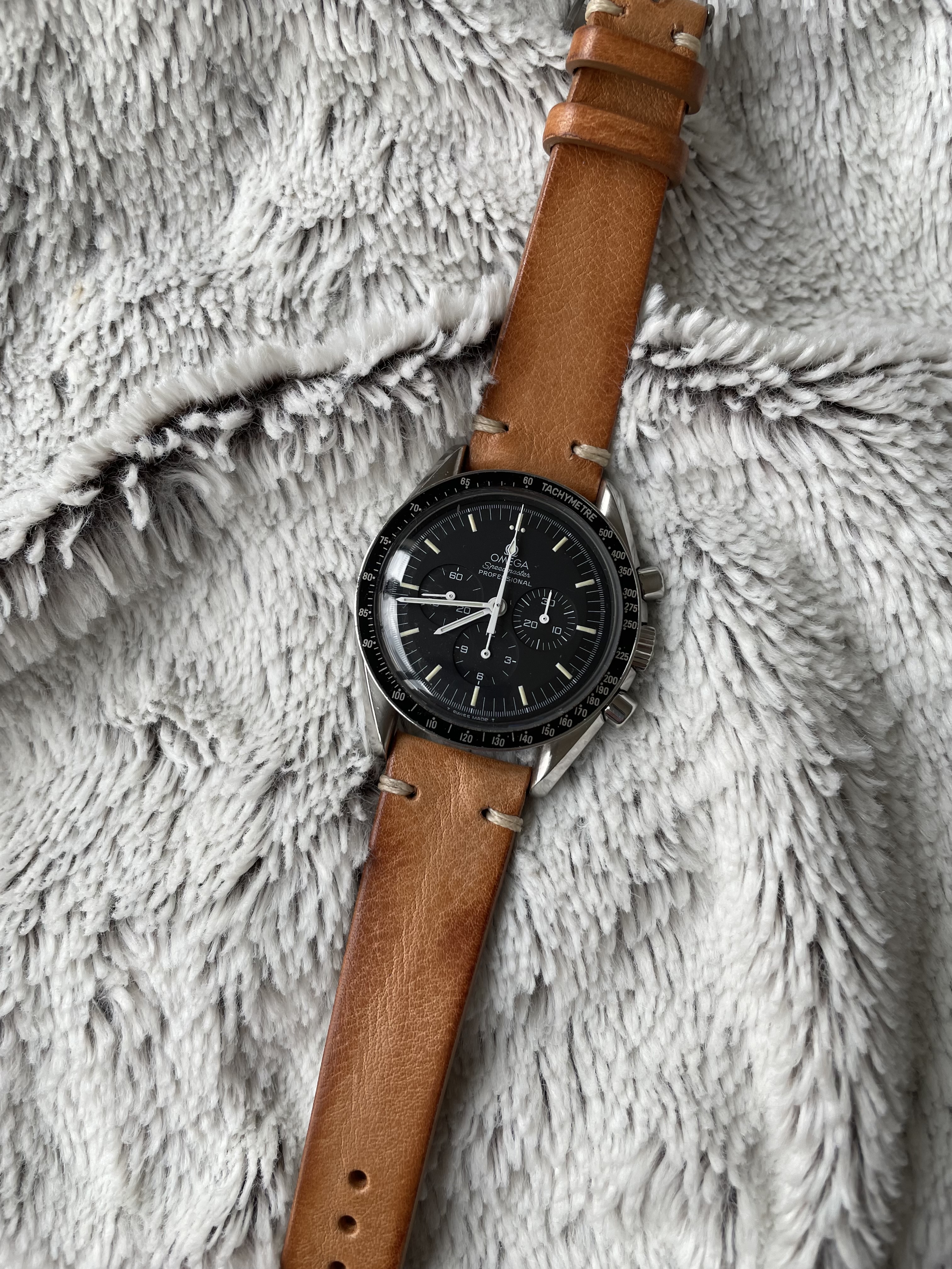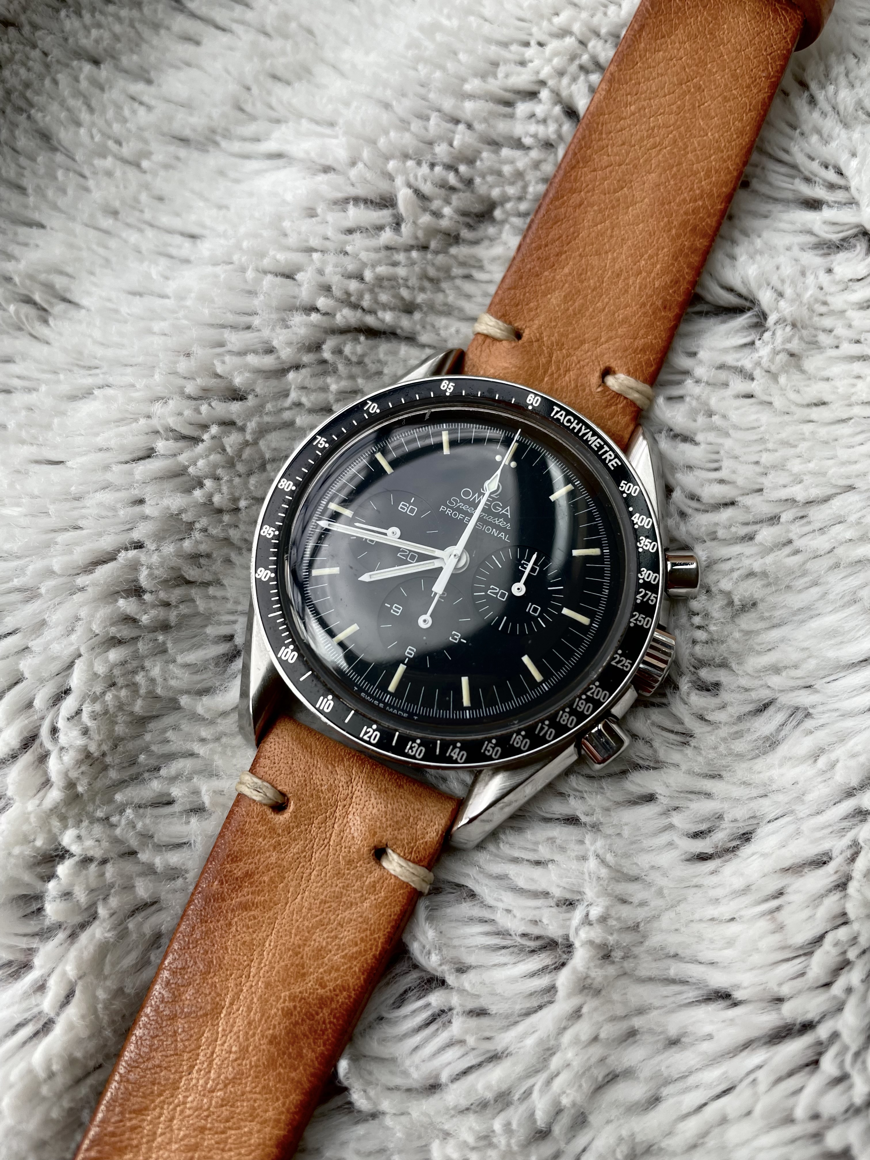 Recently put this sexy beast on a Bulang and Sons caramel colored leather strap after rocking the original janky, yet charming, bracelet for a few years. Absolutely loving the new look. Anybody else rocking leather with their Speedy?