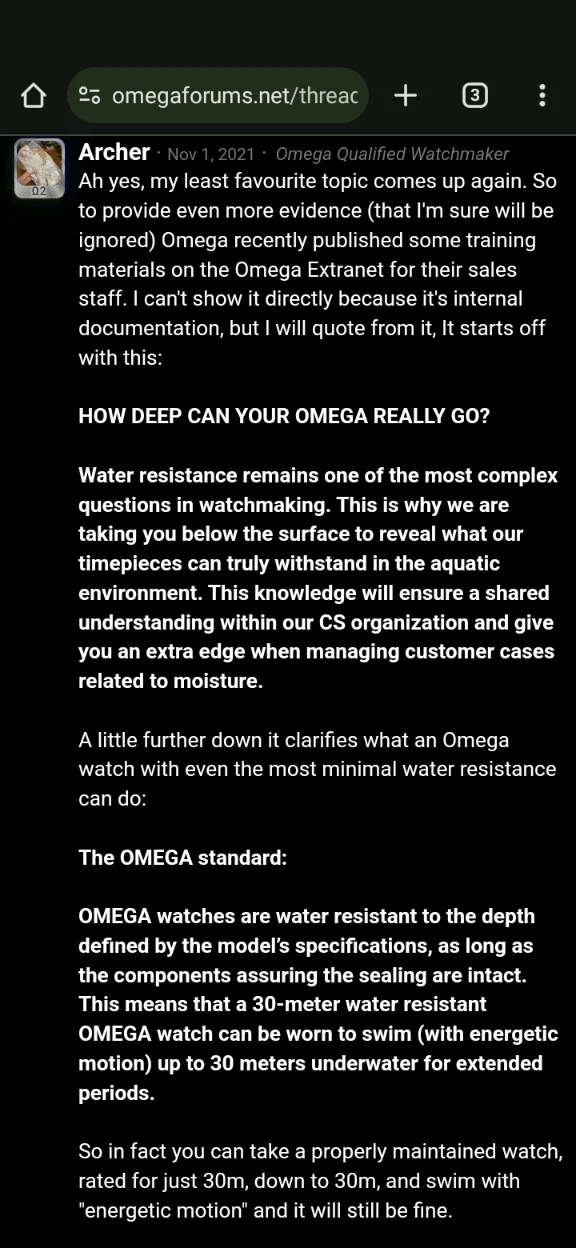 ie, according to Omega, if you're not testing & replacing those gaskets yearly, swimming might be dumb. My supposition is this is where people get into trouble: they don't get their watches tested yearly, the gaskets decay, they get water in, then call the spec BS