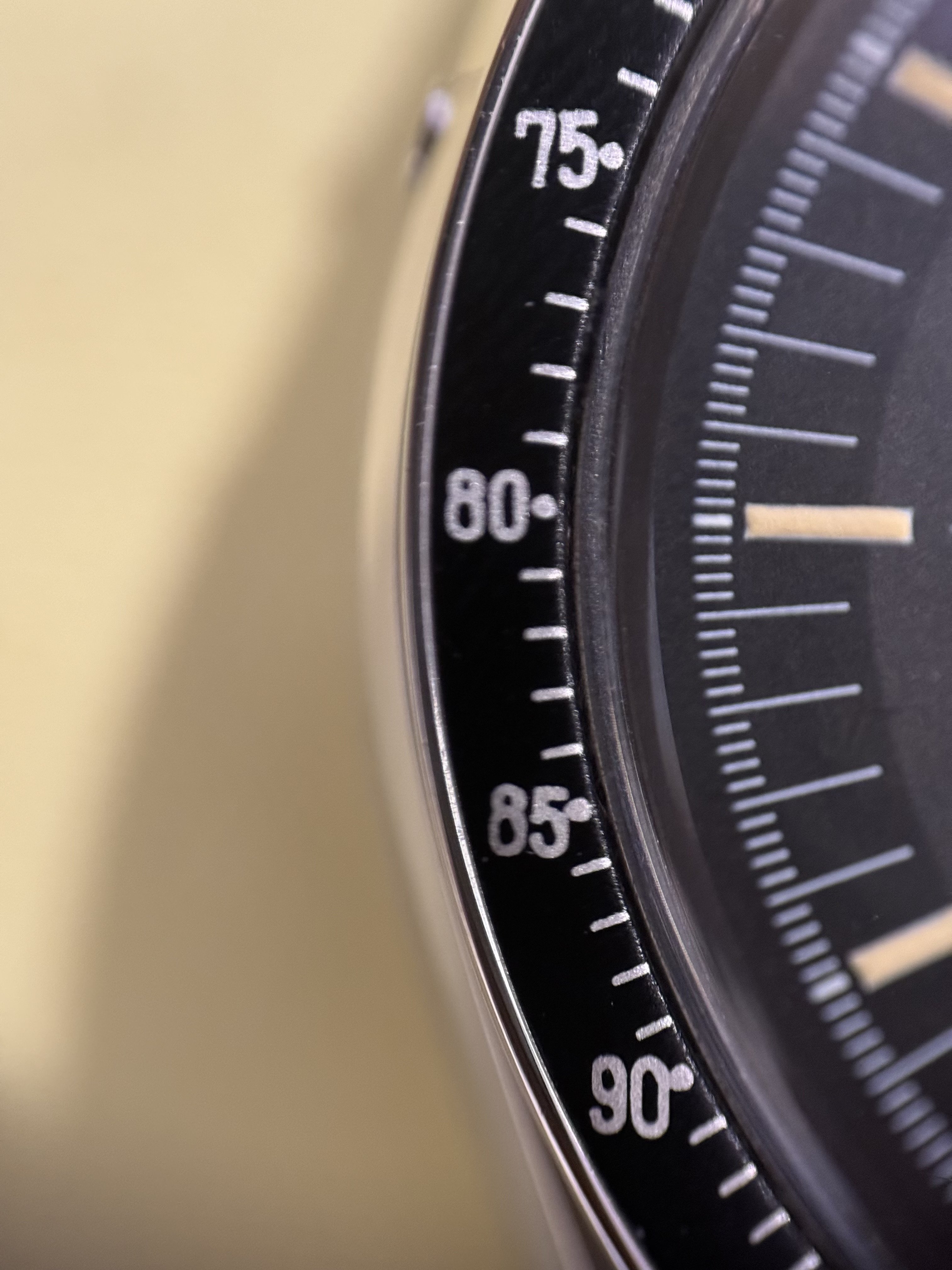 There is variation in the crispness of bezel printing, particularly before the 1990s but this one is too blurry for me. Whether legit or otherwise, it doesn't look great. 80, 85, 140, 150 are very poor. Compare the private seller examples you found from the same era, much better.