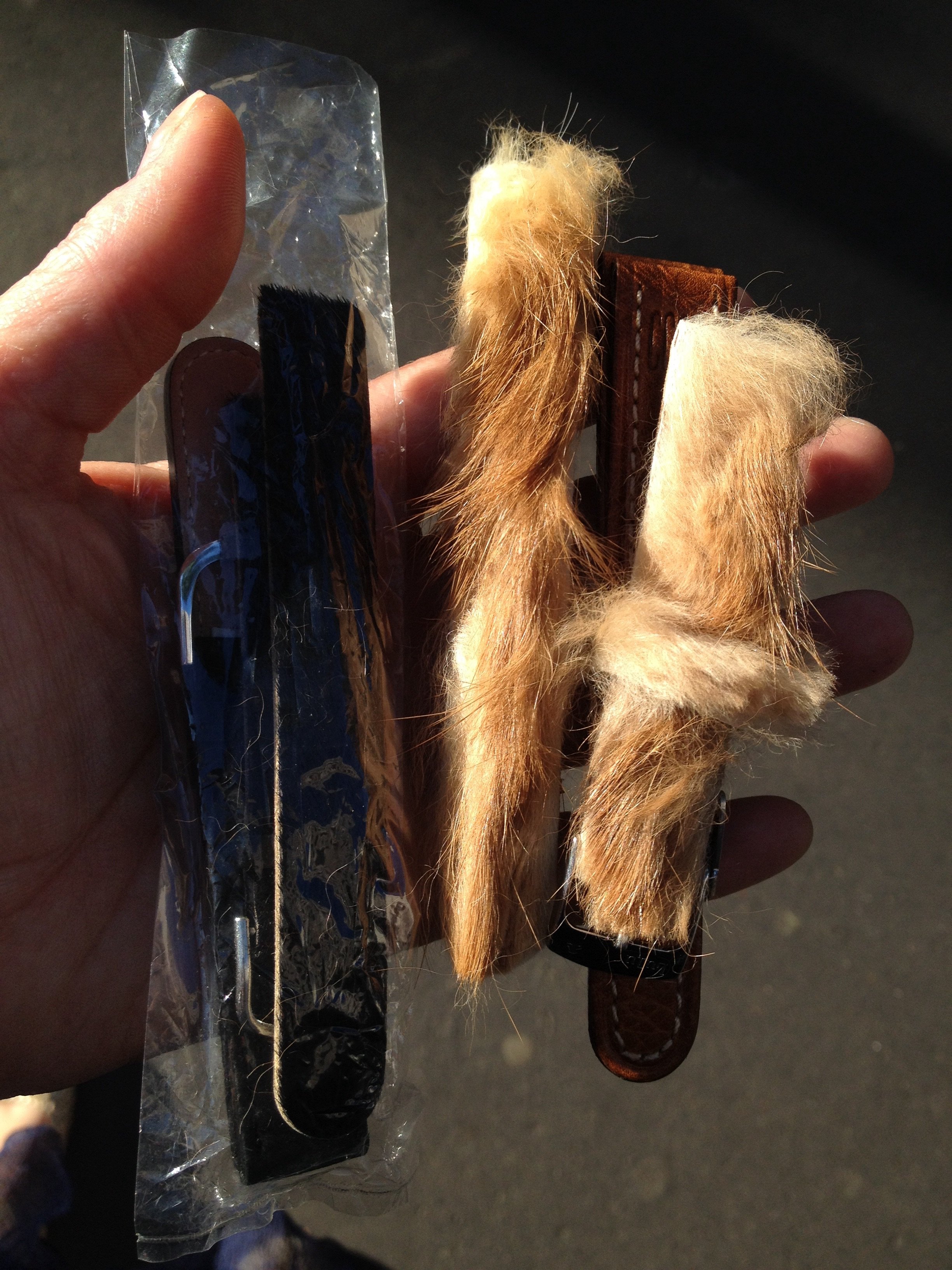 路Today my watchmaker gave me lots of weird goodies. A 16mm cow skin strap.... An 18mm USSR strap (marked CCCP)... And this furry 18mm which he says is very bad for mechanical watches. Great.