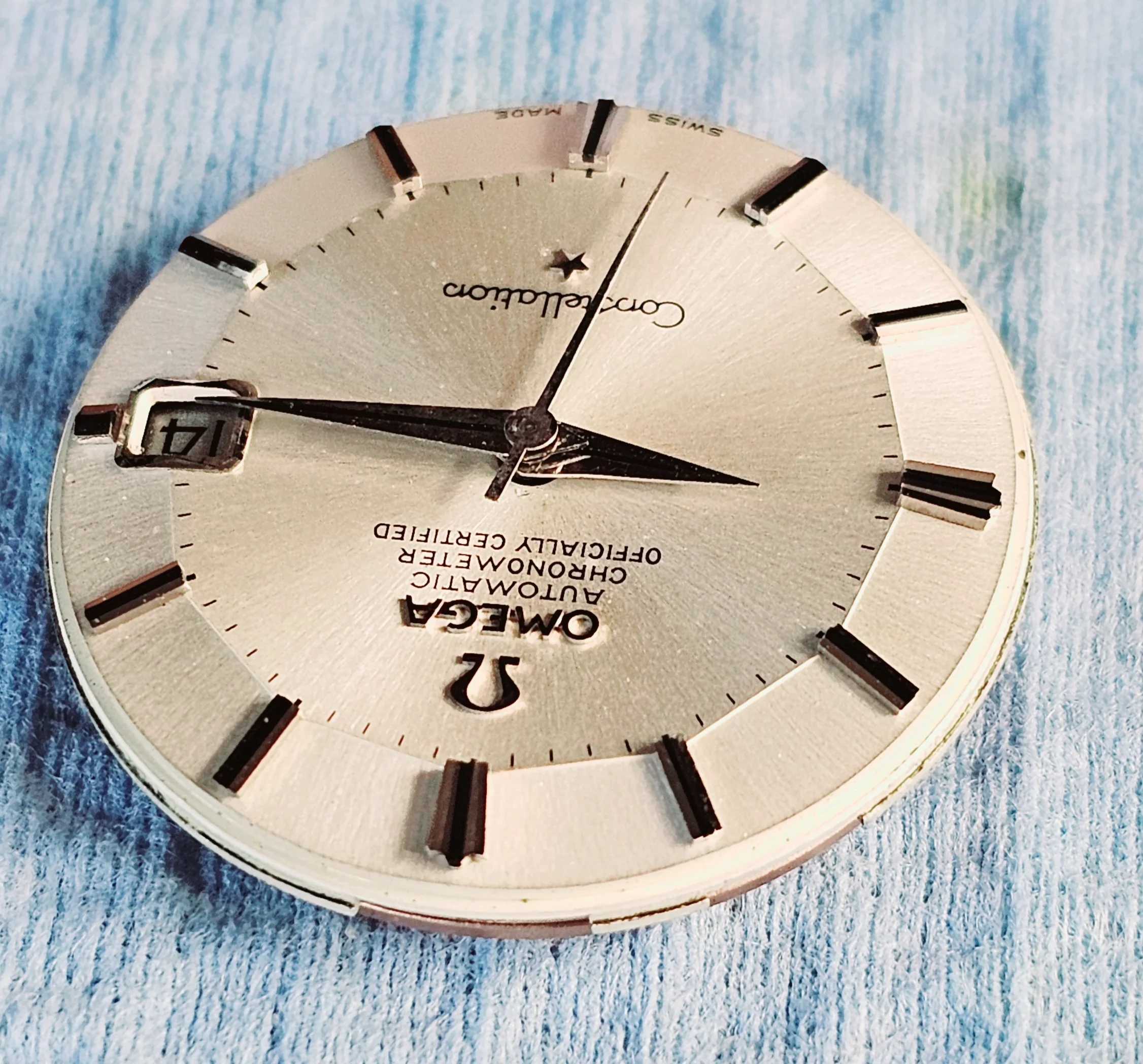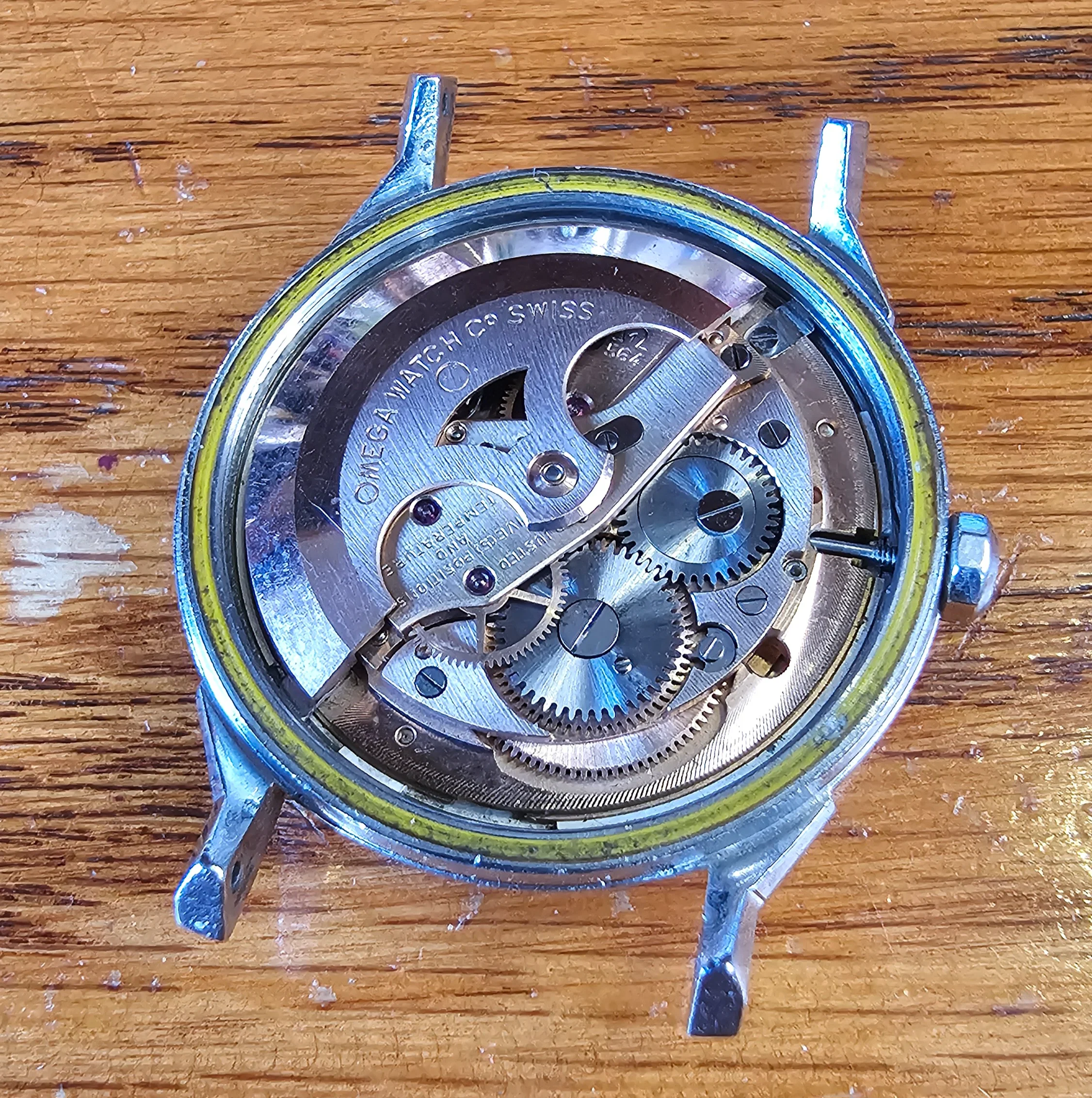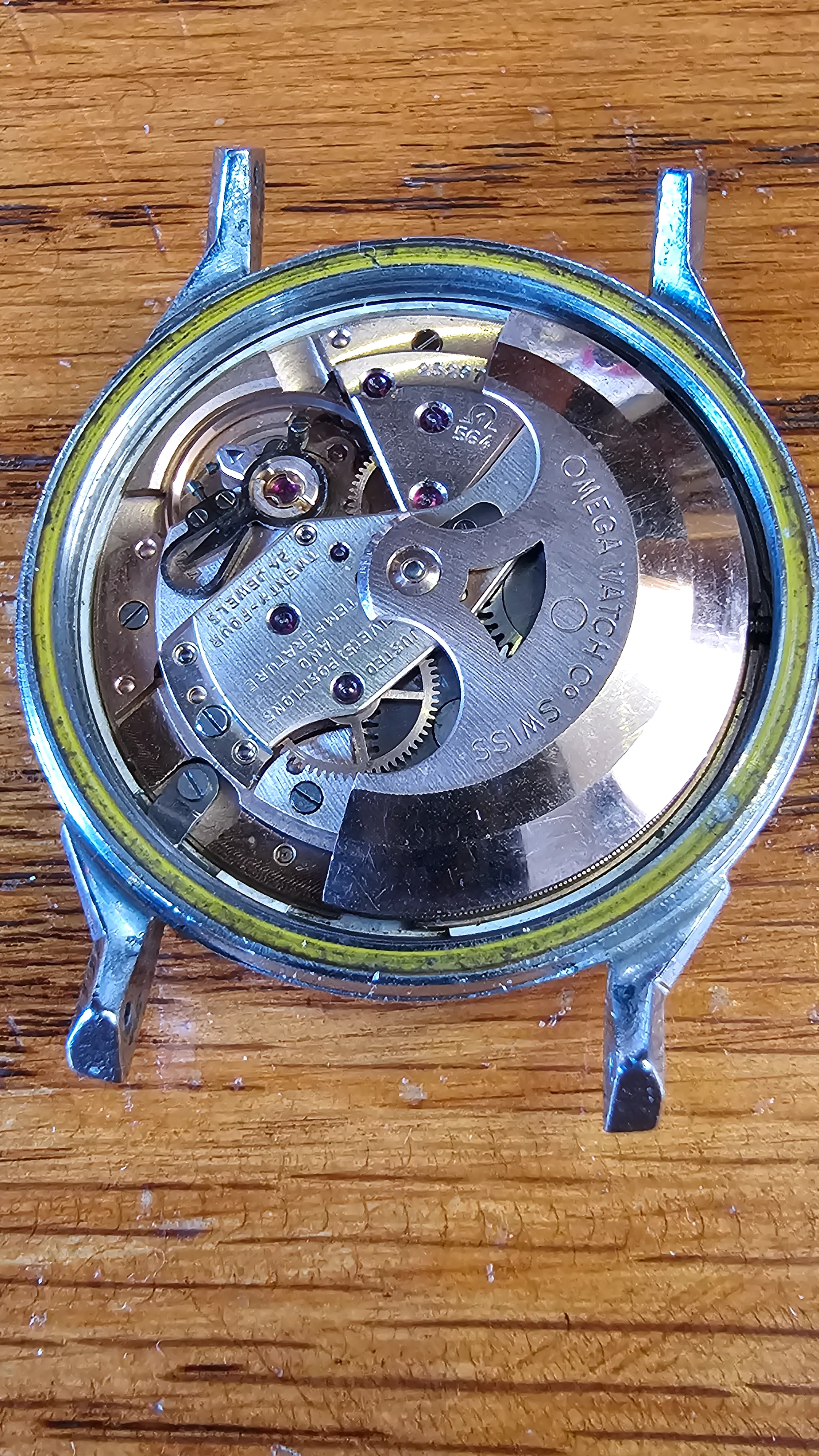It is running and keeping time but I think it needs a cleaning and lubrication soon. There is no sign of rotor touching the case back or anything. The old yellow gasket is still there and there is a small Omega logo in the middle of the crystal.