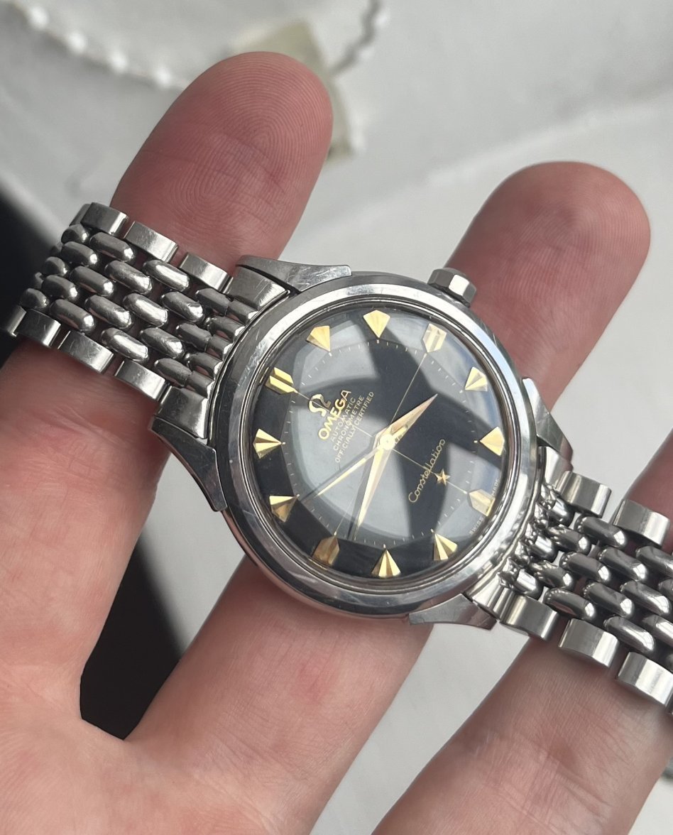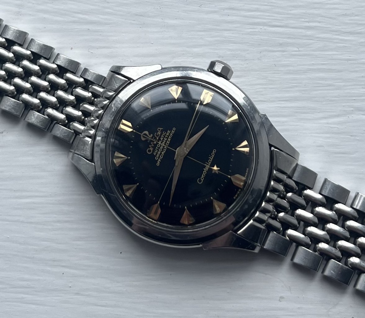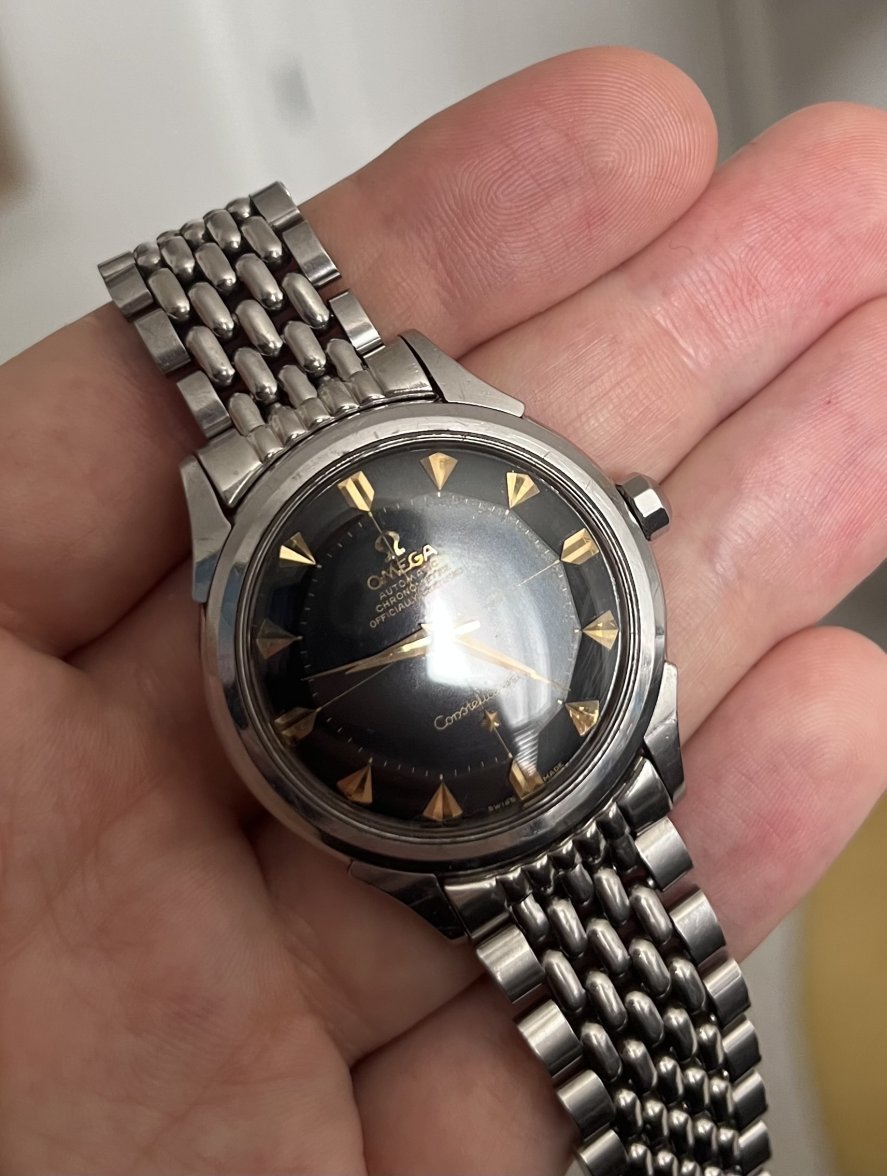 Dial/hands: Black pie-pan dial with YG arrowhead markers, the dial is still glossy with no signs of abuse/scratches but shows degradation to the lacquer around the markers and edges of the centre panel in harsh lighting, I am deliberately including numerous informal photos to illustrate it at its best / worst including when removed from its case - it is a lovely looking dial in person. There are scratches on the hour hand.