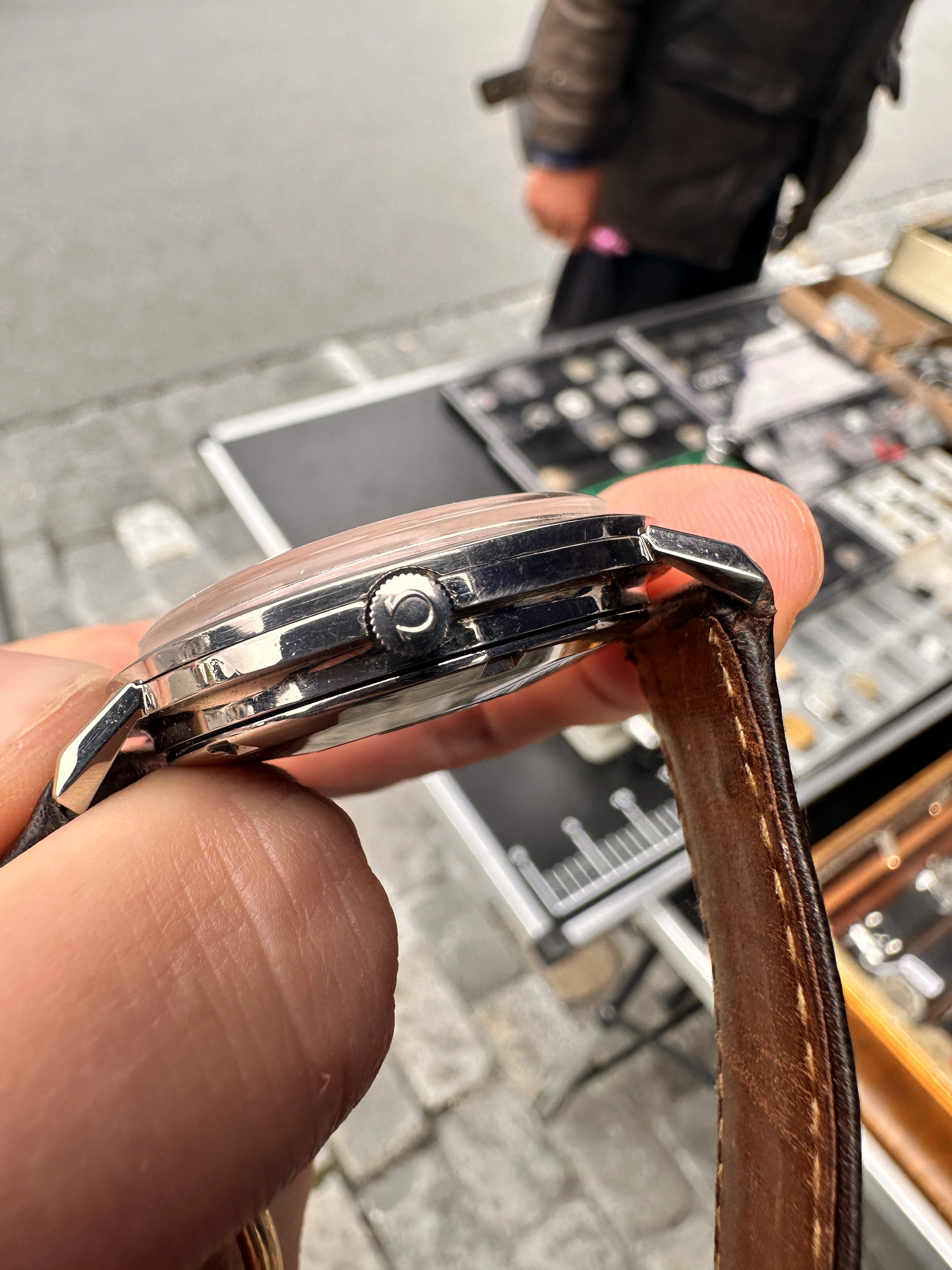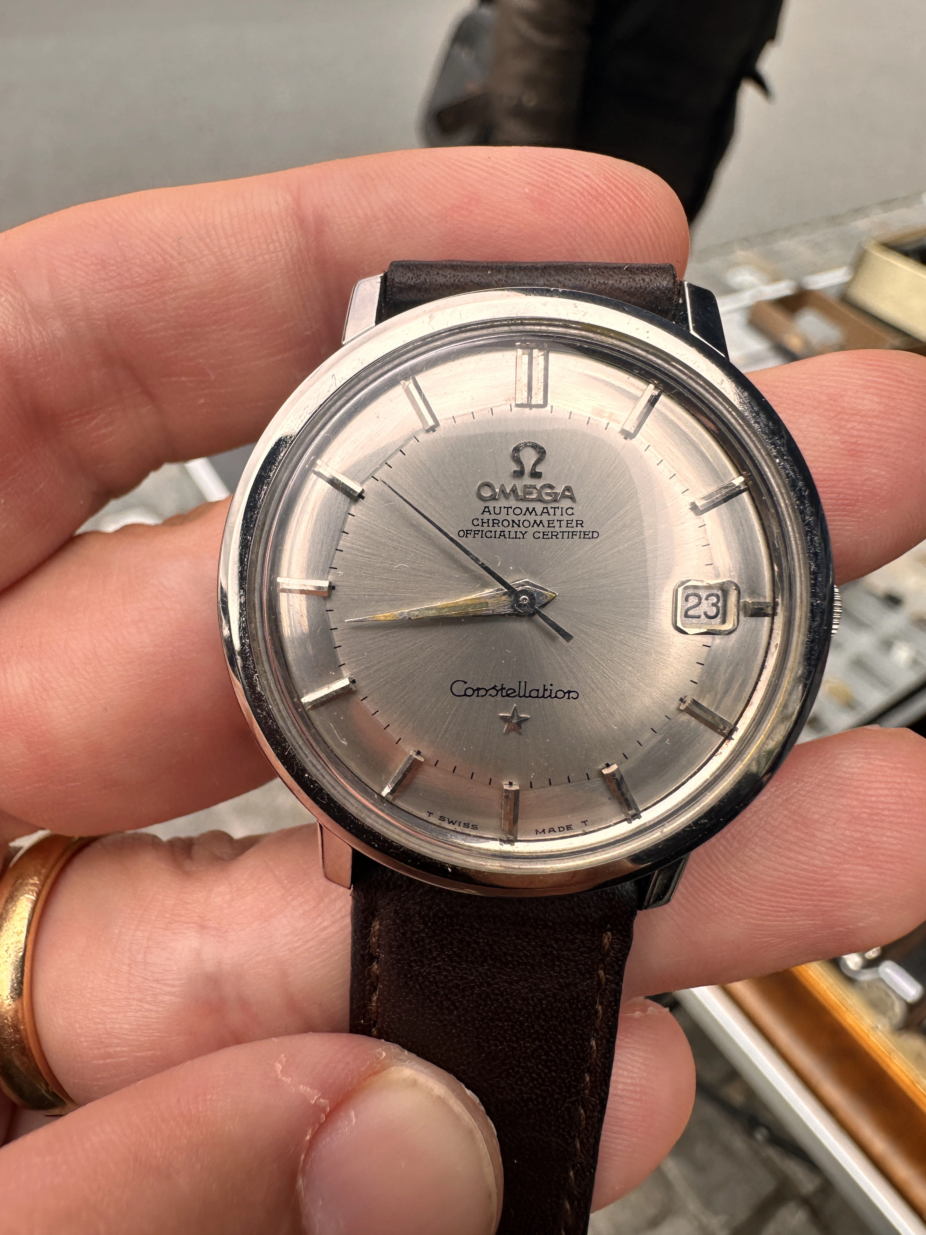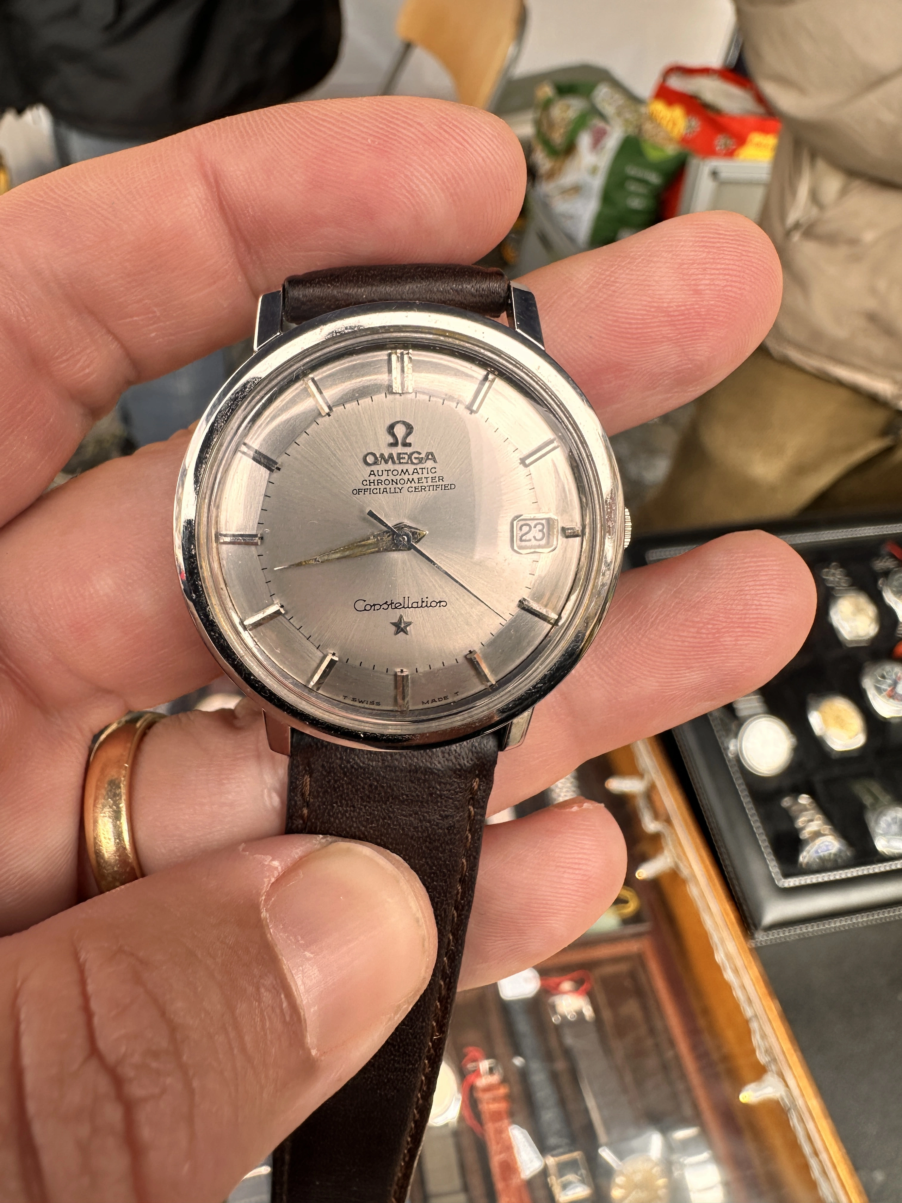 I've never come across a SS Pie Pan at a garage sale so far. I'm not sure about the "Constellation" print and it's been a very long time I did some research on Connies. I'm tempted to say redial and I'm not sure about the condition of the dial overall. Crown is obviously not original which isn't a dealbreaker to me. No pictures of the movement / inner case back, as I was in a rush.