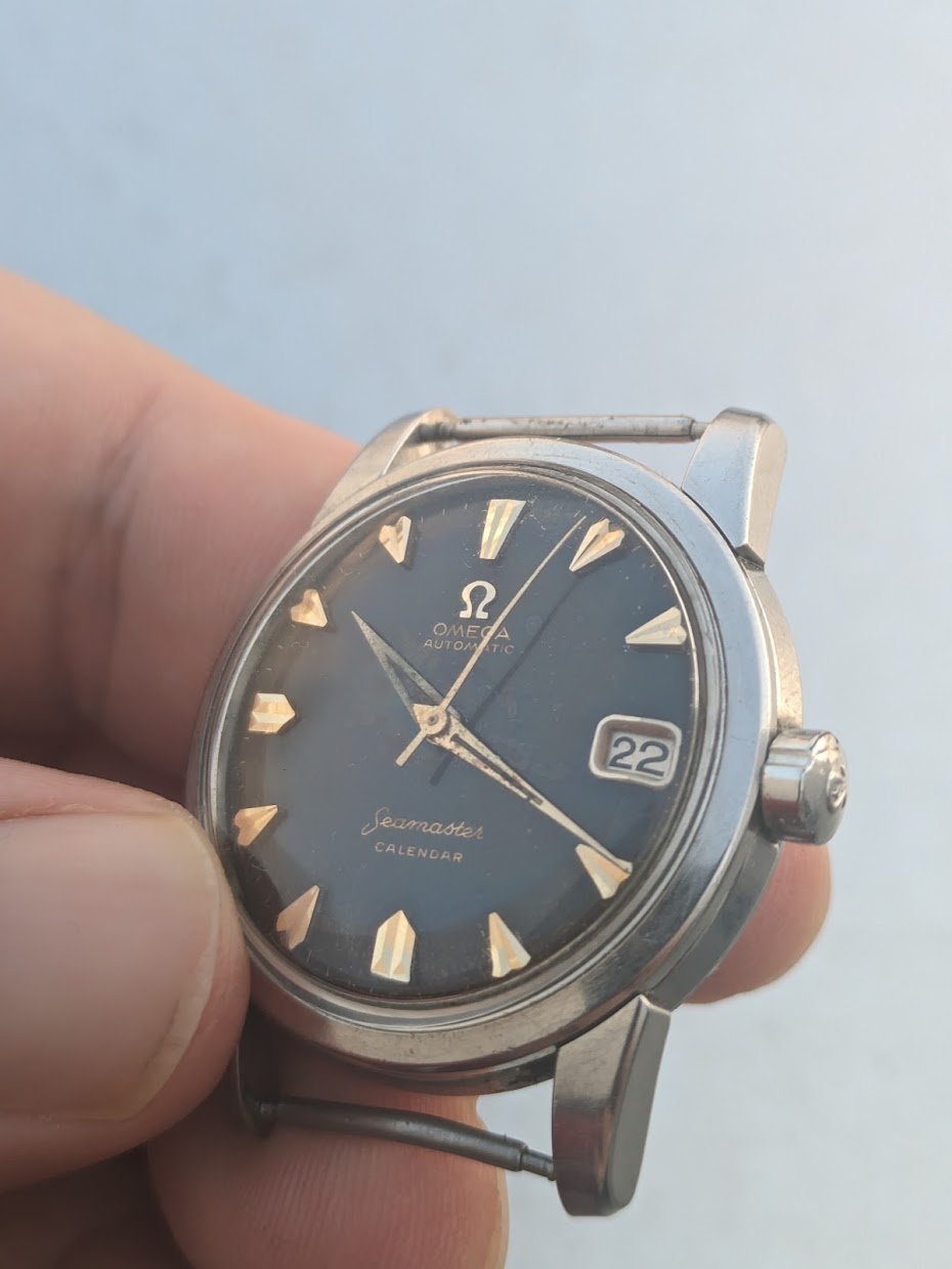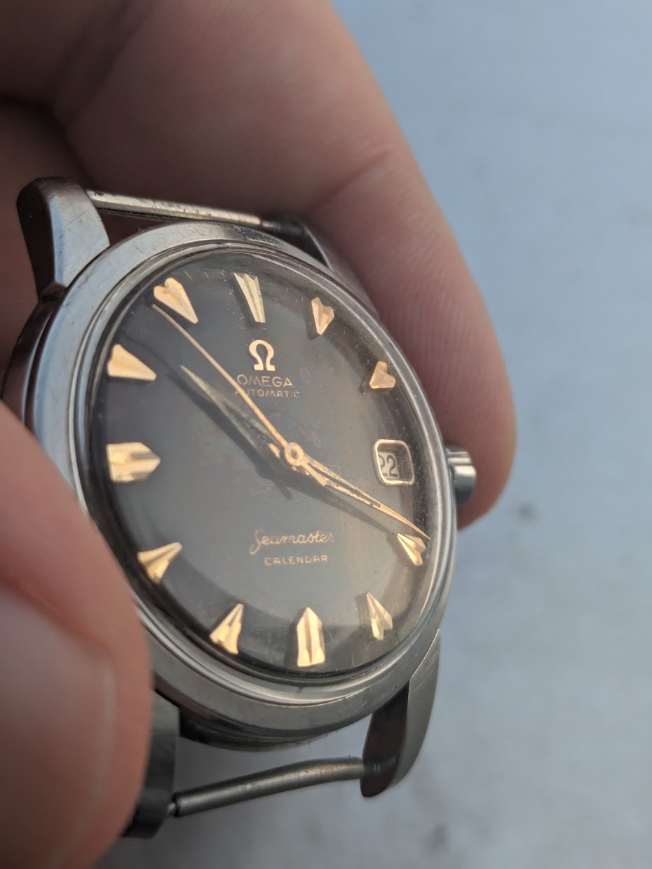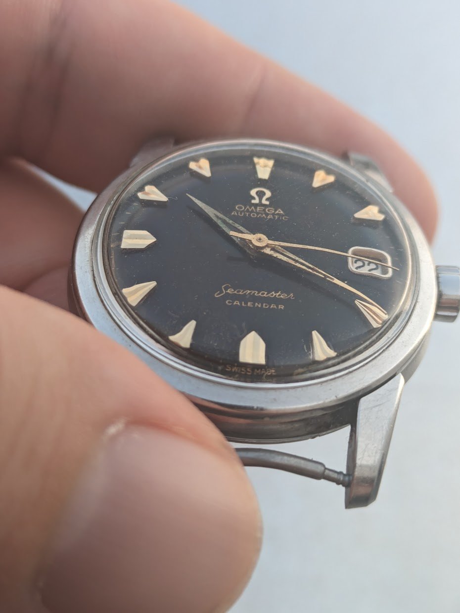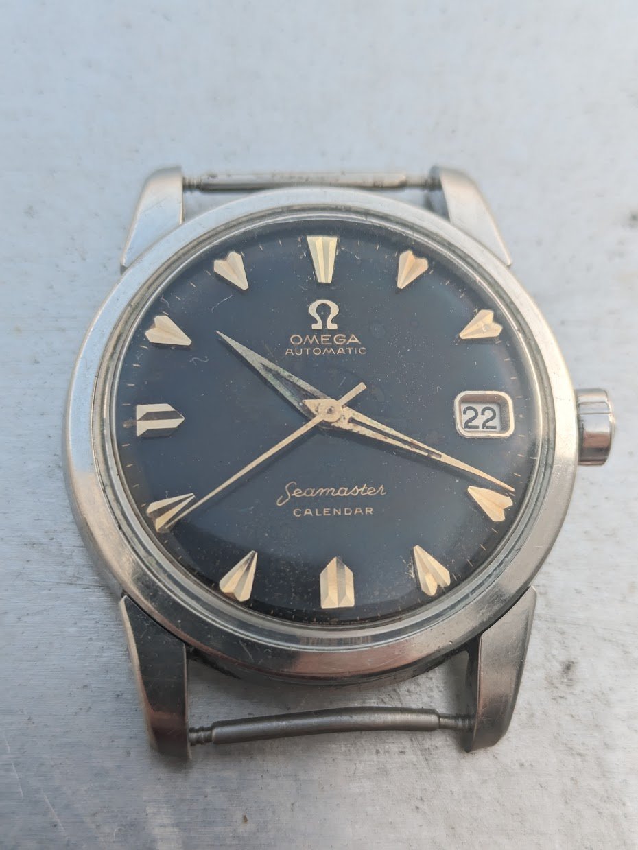 ·For sale is a beautiful Omega Seamaster Calendar featuring an original black gilt dial and attractive yellow gold arrowhead markers. The original, non-refinished dial is in decent condition. Asking price is 700 euro, shipping from Germany by DHL to Europe is 20 euro, I can also ship worldwide with a few exceptions, please PM me for a shipping quote. Both bank transfer/Wise and PayPal are OK, but I strongly prefer the former because of the fees. No returns please, unless I have grossly misrepresented the watch.