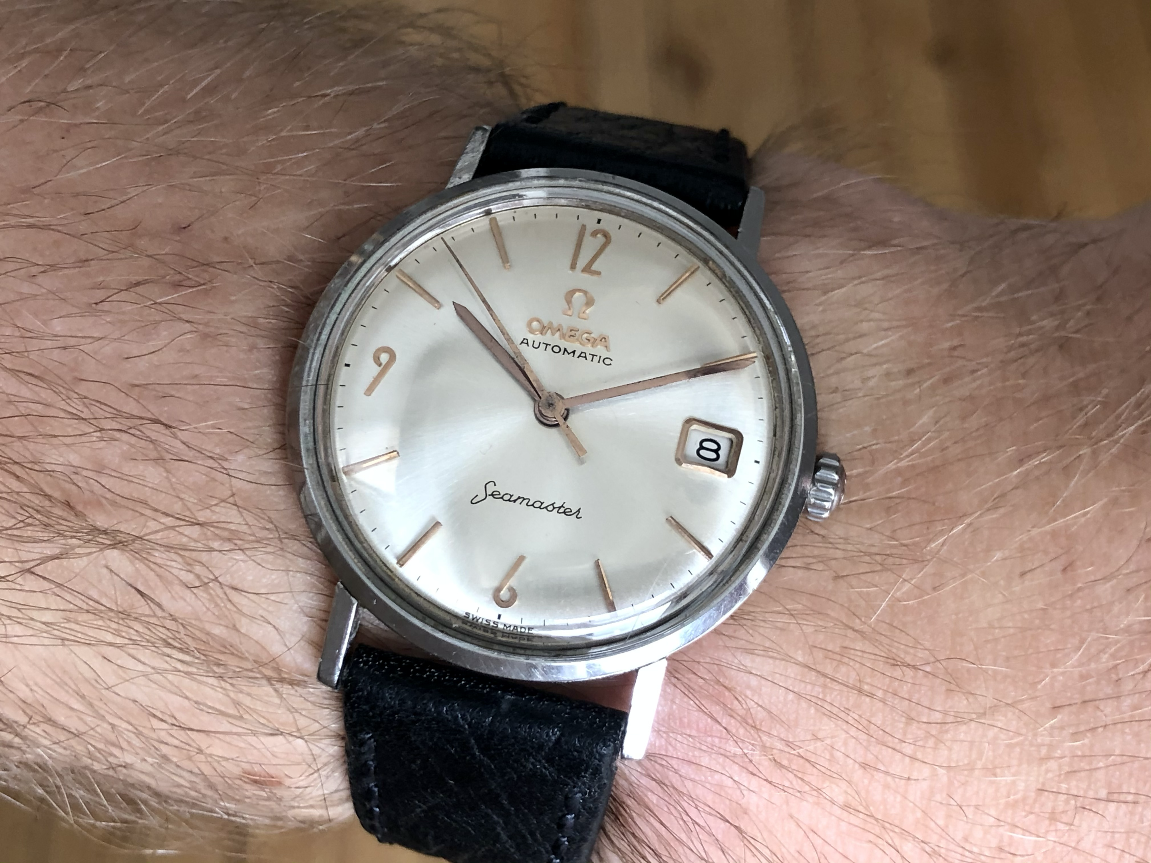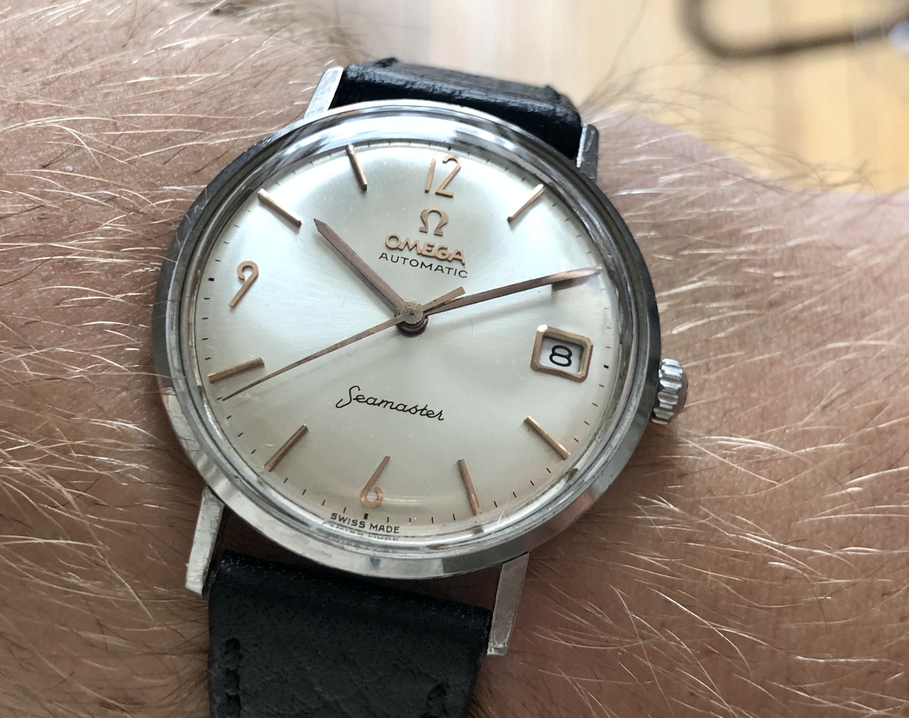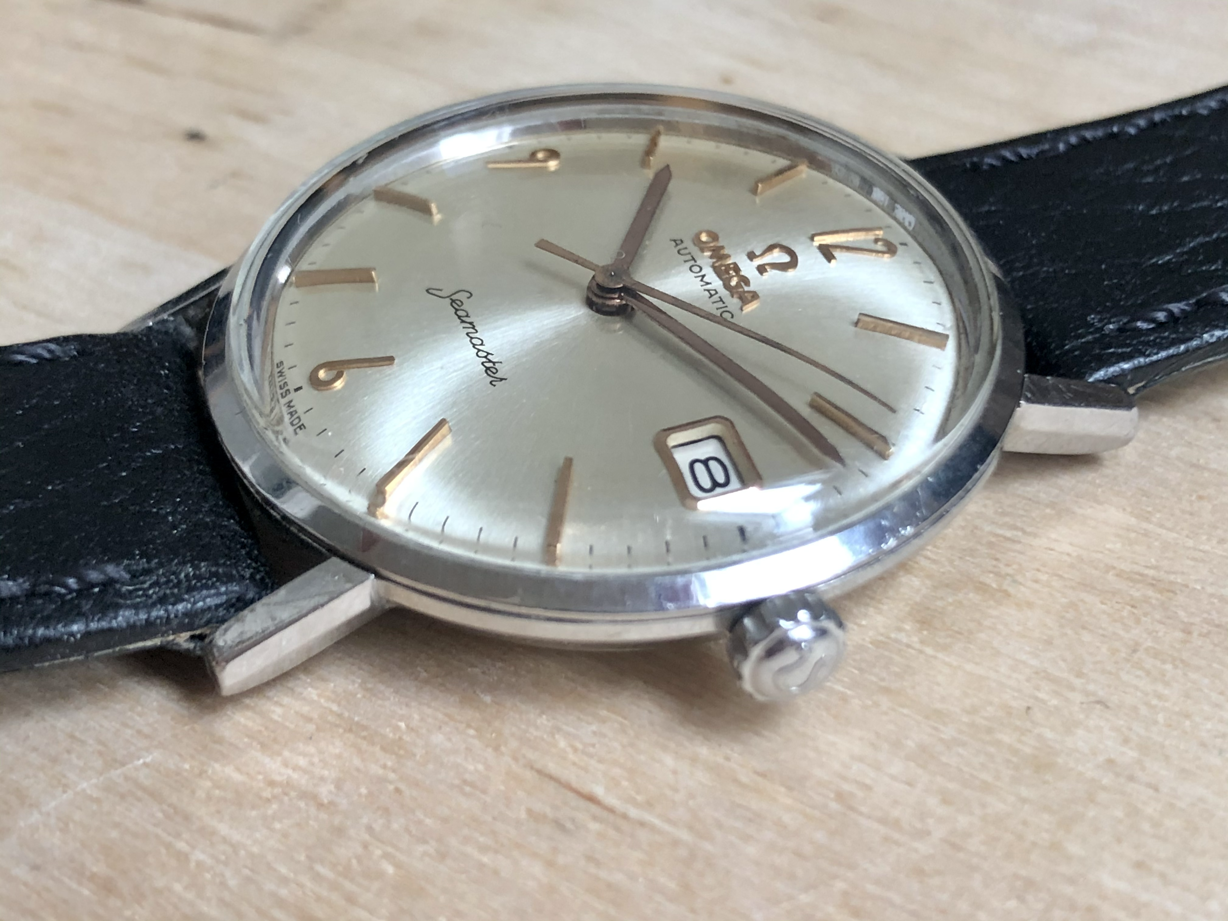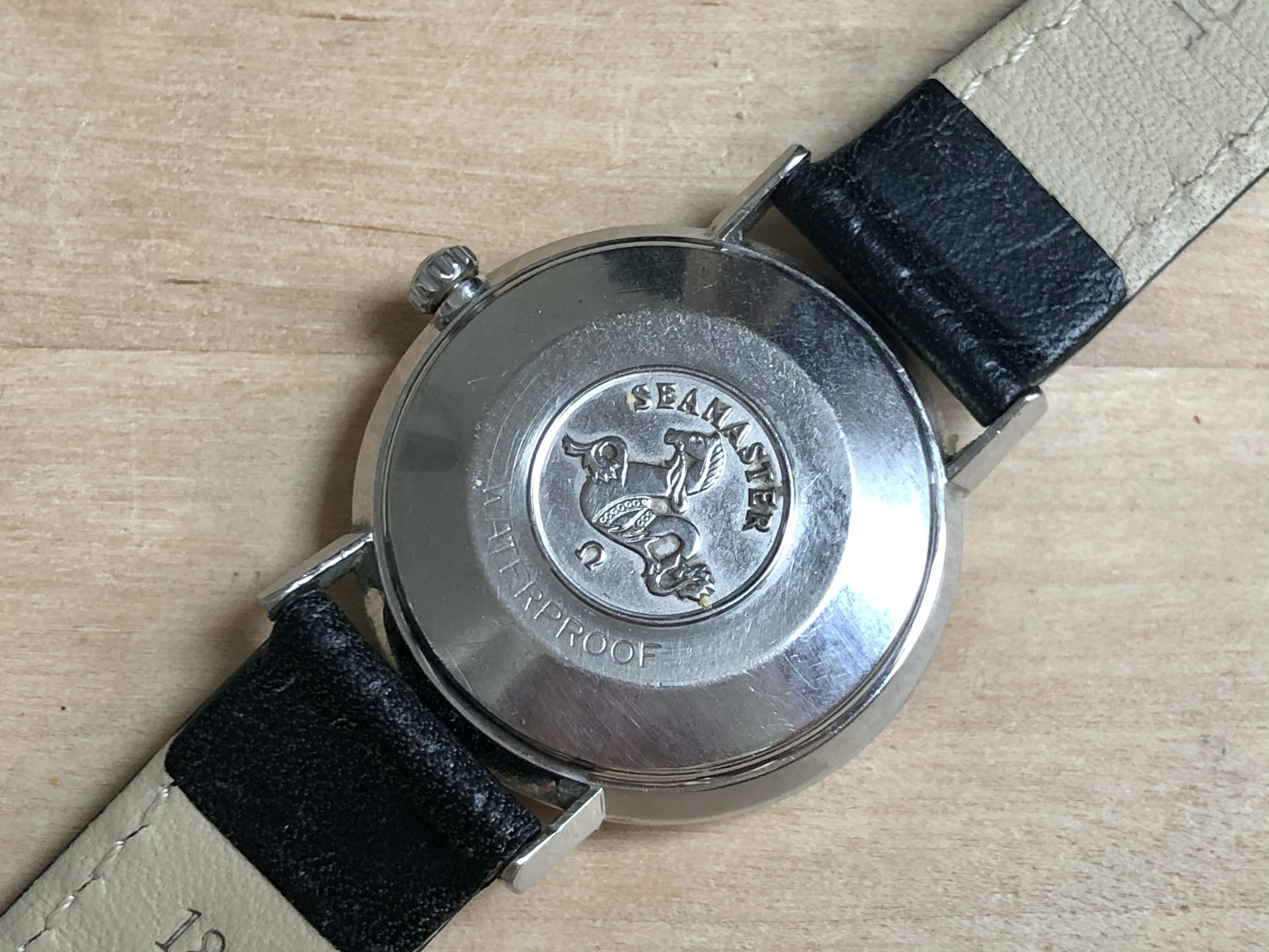 ·Omega Seamster so-called ‘pre-De Ville’, ref. 14770-2SC, cal. 562 with a serial dating it to roughly 1961. It is 34mm in diameter and features an omega signed crown (which I believe is correct for this reference) as well as crystal with Omega logo.