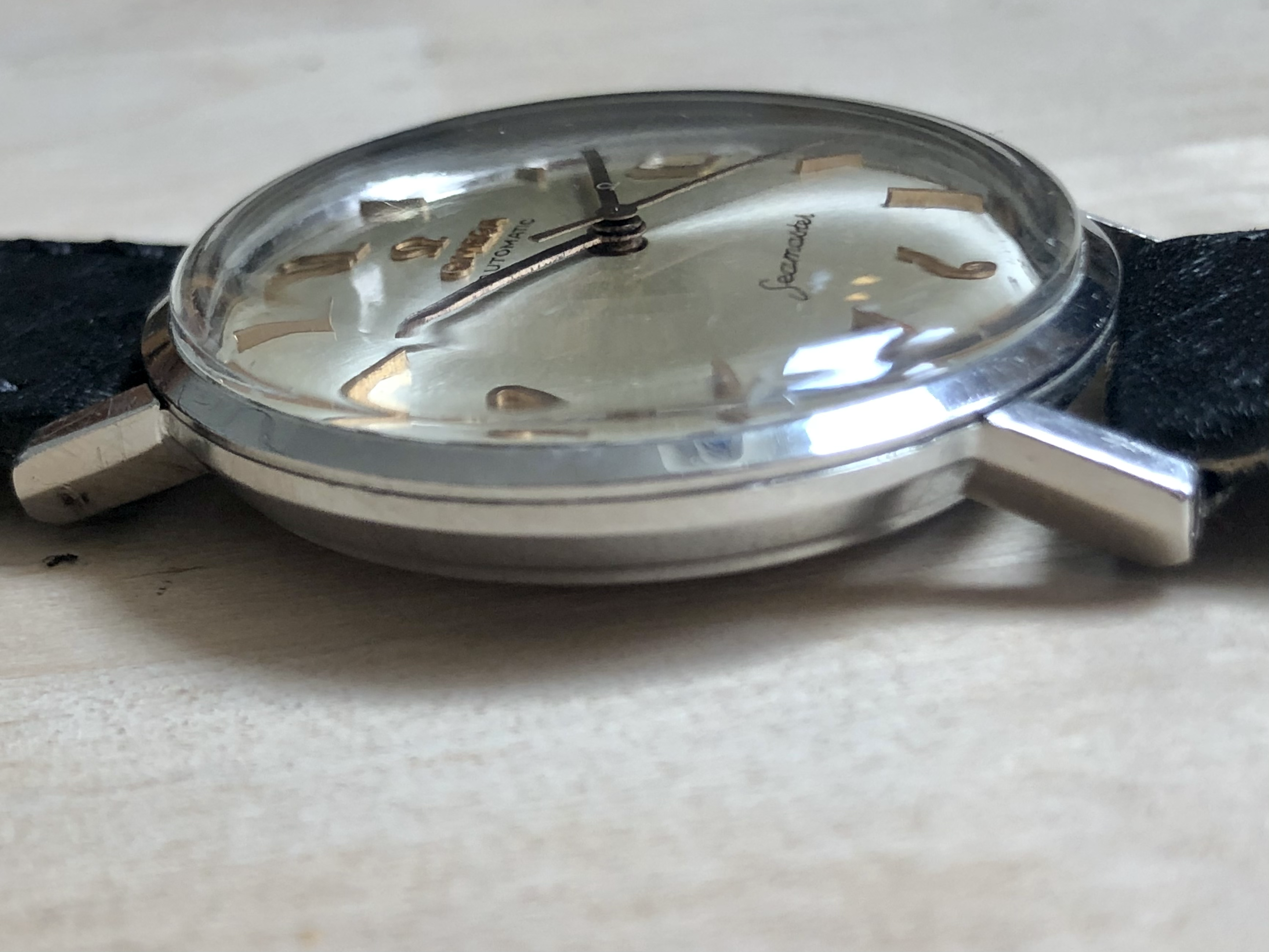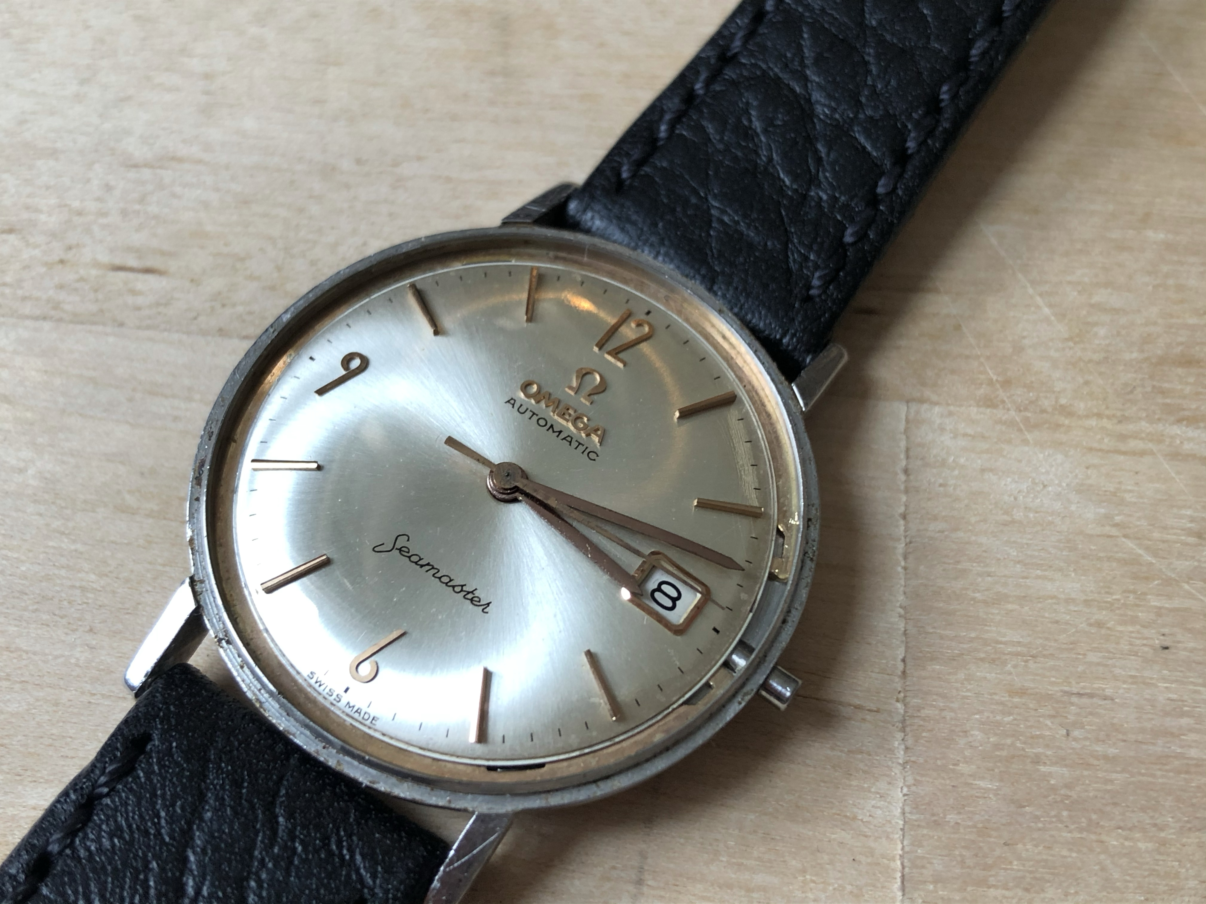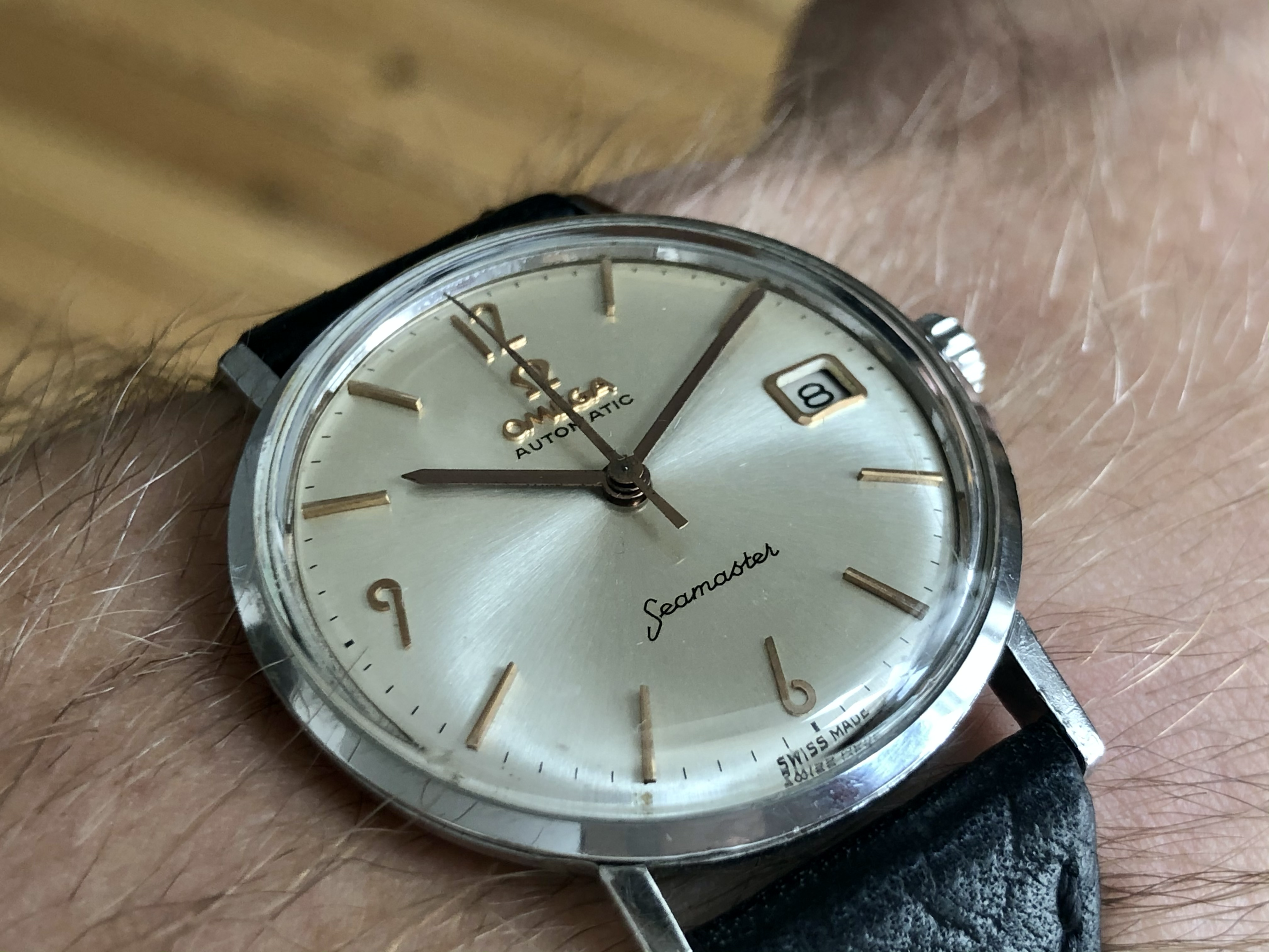 ·Omega Seamster so-called ‘pre-De Ville’, ref. 14770-2SC, cal. 562 with a serial dating it to roughly 1961. It is 34mm in diameter and features an omega signed crown (which I believe is correct for this reference) as well as crystal with Omega logo.