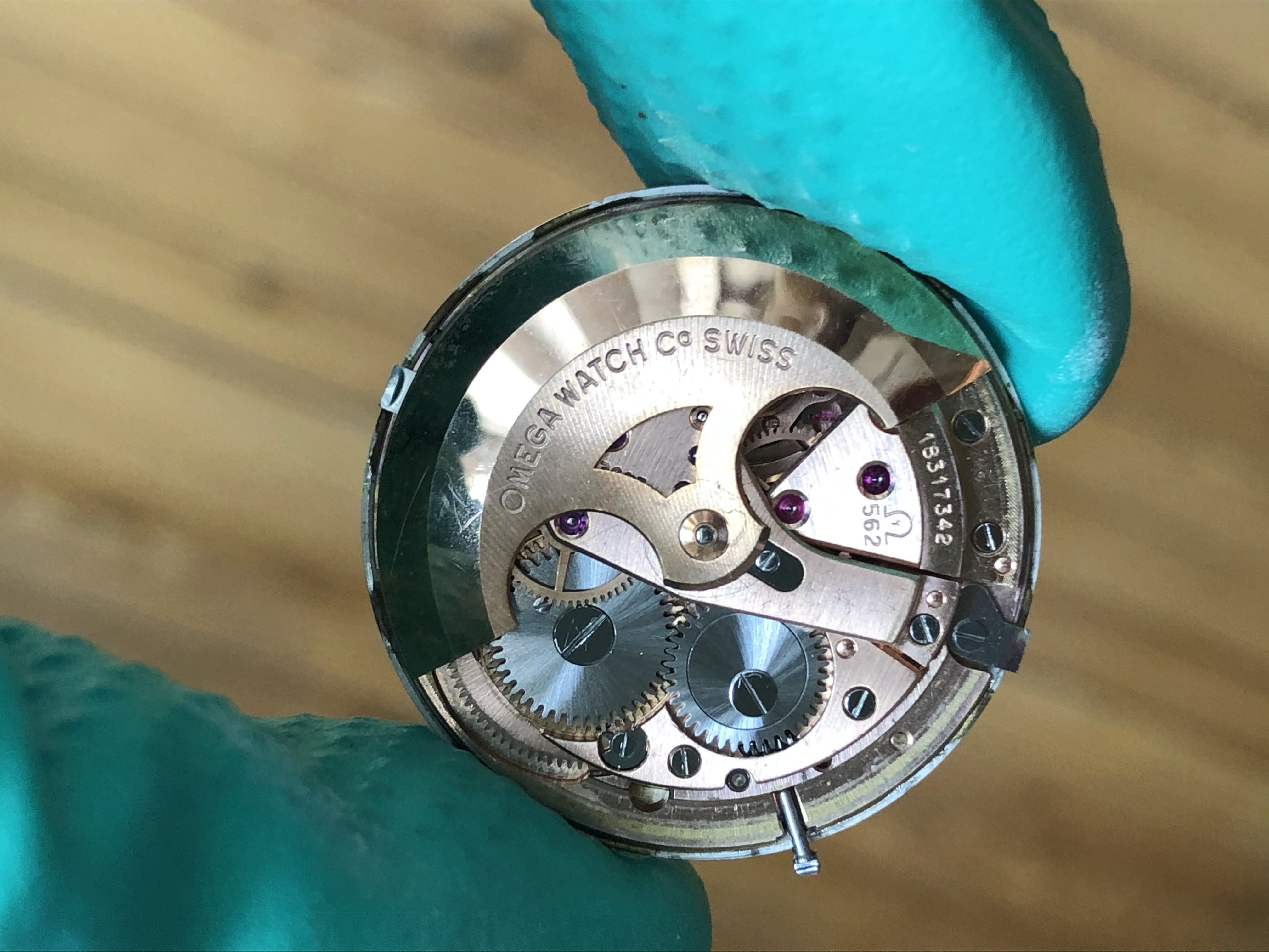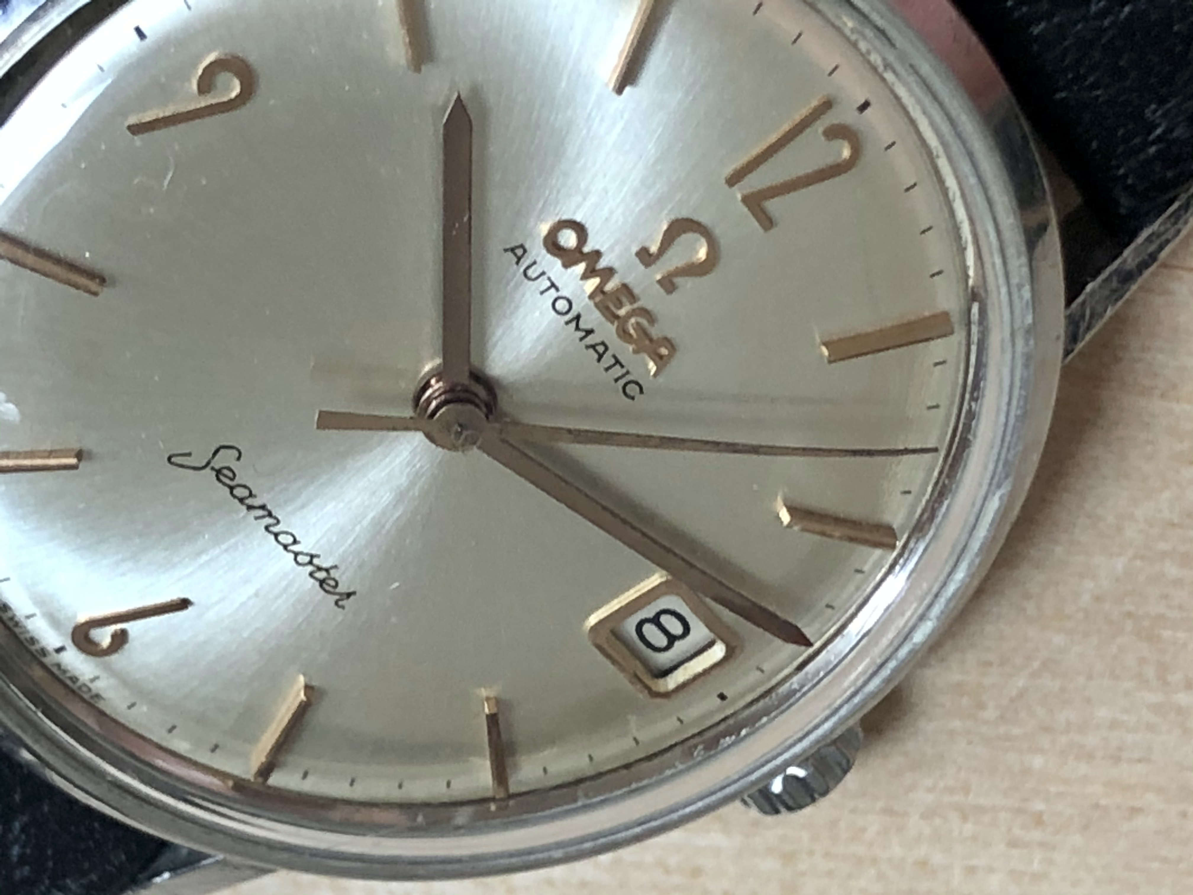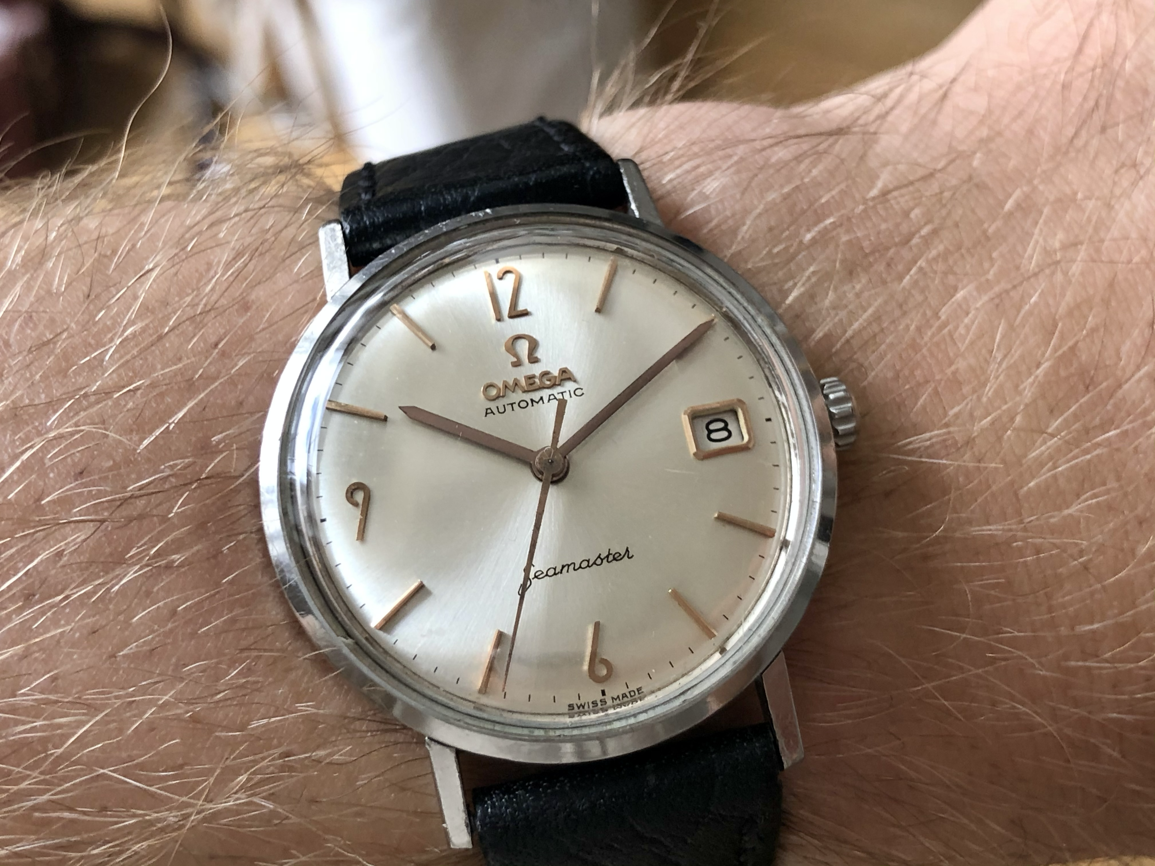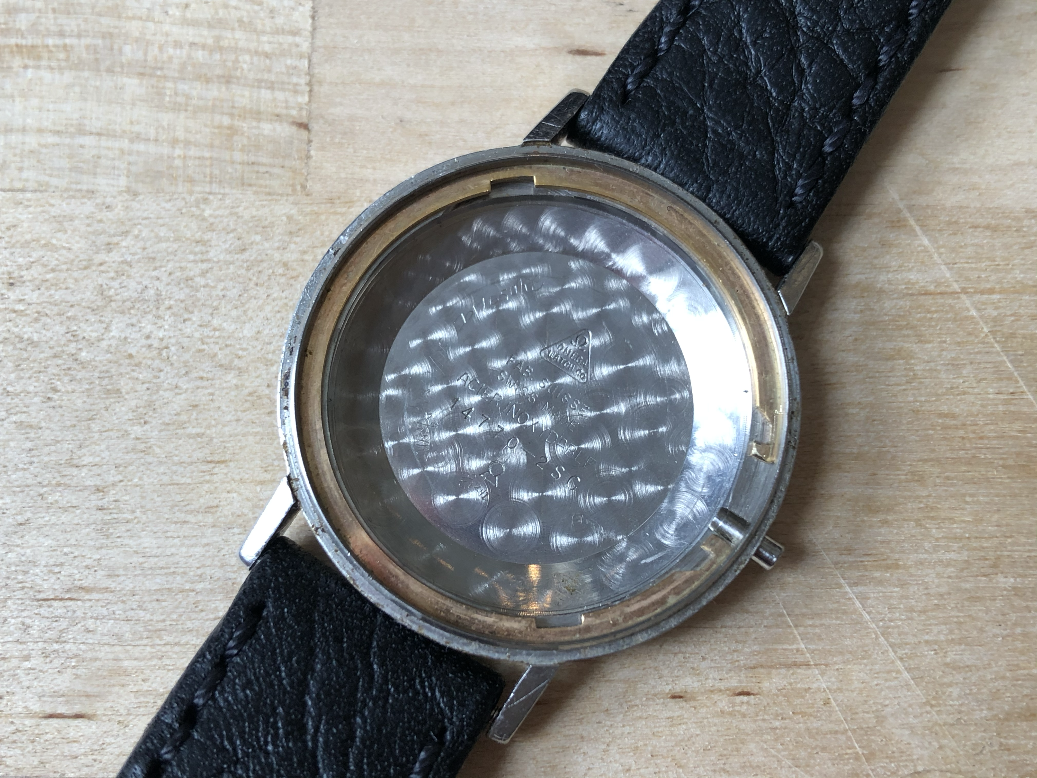 ·Omega Seamster so-called ‘pre-De Ville’, ref. 14770-2SC, cal. 562 with a serial dating it to roughly 1961. It is 34mm in diameter and features an omega signed crown (which I believe is correct for this reference) as well as crystal with Omega logo.