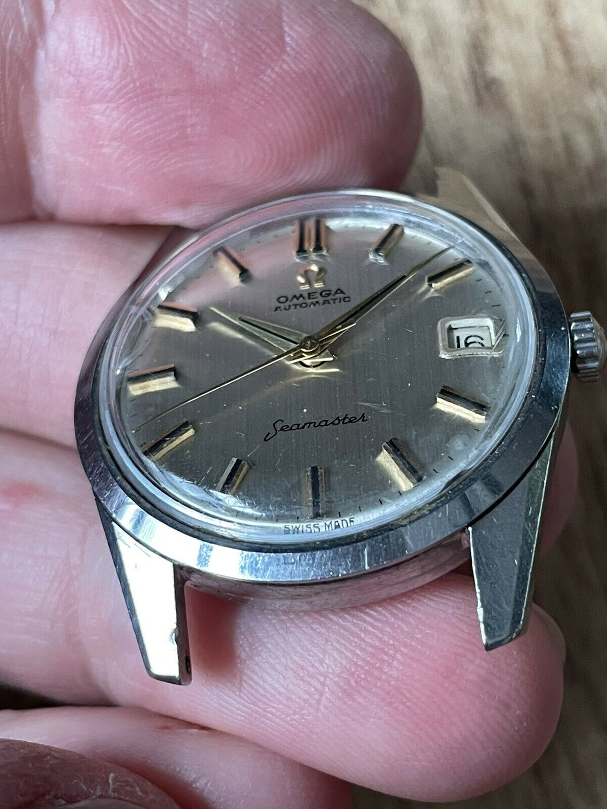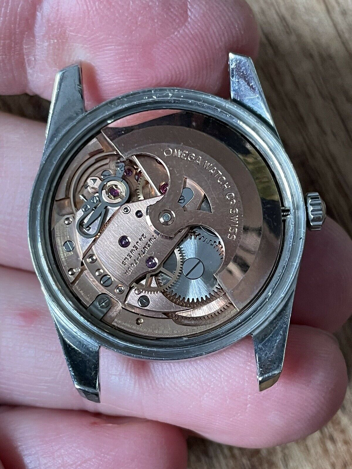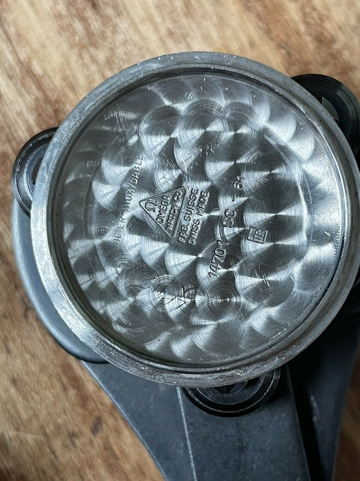 CASE: the 34mm steel case is in good used shape, with scuffing and evidence of use throughout. I *love* the 14700/01 cases, with their angled bevels at the edge of the case, and this one's clearly unpolished with great lines throughout. The screw-down caseback is in good shape with little wear. The scalloped crown is original and excellent. The only issue is a bit of haze on the crystal between 9-10. I cannot see an Omega symbol on the crystal. Other than that, everything's in good, used condition.