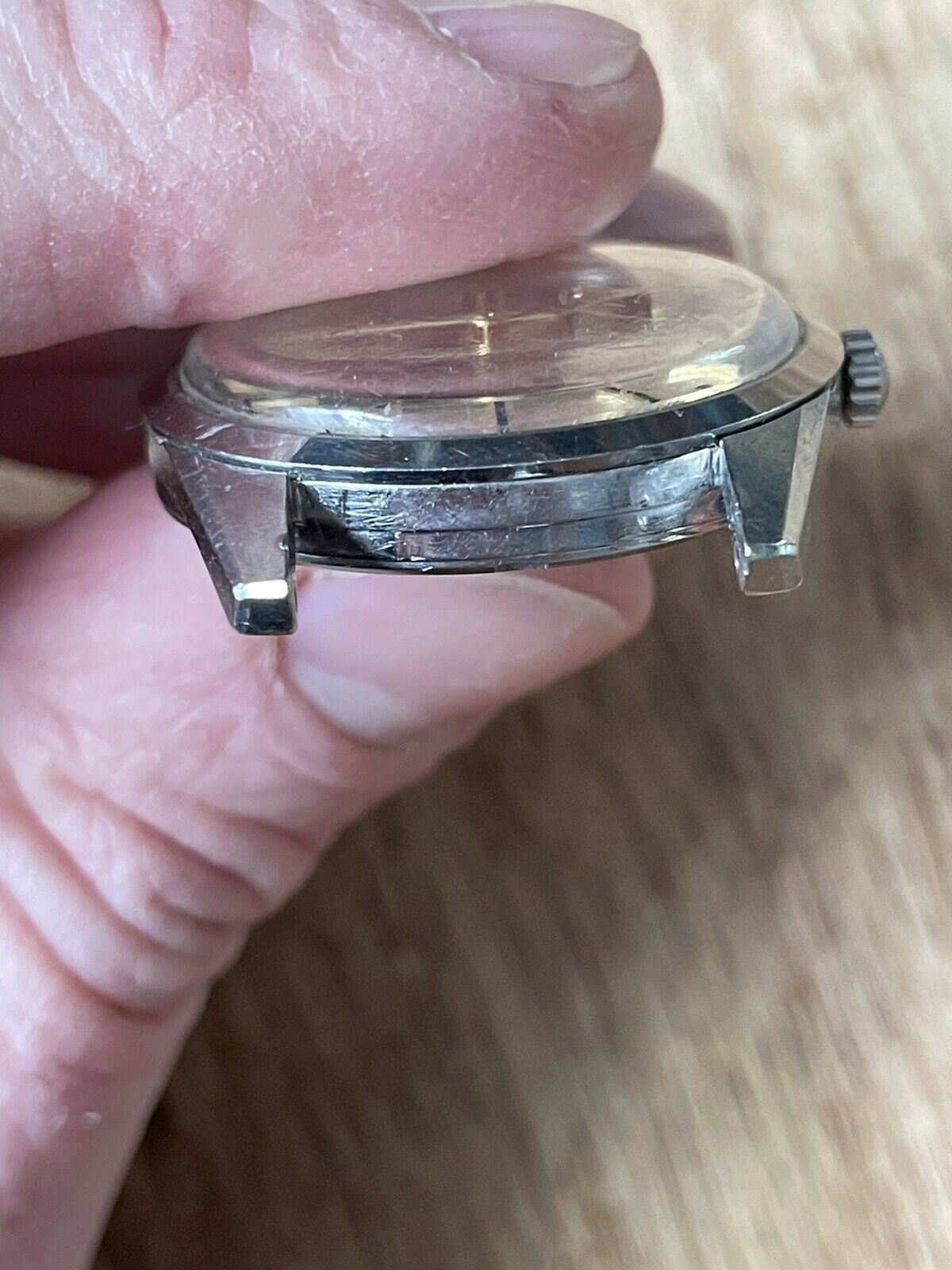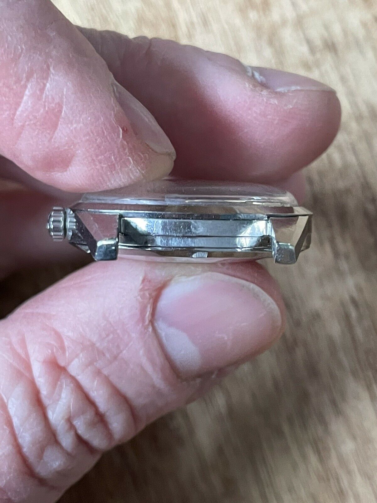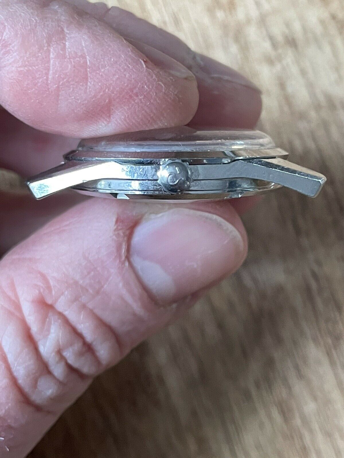 CASE: the 34mm steel case is in good used shape, with scuffing and evidence of use throughout. I *love* the 14700/01 cases, with their angled bevels at the edge of the case, and this one's clearly unpolished with great lines throughout. The screw-down caseback is in good shape with little wear. The scalloped crown is original and excellent. The only issue is a bit of haze on the crystal between 9-10. I cannot see an Omega symbol on the crystal. Other than that, everything's in good, used condition.