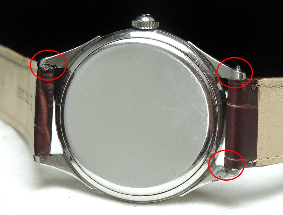 Case looks in good shape, with few scratches. Under cetain angle I'd say un-polished but then some of the lugs seem not as sharp? (maybe the pics?) There seems to be some sort of damages/erosion on the strap lugs? Crown is correct to me, maybe a little cleaner than the rest of the watch?