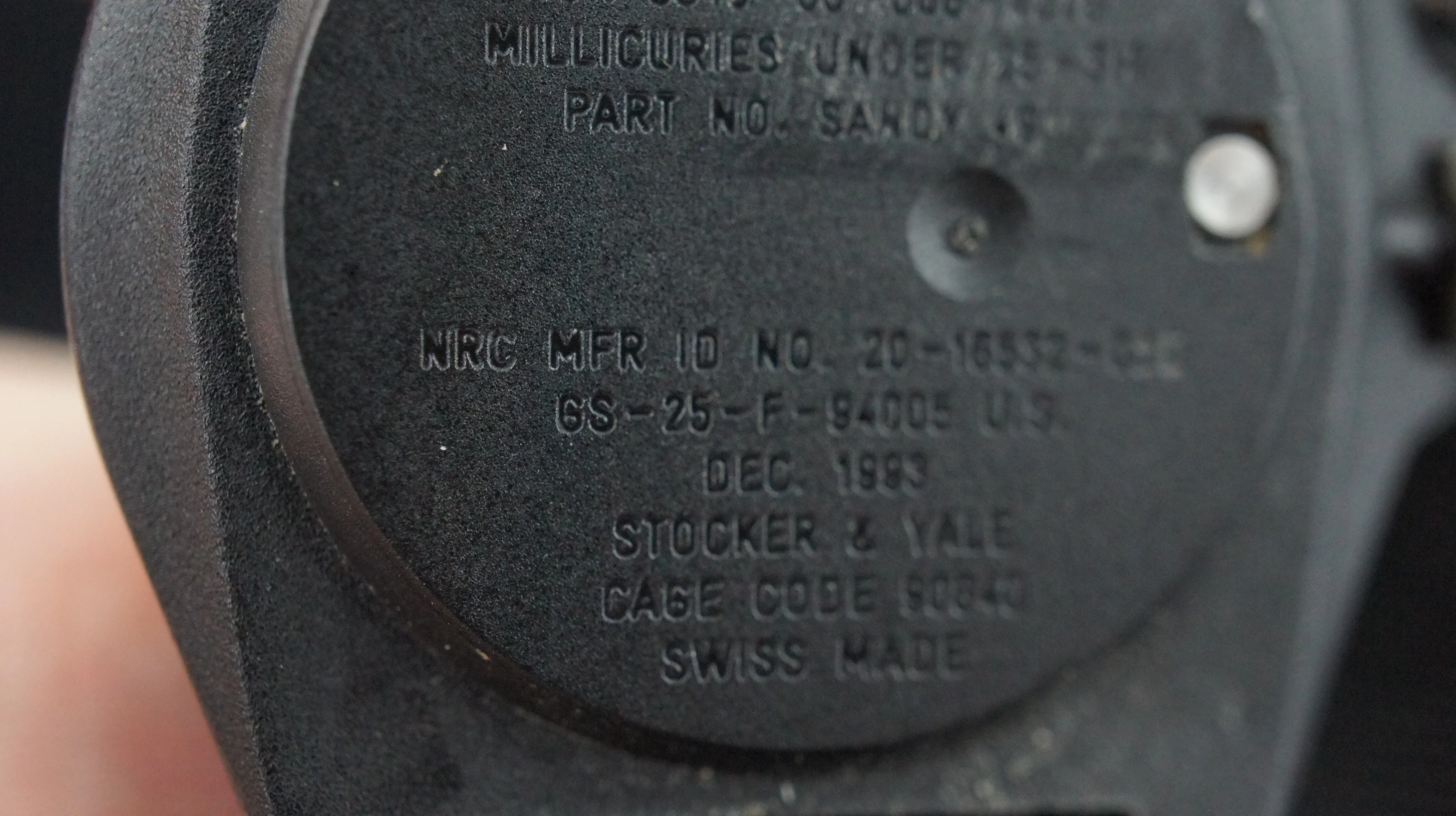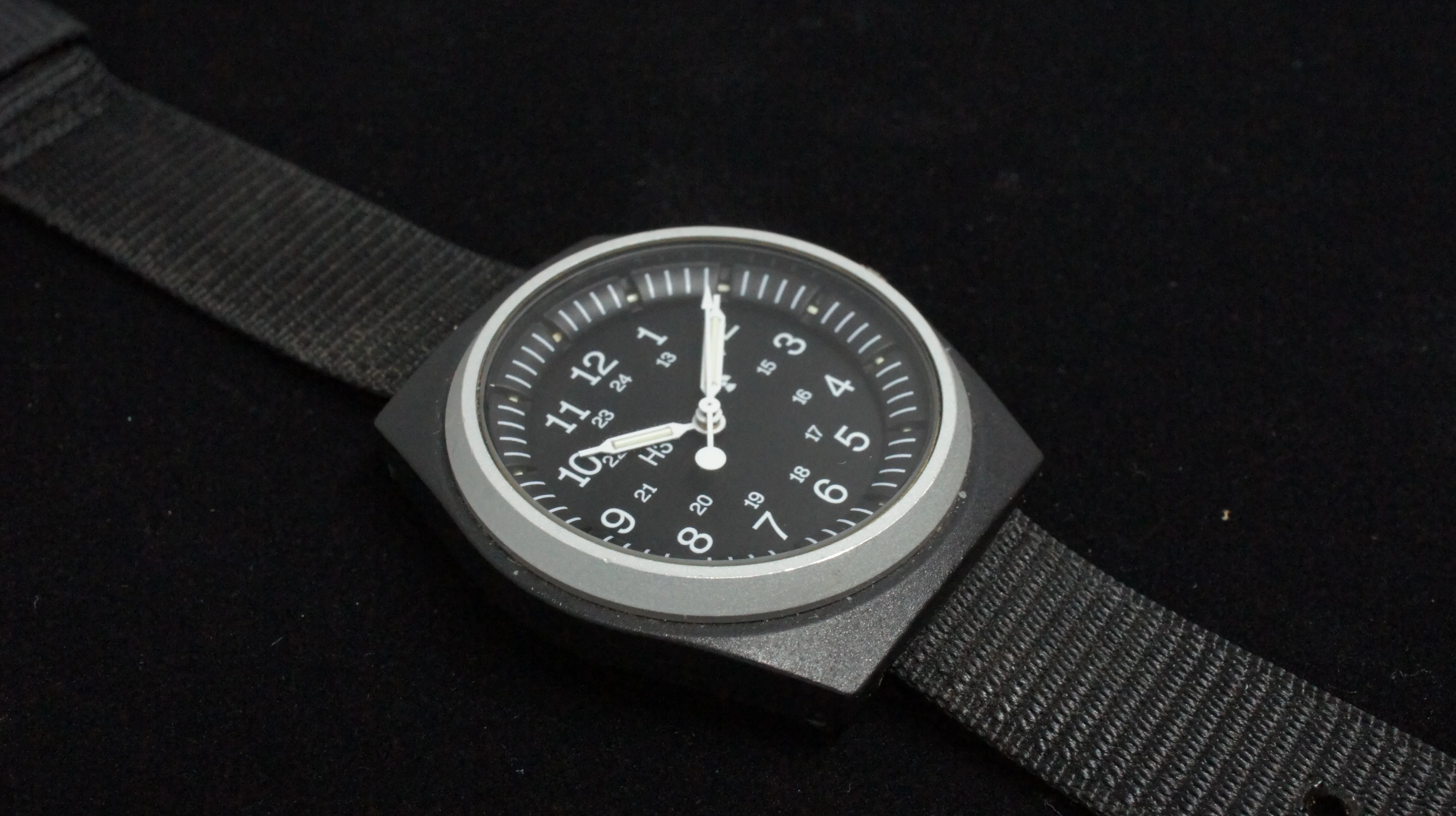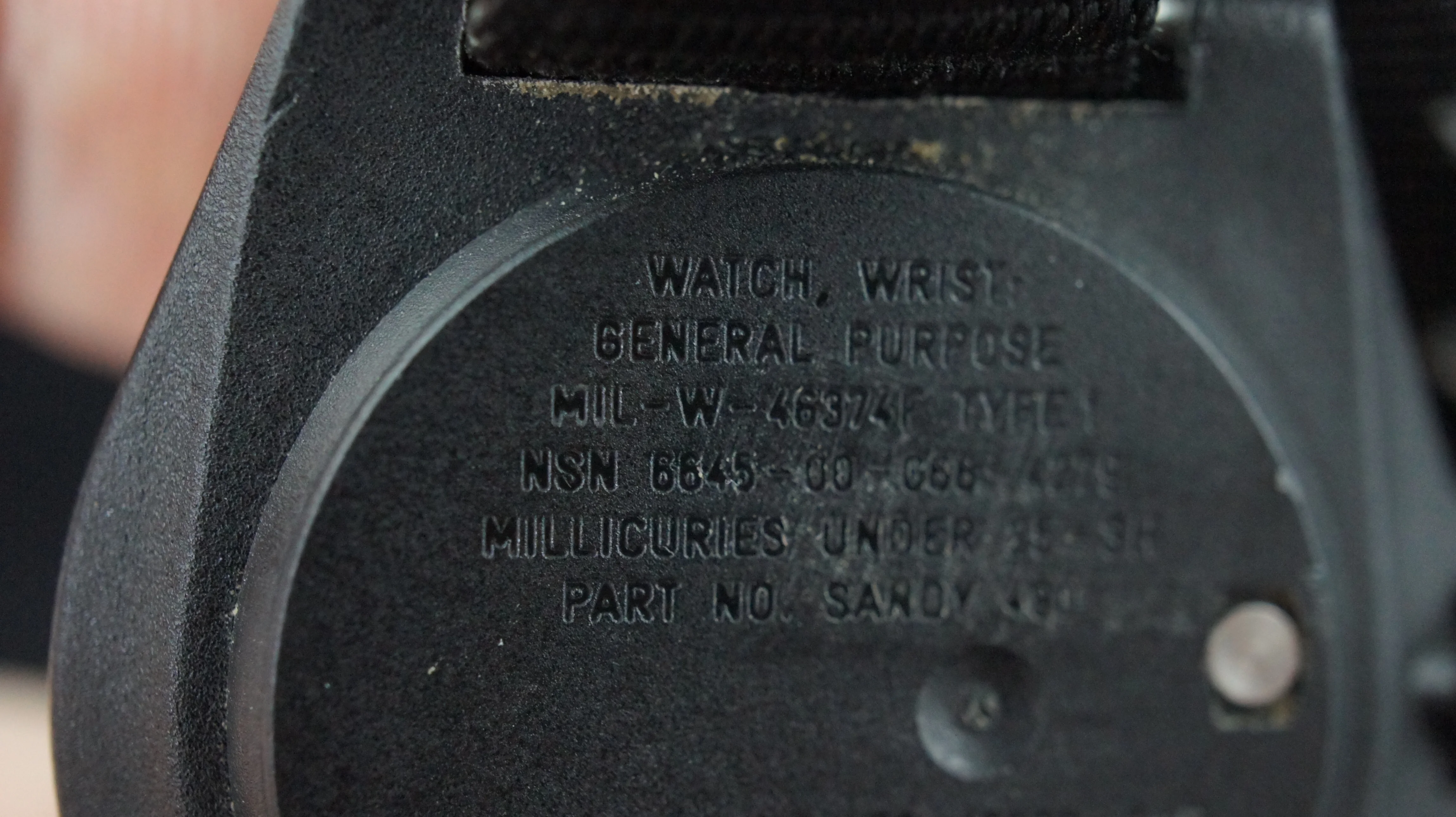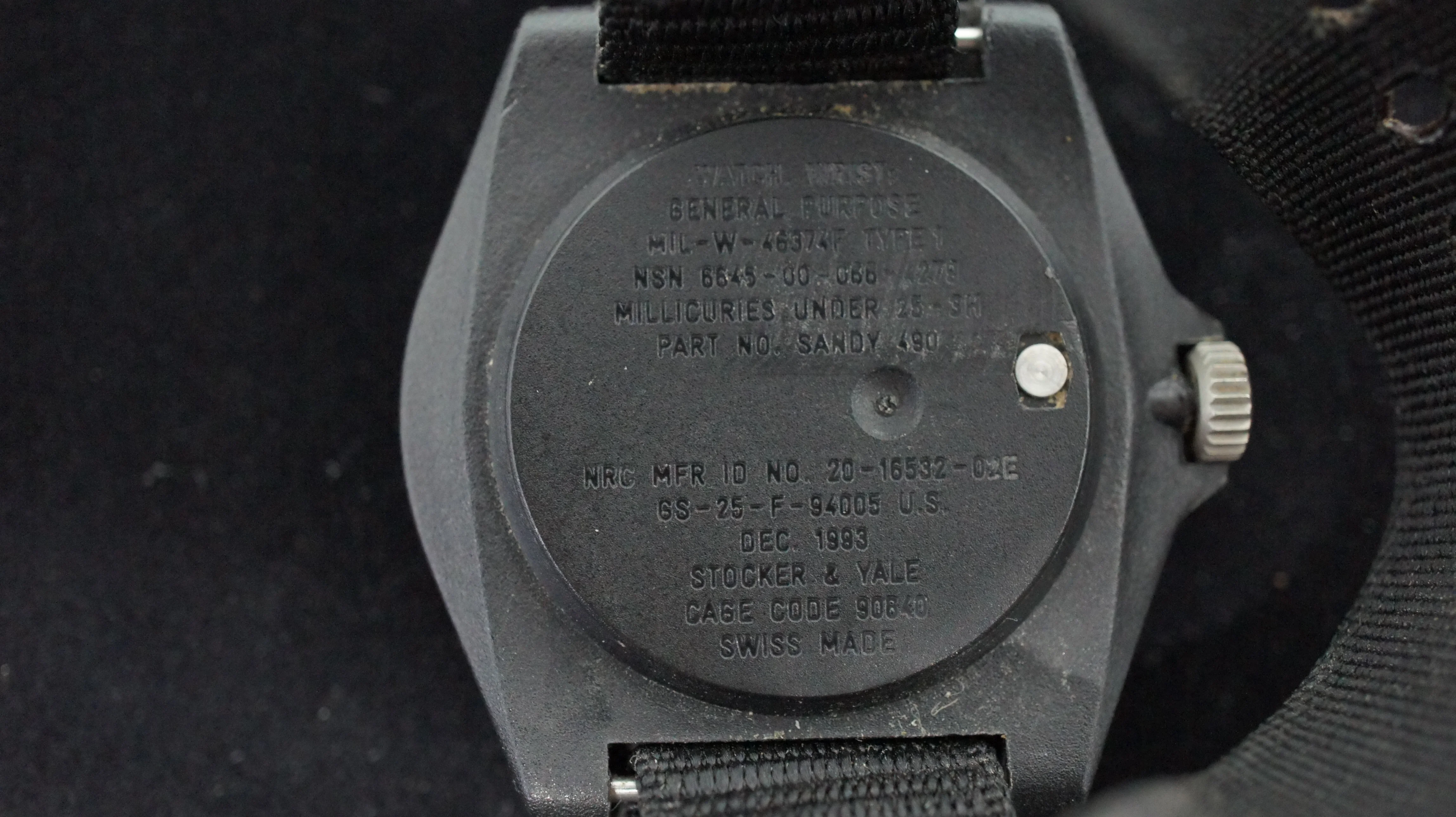 ·This Stocker & Yale MIL-W-46374F Type 1 dates to Dec. 1983 and comes on the original nylon strap. It features tritium tubes and is marked "Swiss Made", making it a higher grade timepiece to the regular 184A models. The watch is is nice condition, winds and runs. It keeps reasonable time, but no doubt has probably never been serviced. The movement is an ETA manual winding movement. Case size is around 36.7mm, not including the crown or guards and lug width is 18mm. US$225, includes paypal/shipping Canada/US.