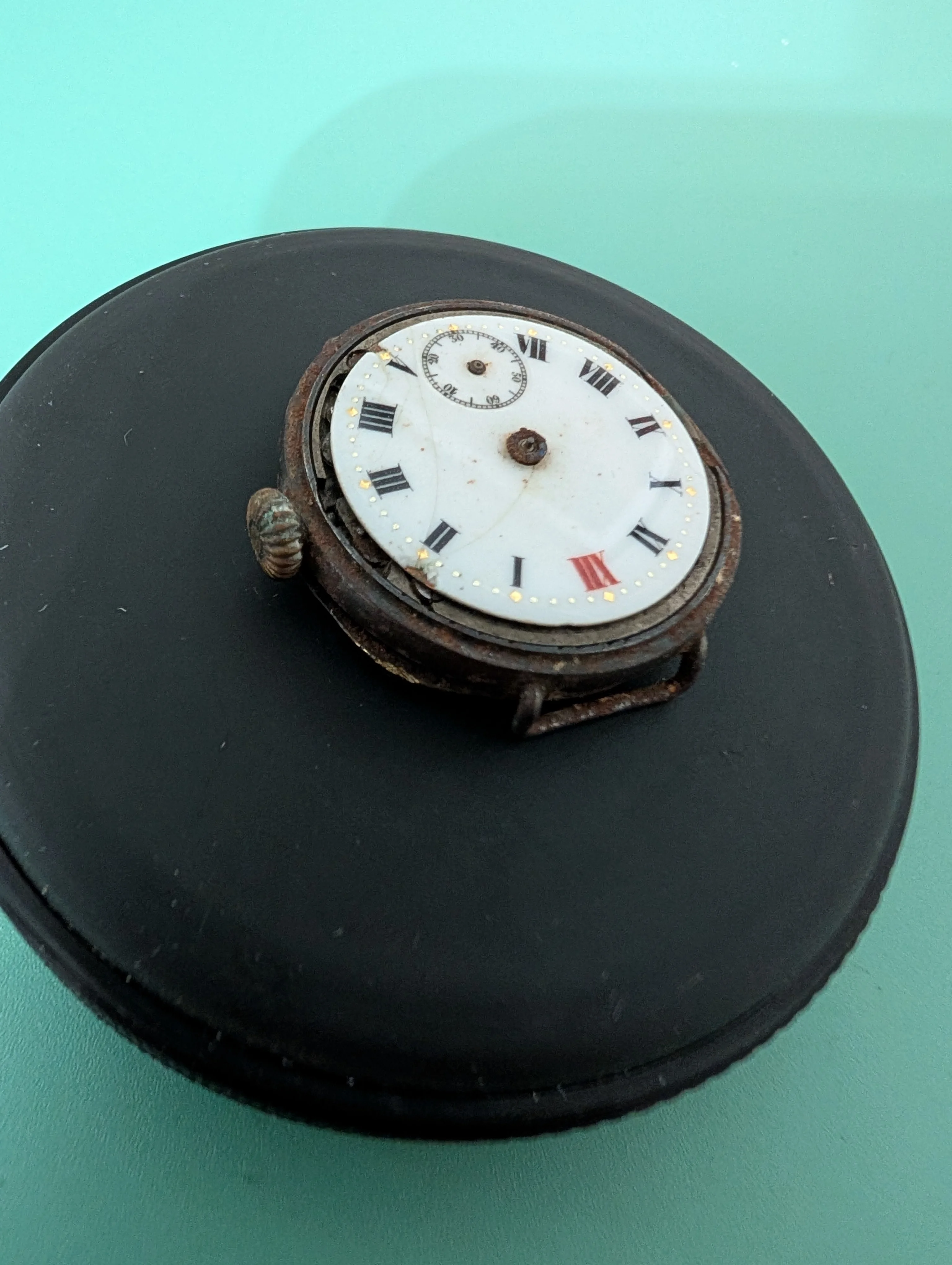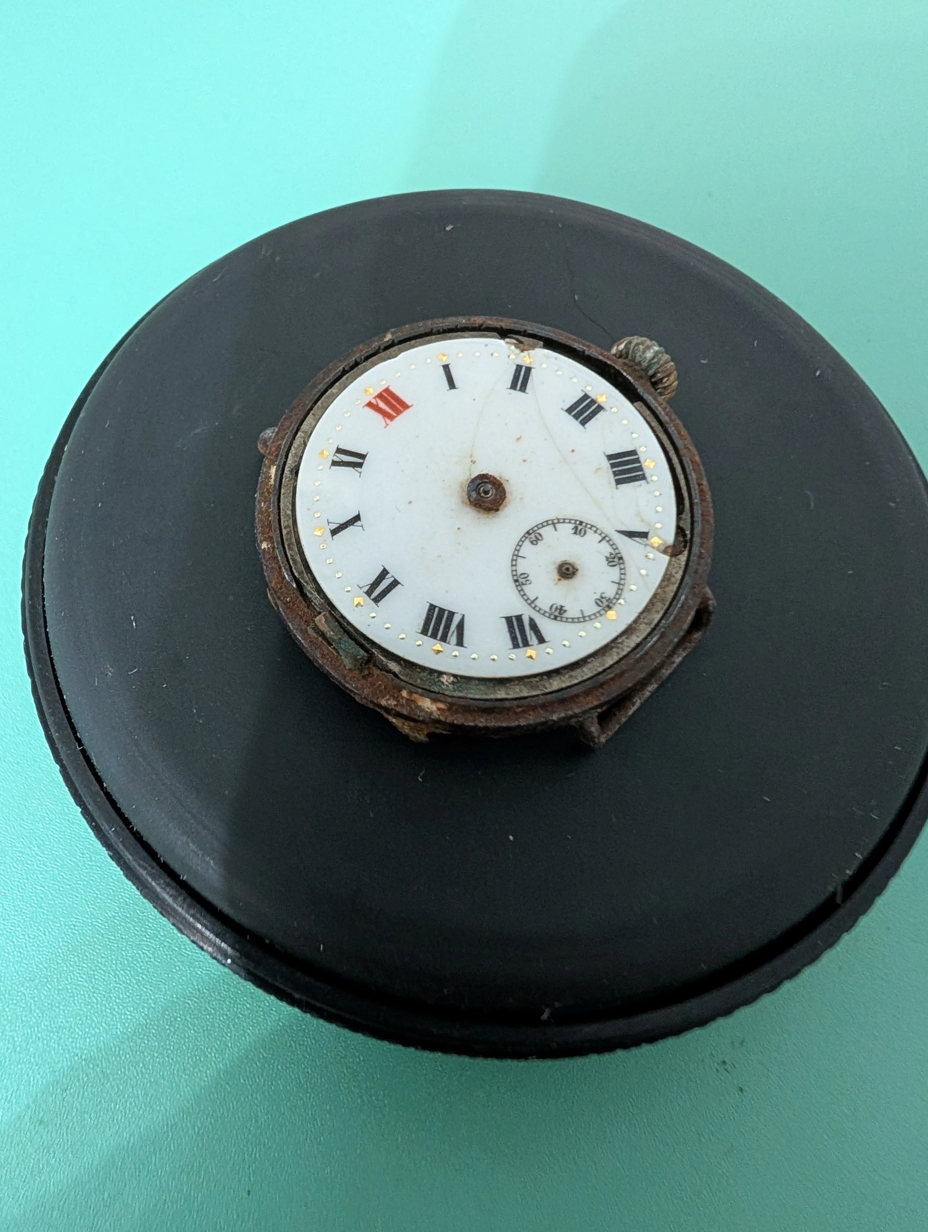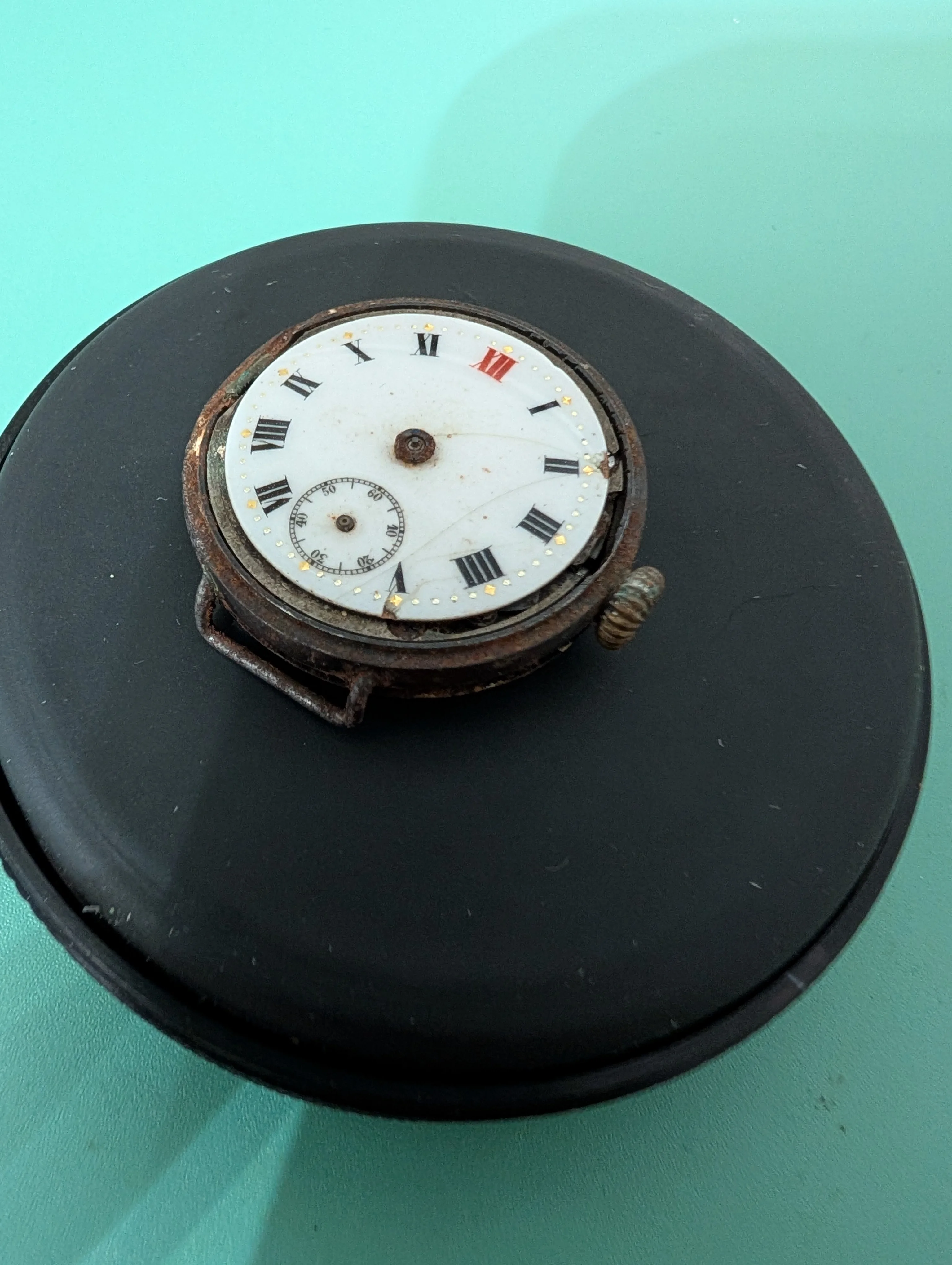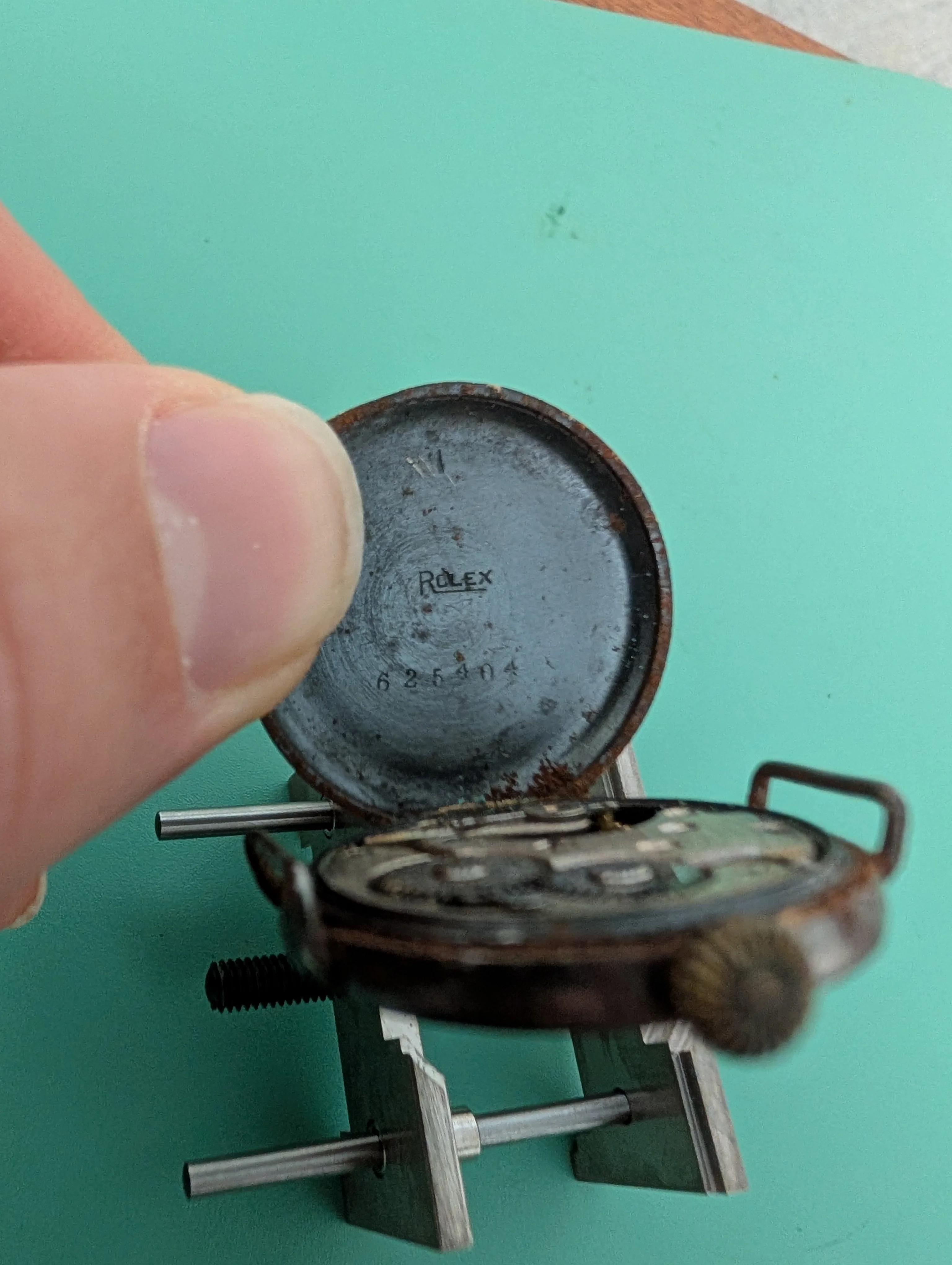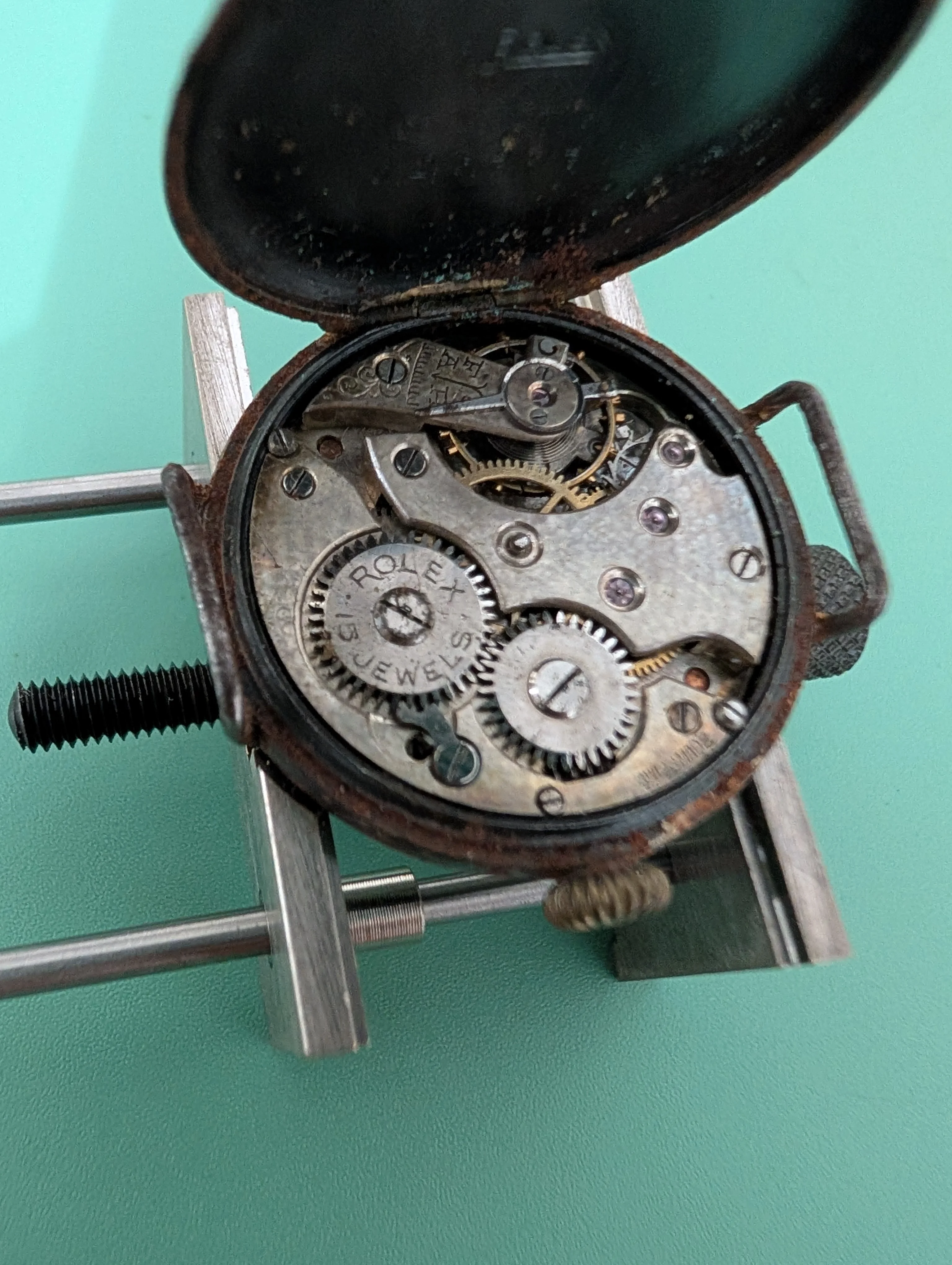 I received what seemed like an old no name watch that would be great for practice. Upon getting it open, I discovered its actually an old antique Rolex (some searching seems to indicate ~1920's WWI watch). Certainly a splendind surprise! But now I've paused to reassess how to approach and would really appreciate some advice!