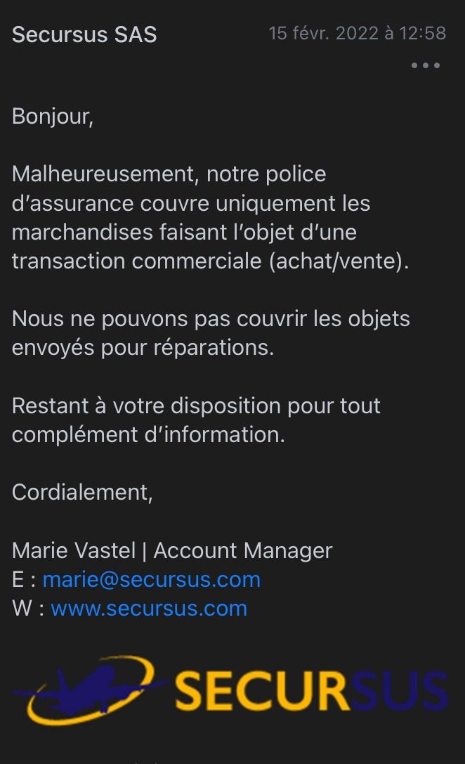 Take a look at the policy as opposed to relying on the word of the Secursus representative. It only seems logical that you would be insured against loss in shipping regardless of whether it was shipped for purpose of sale or repair. You may even consider filing a claim to start the process. If they deny coverage, you should at least get back the premium you paid which was likely not an insignificant amount. That would be a small consolation, but at least it would be something.