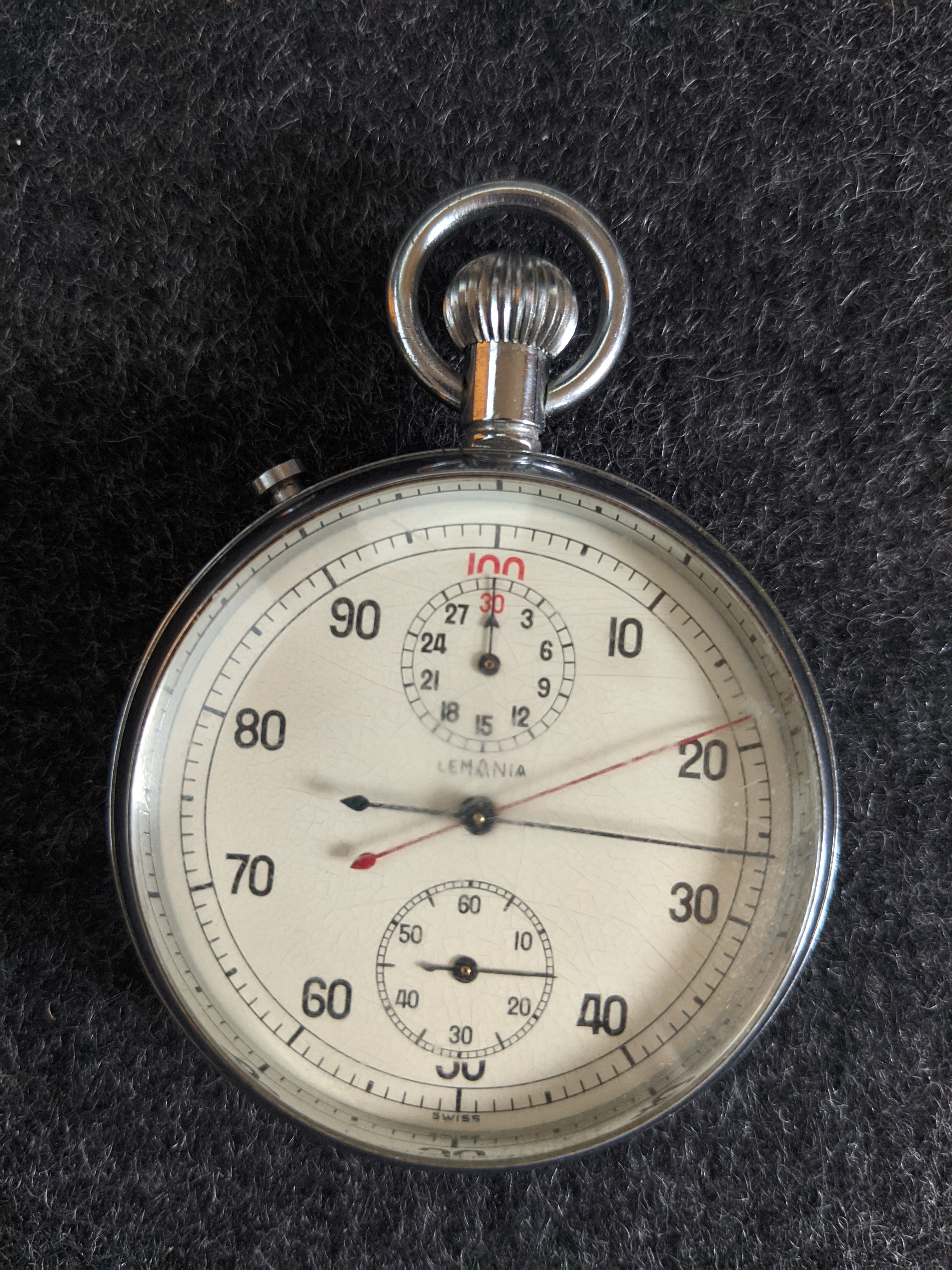 My grandpa passed away nearly two years ago and when helping my father emptying his home, I acquired his toolbox. Recently when digging through it I came upon this Lemania stopwatch, with three dials. A 100 second main dial, a 60 second dial below and a what I believe to be a lap-counter above. I would really like to find out more about this.