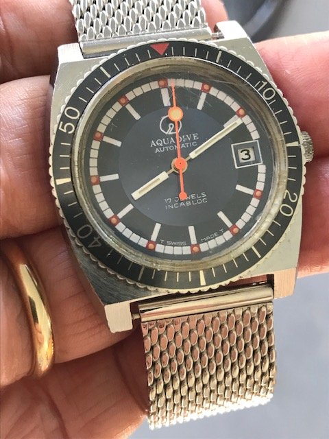 First is the vintage Aquadive. Runs like a champ and the bezel is super nice with no damage to the paint and numbers. Acrylic crystal could use a polishing but that's all. Any scratches are not on the dial, just on the acrylic. The two-toned blue dial is without damage or fading, and looks super clean,as well as the hands. Nice long mesh bracelet we mounted on it will fit most wrists. The dial is bright and colorful and a real eye-catcher!