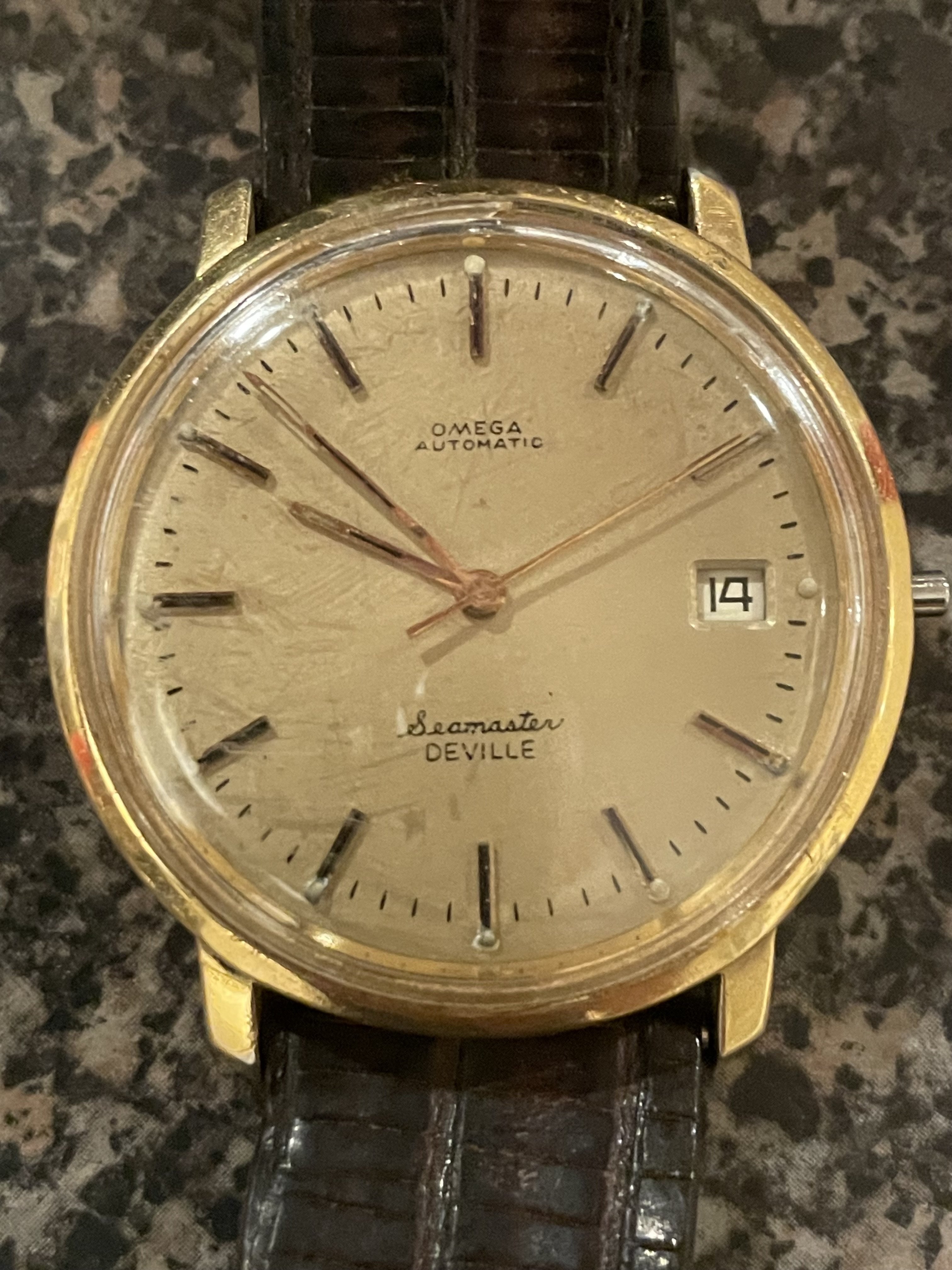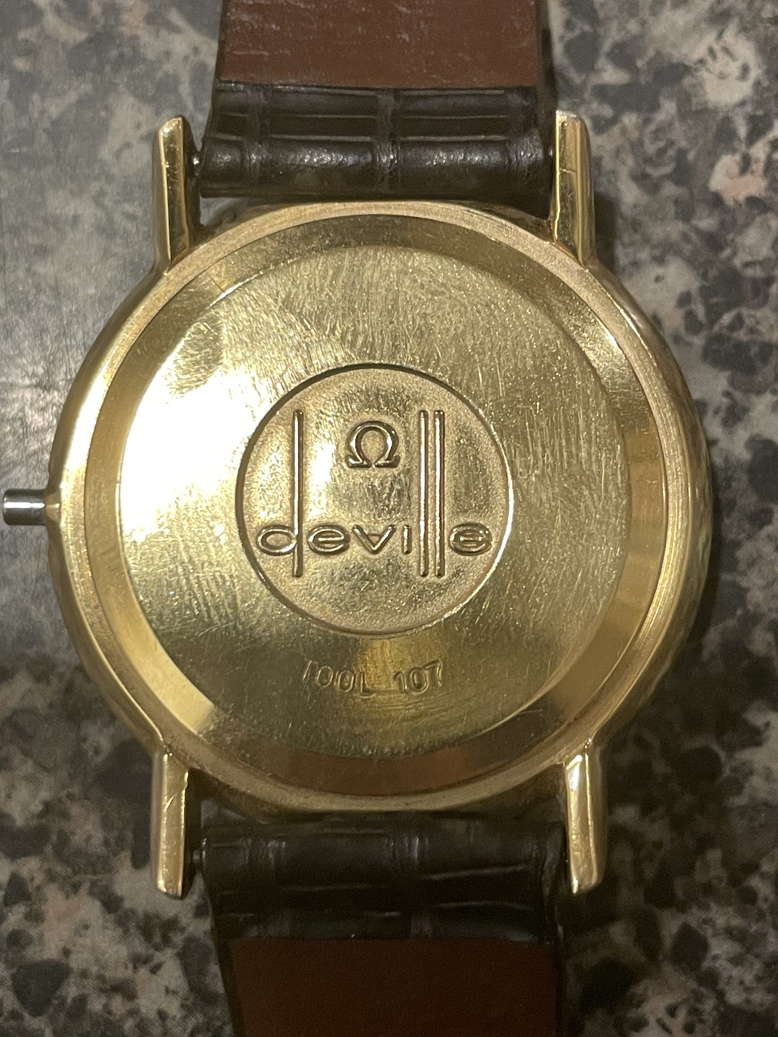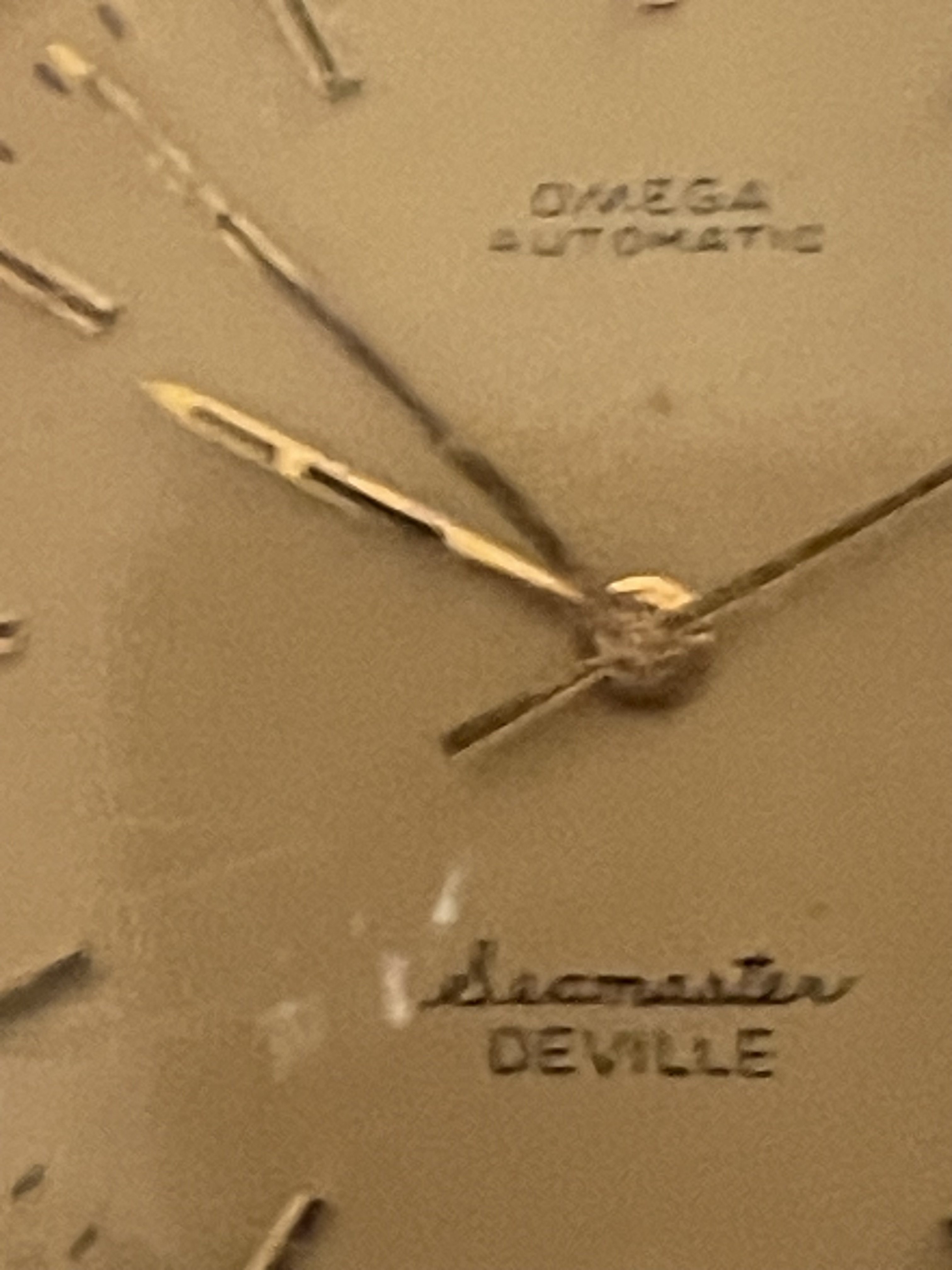 ·I recently inherited my father’s watch and I’m looking for any information on it (date, model, anything). I believe, but am not certain, that it was purchased in Singapore in the mid-70’s. Note the missing Omega logo on the dial, the odd font for “Omega”, the unusual script S in “Seamaster”, and the “deville” on the back of the case. The band isn’t original. I’d love to get a new stem, get it serviced and cleaned up, find a band that is similar to the original, and wear it myself. I haven’t seen another Omega Seamaster De Ville like this, but this one ran for nearly 50 years so I’m pretty sure it’s genuine. Can anyone educate me?