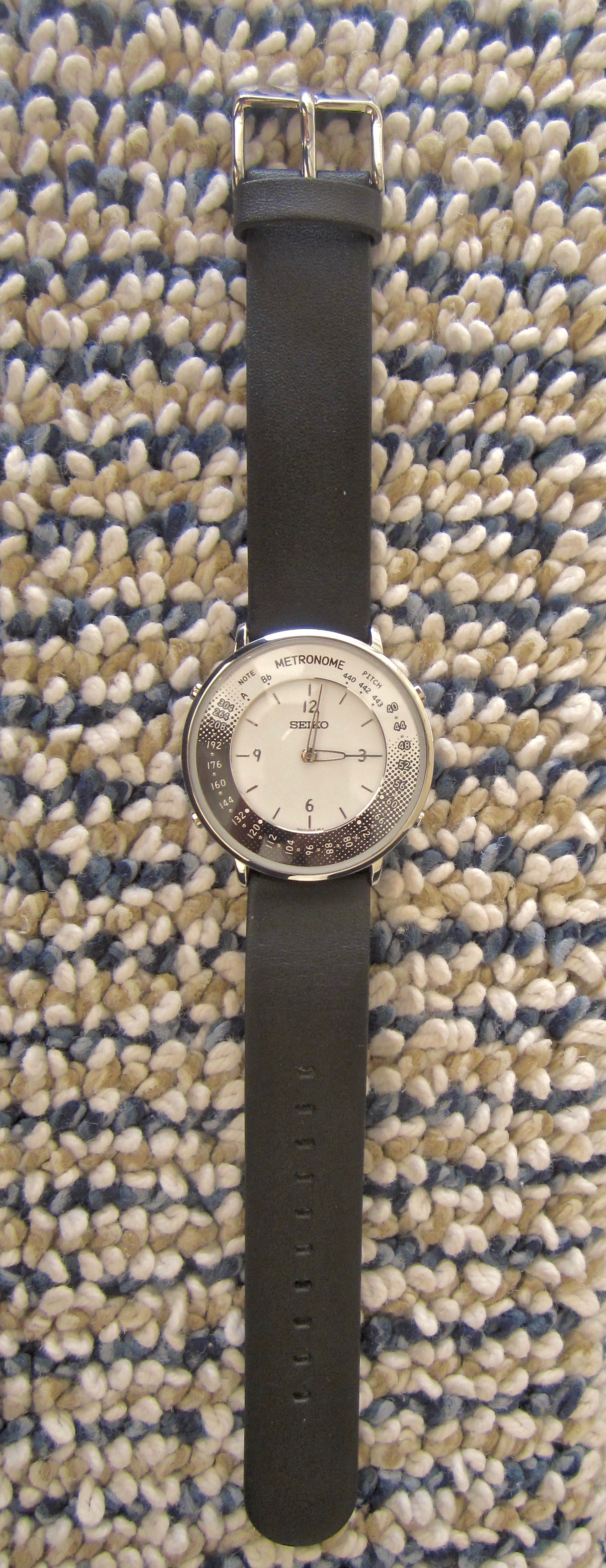 The watch offers time (no second hand), metronome audible, metronome visual, and pitch. Dials can be had in several colors, stainless steel case or gold colored case with brown or black straps.