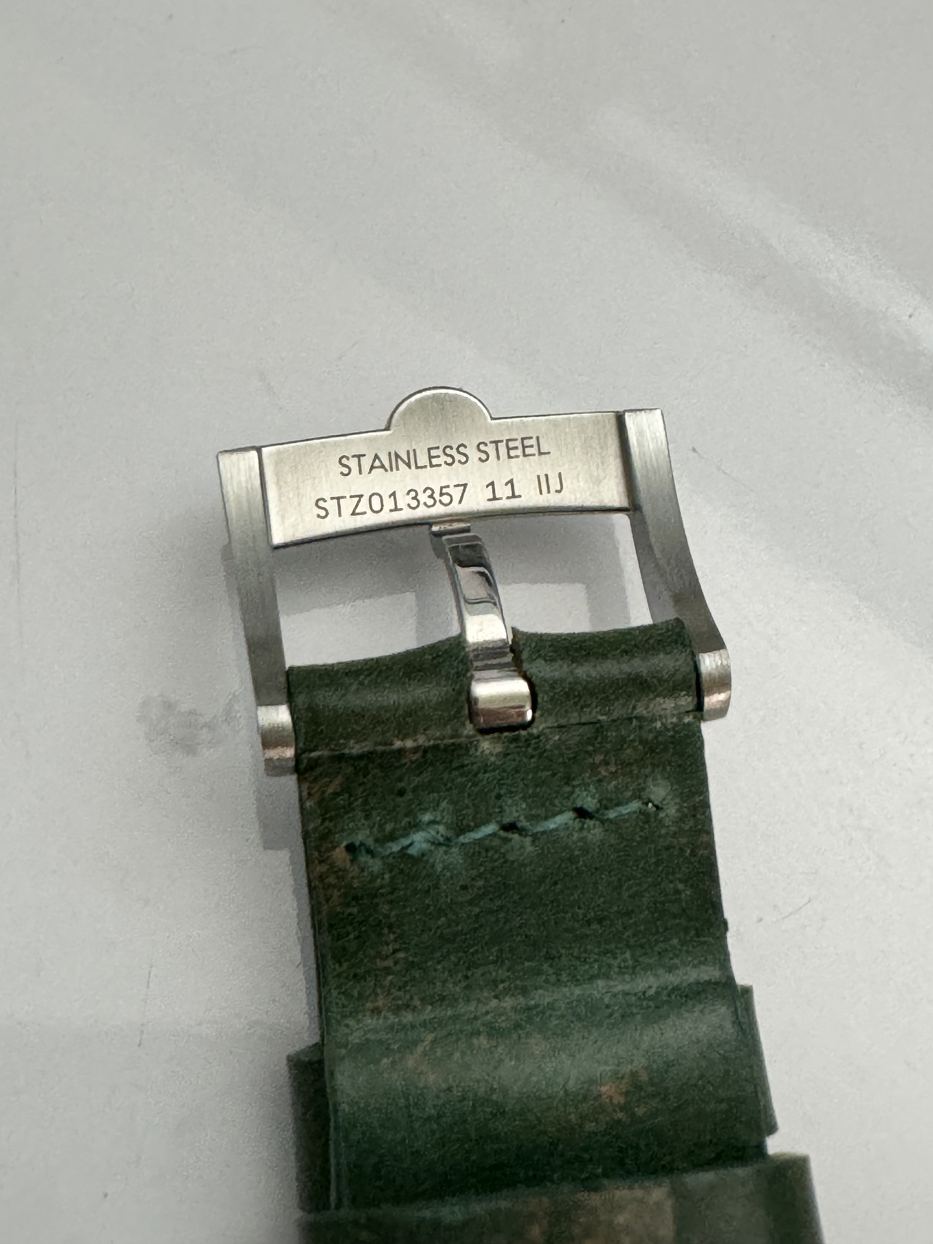 I searched through a couple of sales listings until I found one that showed the back of the buckle. Apparently, it's STZ011747.