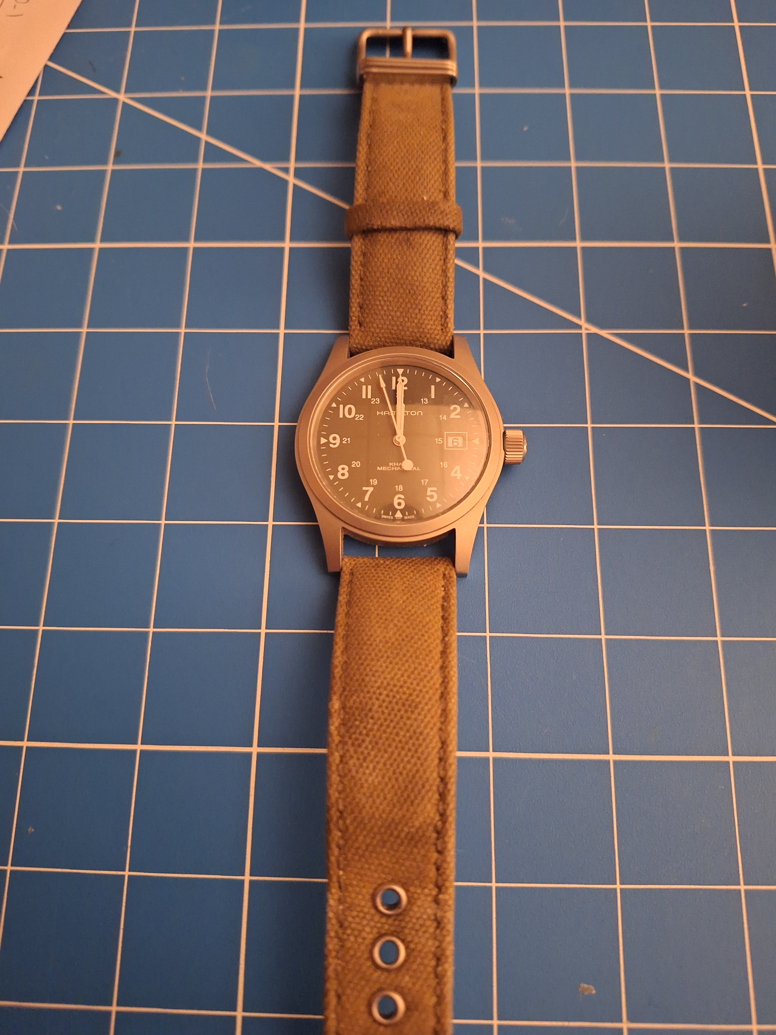 ·Although I have 50 watches and probably wear 15 of them, my Hamilton Khaki is my everyday beater. I've had it for 3 years, and probably wore it 4- 6 months of that time. Though it's a "beater," I treat it very well because that's what I do. I very much like the look of the strap. The canvas however is over a stiff, padded piece of leather. Once it has conformed to your wrist it is somewhat comfortable.