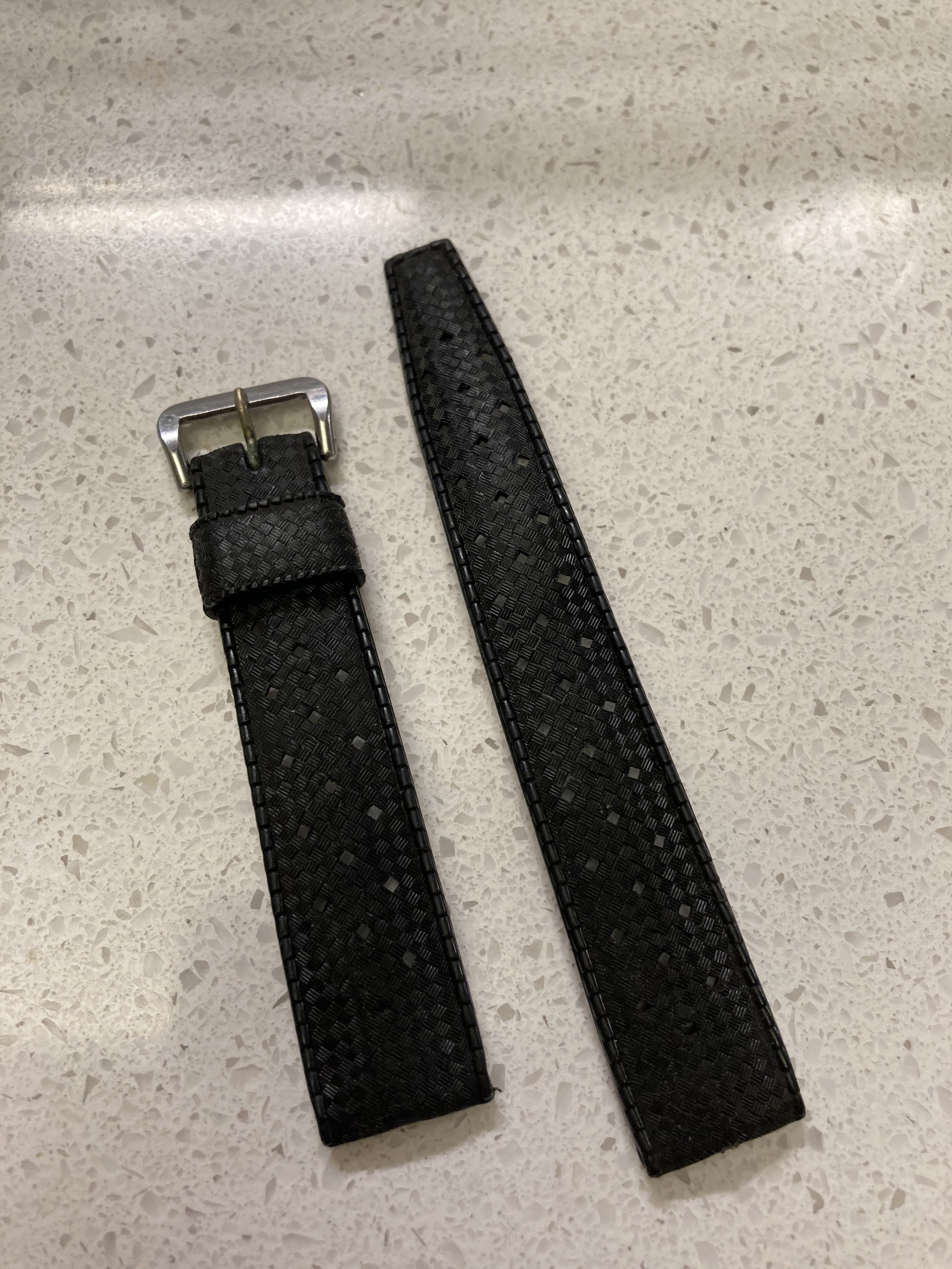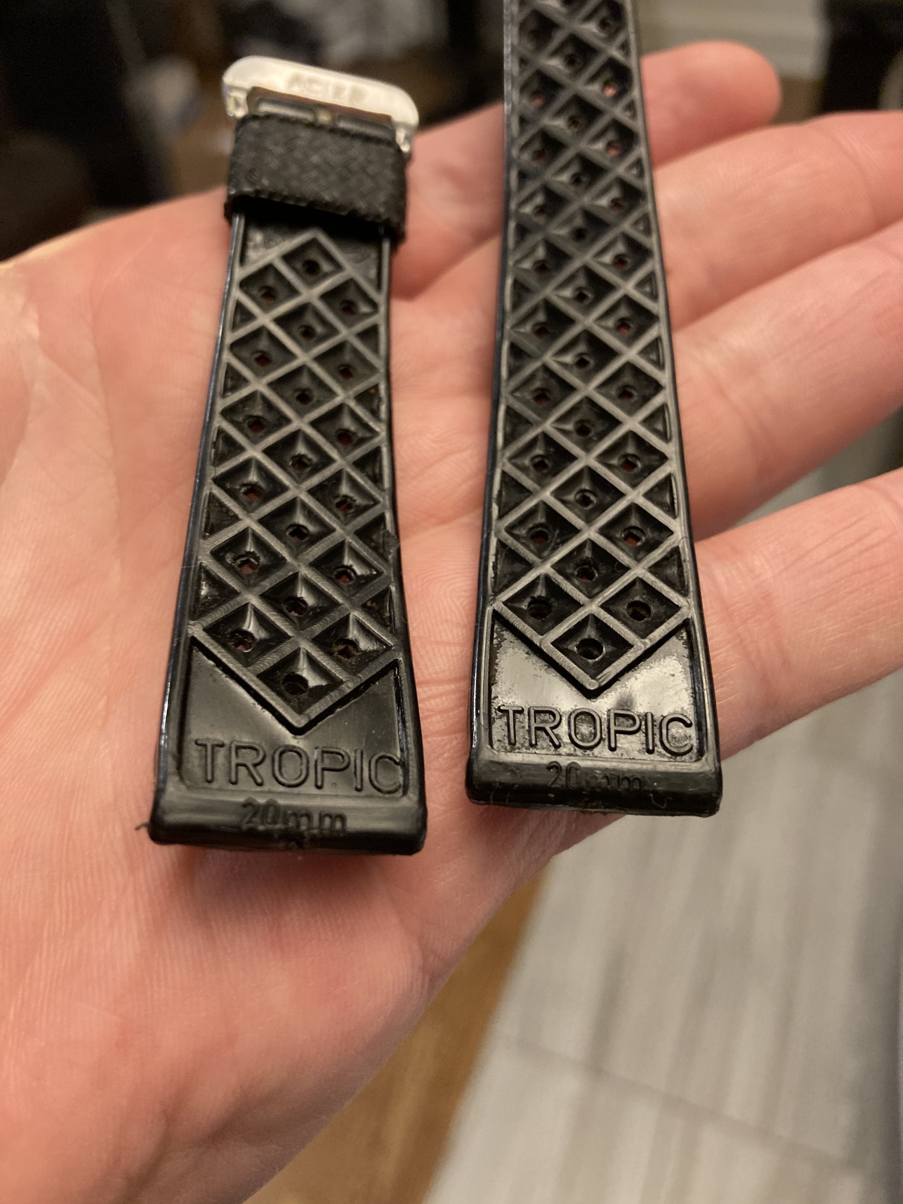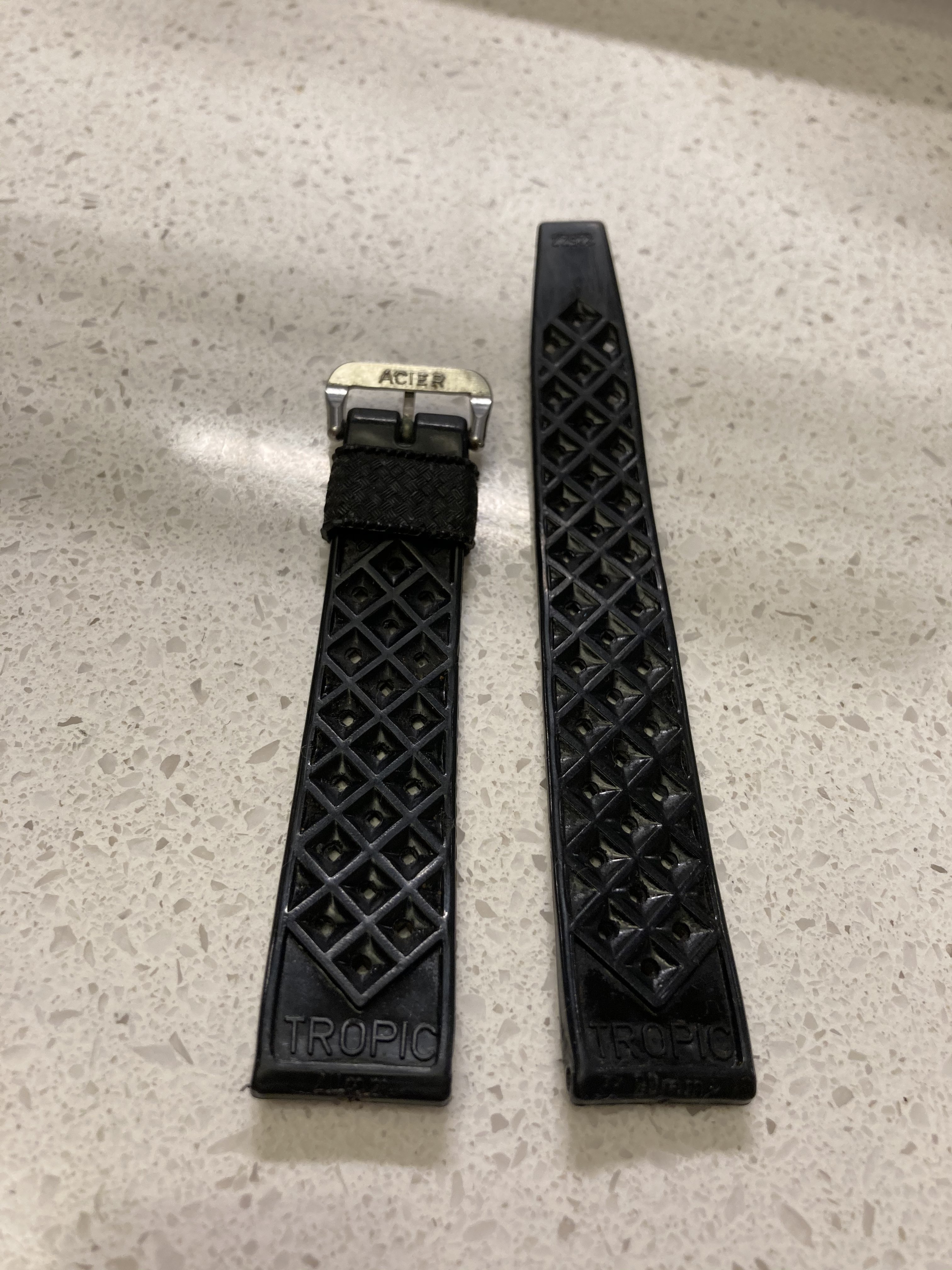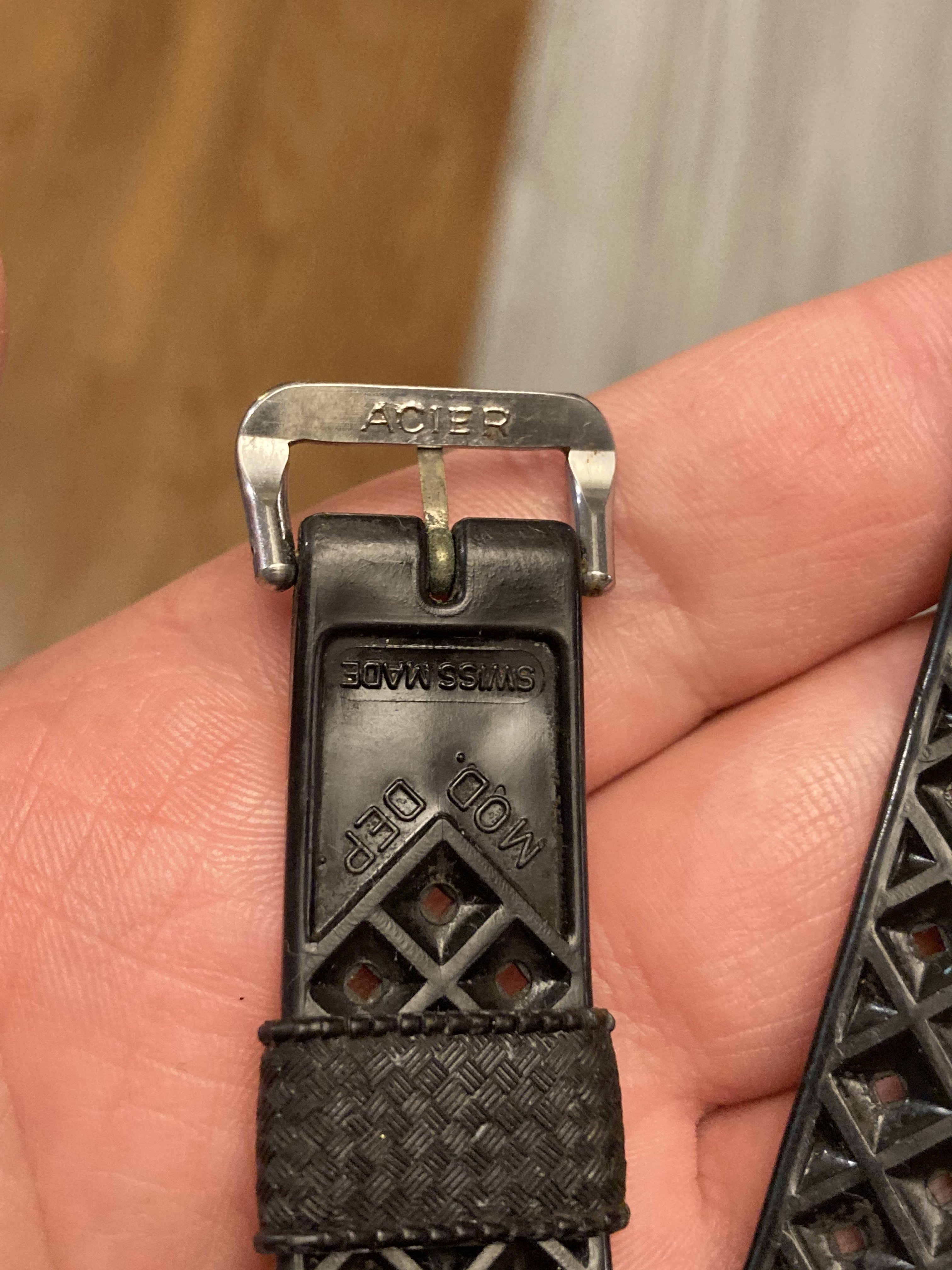 MOD DEP, Swiss Made version with Acier buckle. This version of the Tropic is quite valuable I'm told, and so I think it's better off enjoyed by someone else! These were often spec'd by watch dealers back in the day and were especially popular on Rolex Submariners. This one is in truly excellent condition, very supple and with no tears or breaks, or really much evidence of wear at all. (It did need some cleaning when I got it though, so it definitely has been worn.)