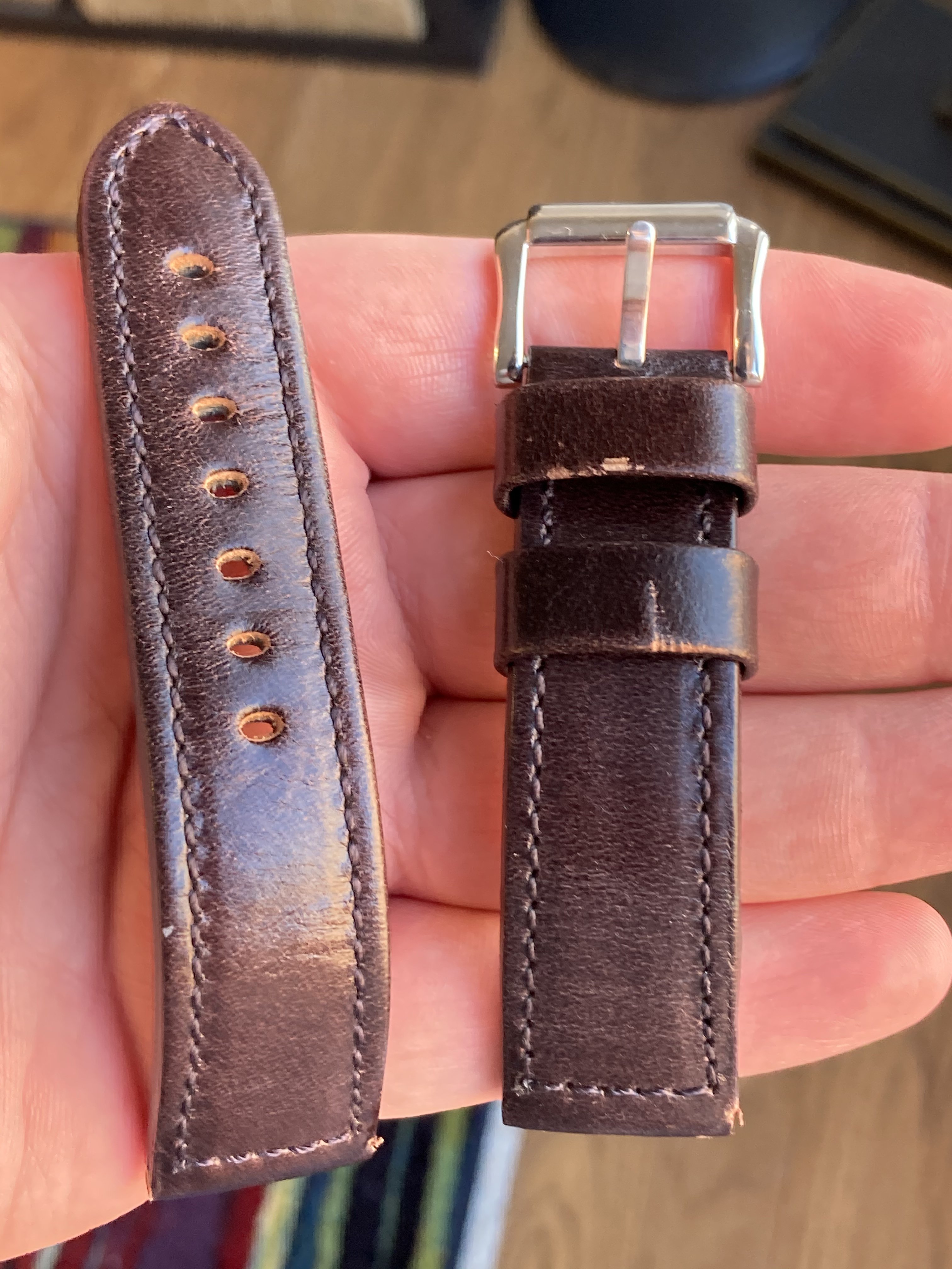 Brown, 22mm, came on a Breitling that I purchased from Antiquorum. Not my style, but apparently these too go for something in the neighborhood of 90€ new and from my limited research seem to be popular with the Panerai crowd? This one looks to have been around for a little while, with some small marks around it and some scratching in the leather on the outside of the keepers but is otherwise in pretty good condition.