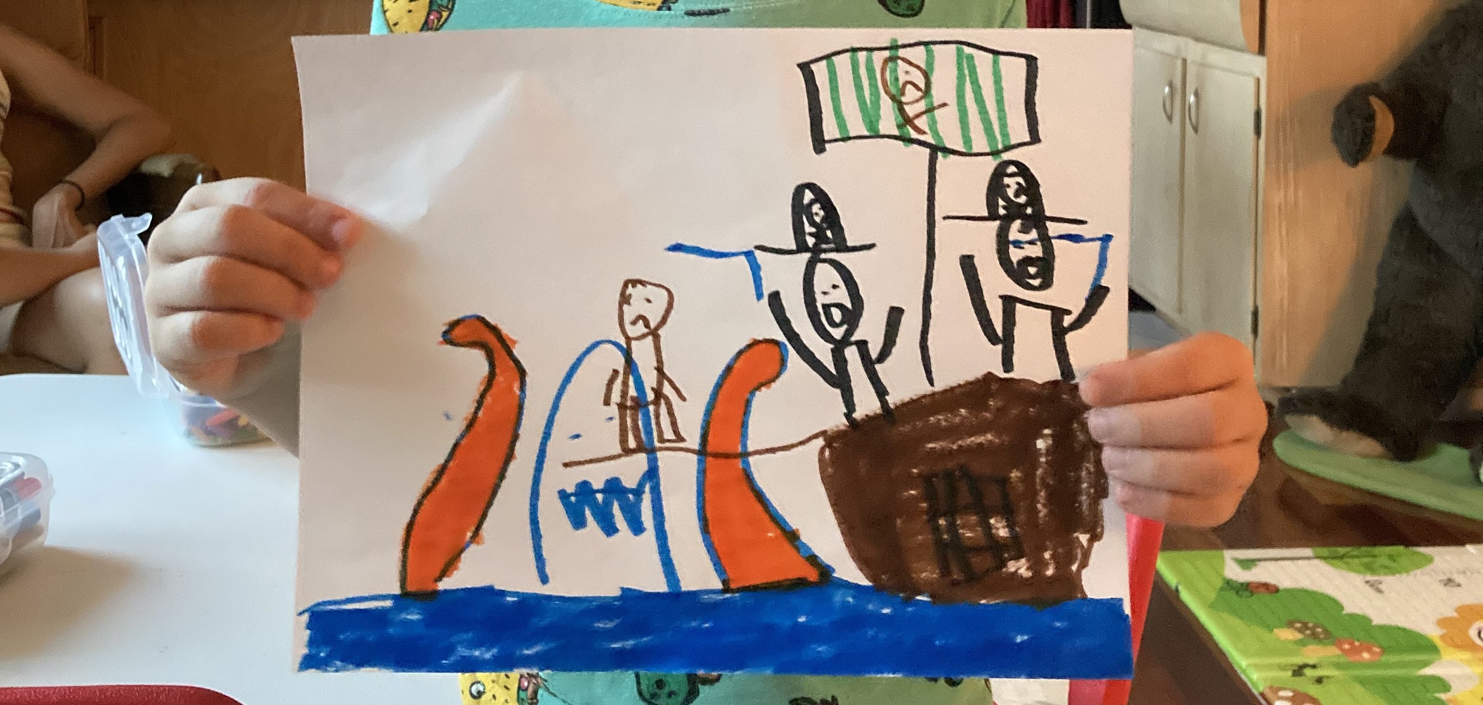 Here's a drawing of a shark and an octopus my son made a couple of months ago, just before his 5th birthday. I just realized today that (I think) that's a treasure chest behind the shark. This is one of his better drawings, and I love it. It resembles to me a picture an adult would draw when trying to emulate a child's drawing.