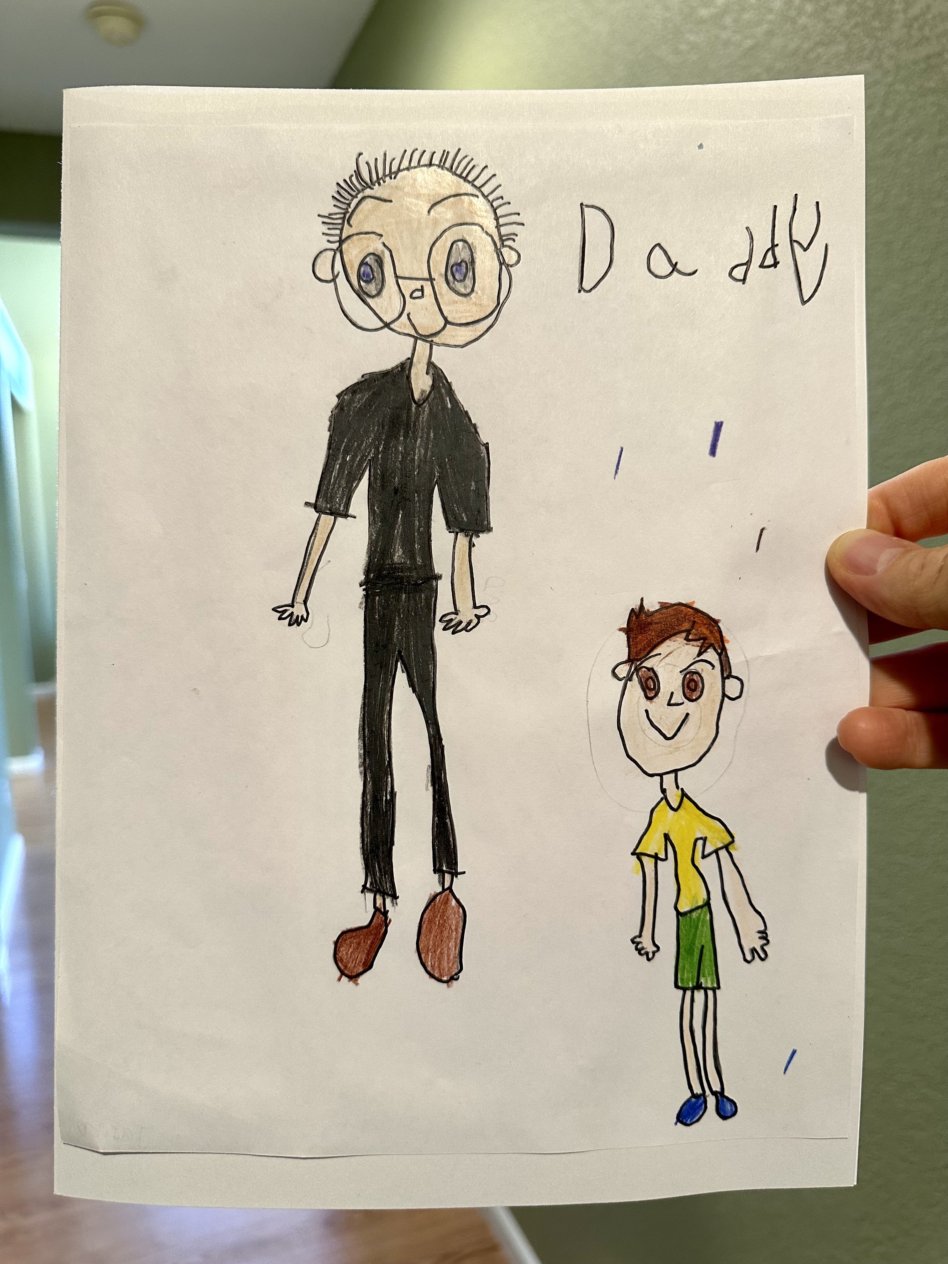 Around the same time he got mad at me one evening (for being a responsible dad, as usual), stormed off yelling that he didn't want me anymore, and came back later with a stick figure drawing of me with a big X over it. I got a little upset with him for that, which I soon regretted and apologized for. That drawing isn't on display like this one, but it's filed away somewhere safe.