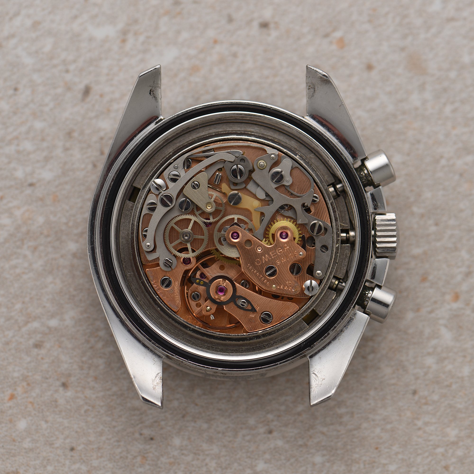 Movement: Omega Cal 861 running great and all chrono functions work. There is no service history. I strongly believe that this watch has never been serviced evident by the lack of any watchmaker's mark on the caseback and no signs of movement screws to have ever been turned.