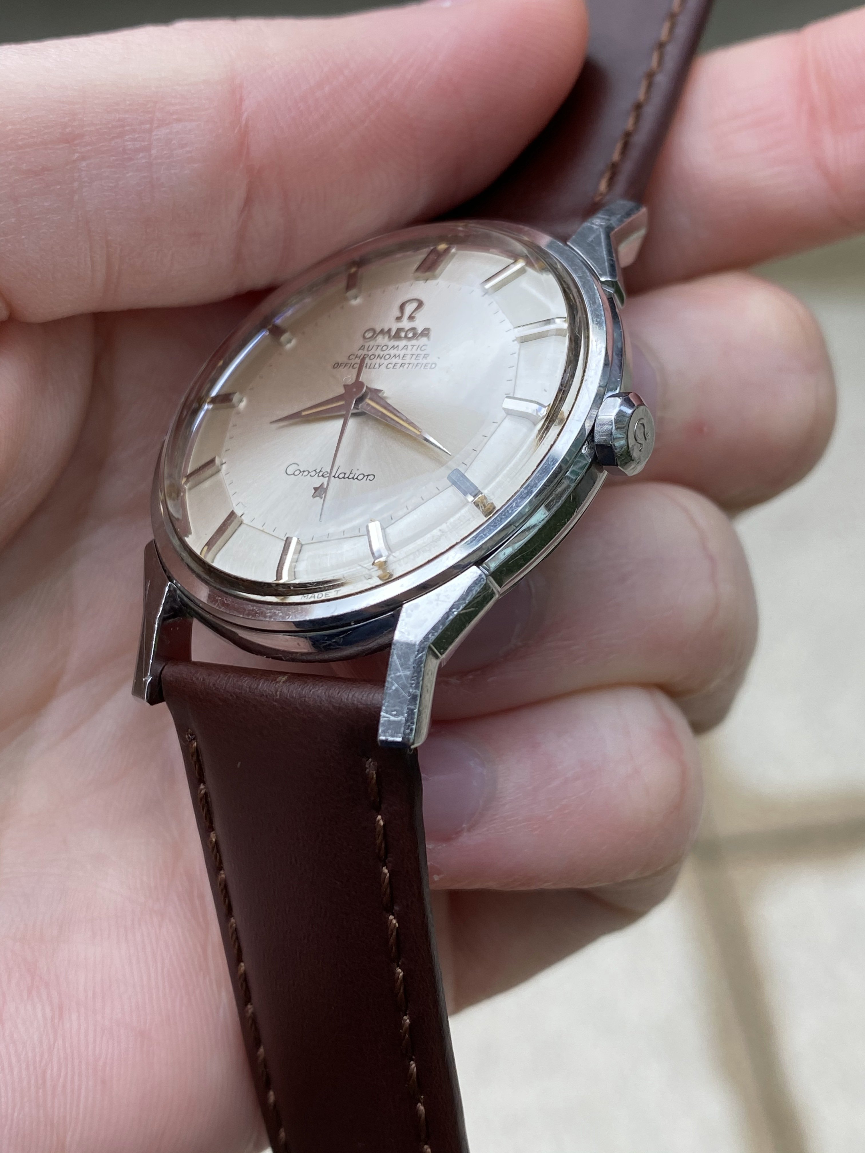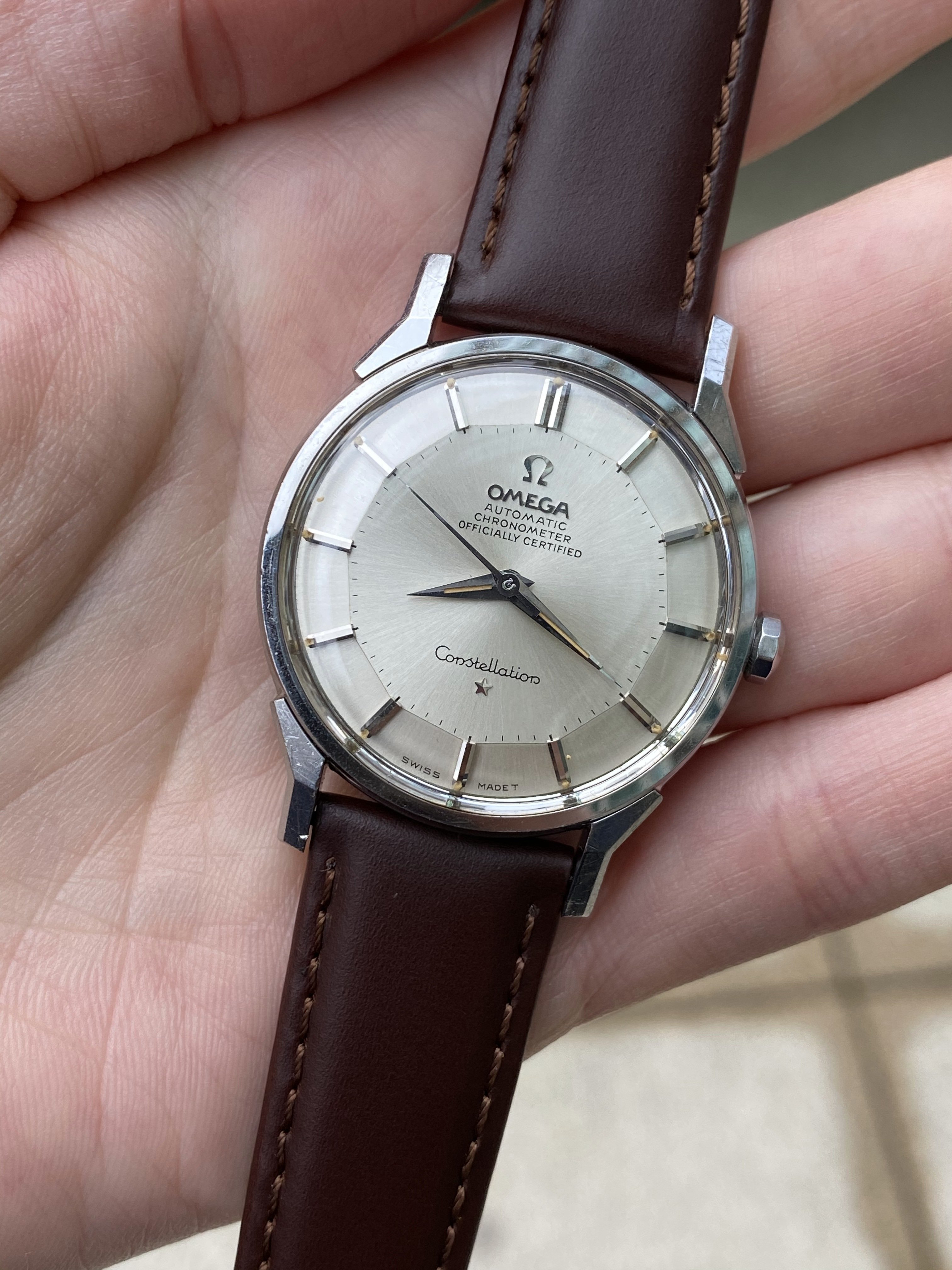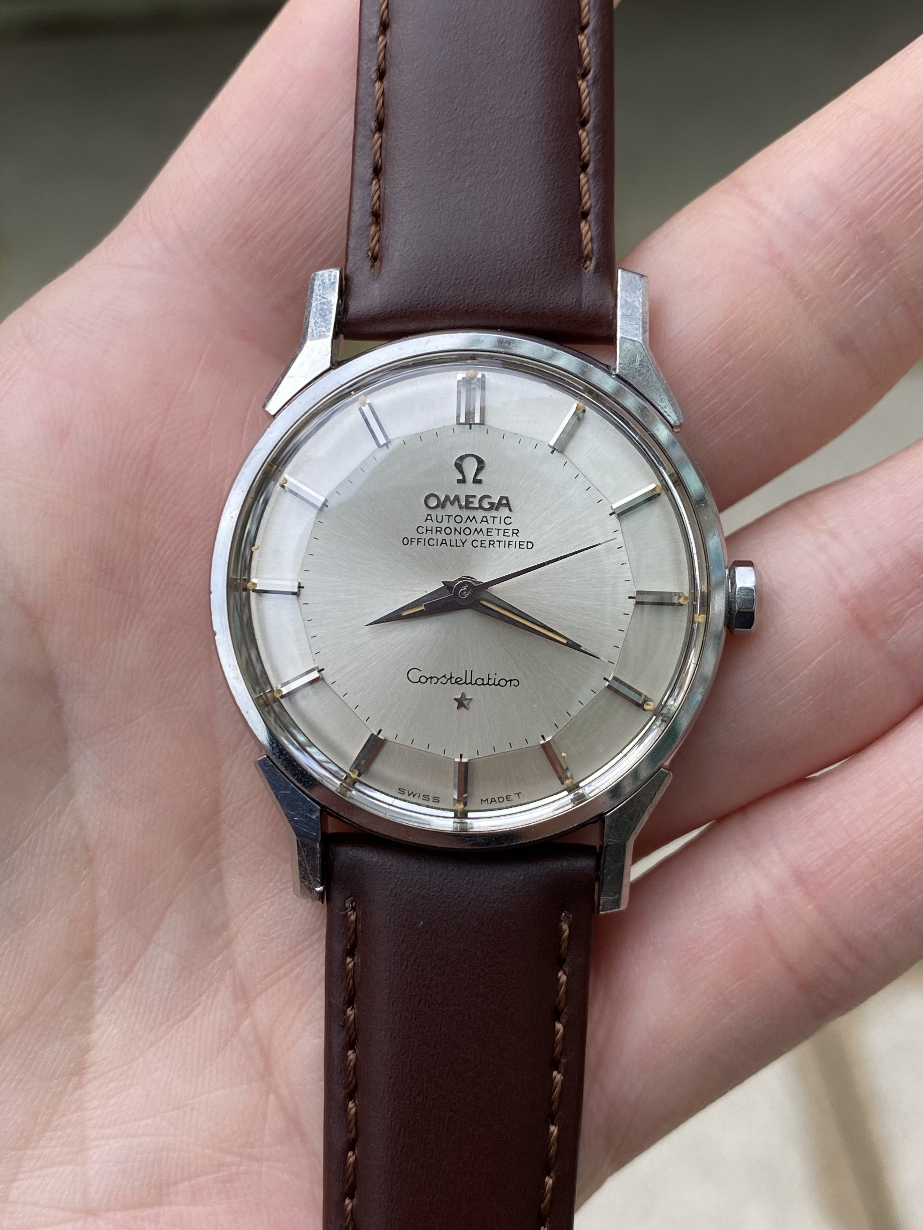 ·Up for sale is an absolutely beautiful 167.005 reference dog leg pie pan Constellation. The dial is almost perfect and the lume has developed a beautiful, consistent color. The case is razor sharp with very well defined bezels on the lugs. The movement runs, winds, and sets okay, but it could use a service. Overall, this is a real collector quality piece that is getting more and more difficult to find.