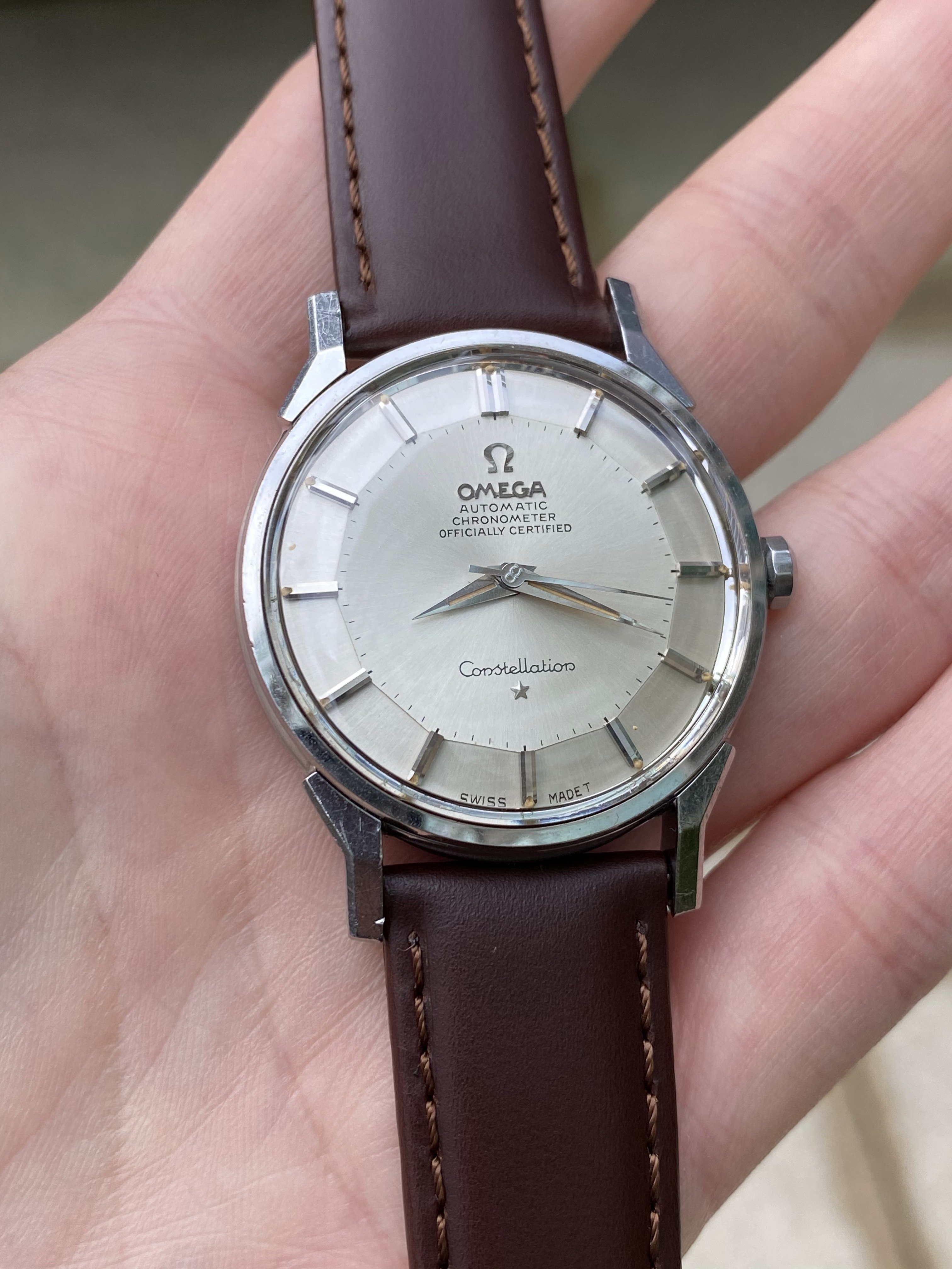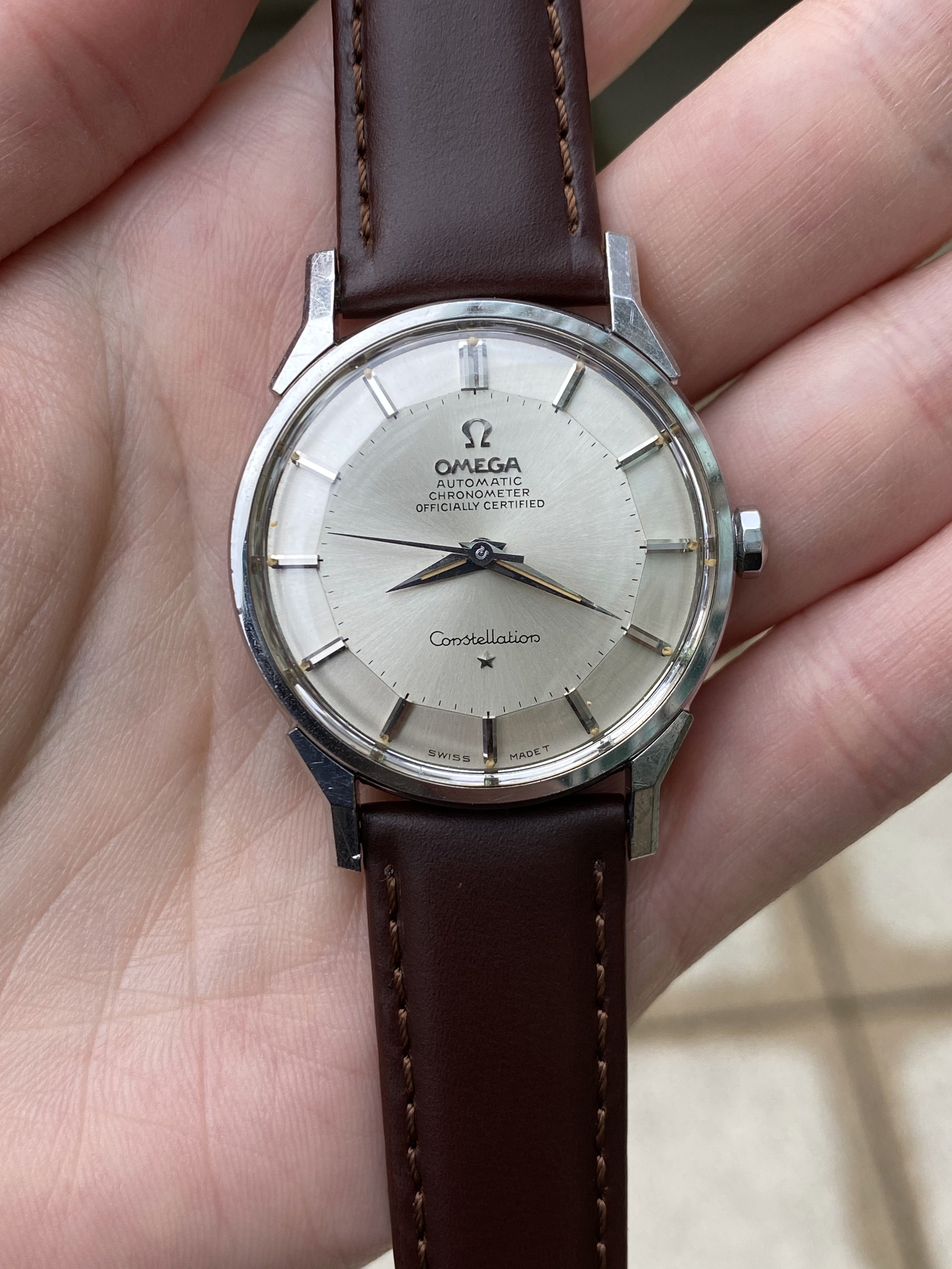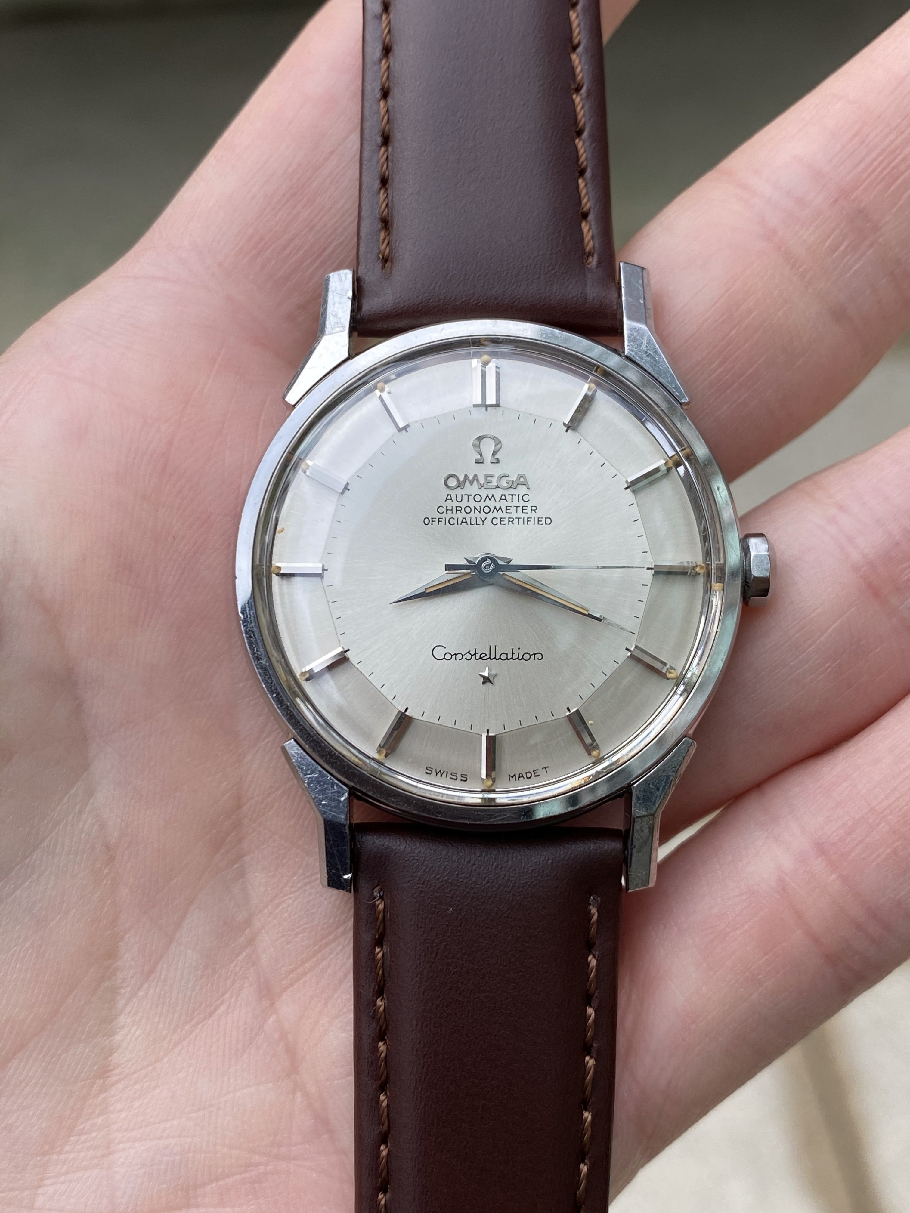 ·Up for sale is an absolutely beautiful 167.005 reference dog leg pie pan Constellation. The dial is almost perfect and the lume has developed a beautiful, consistent color. The case is razor sharp with very well defined bezels on the lugs. The movement runs, winds, and sets okay, but it could use a service. Overall, this is a real collector quality piece that is getting more and more difficult to find.